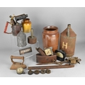 A Collection of Vintage Items to Comprise Burner, Copper 'Surgery' Sign, Stoneware Jars, Oil Can Caps, Wood Plane, Car Meters etc