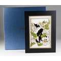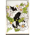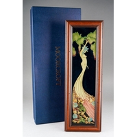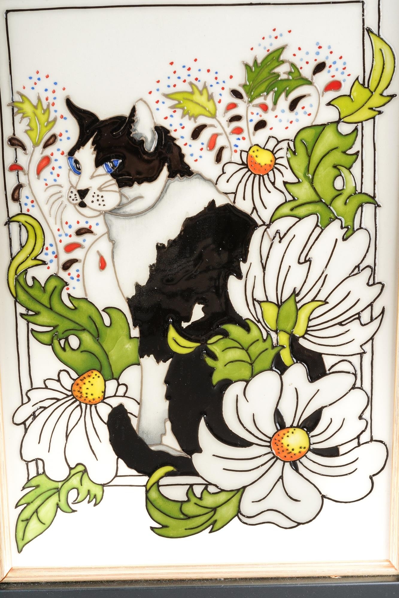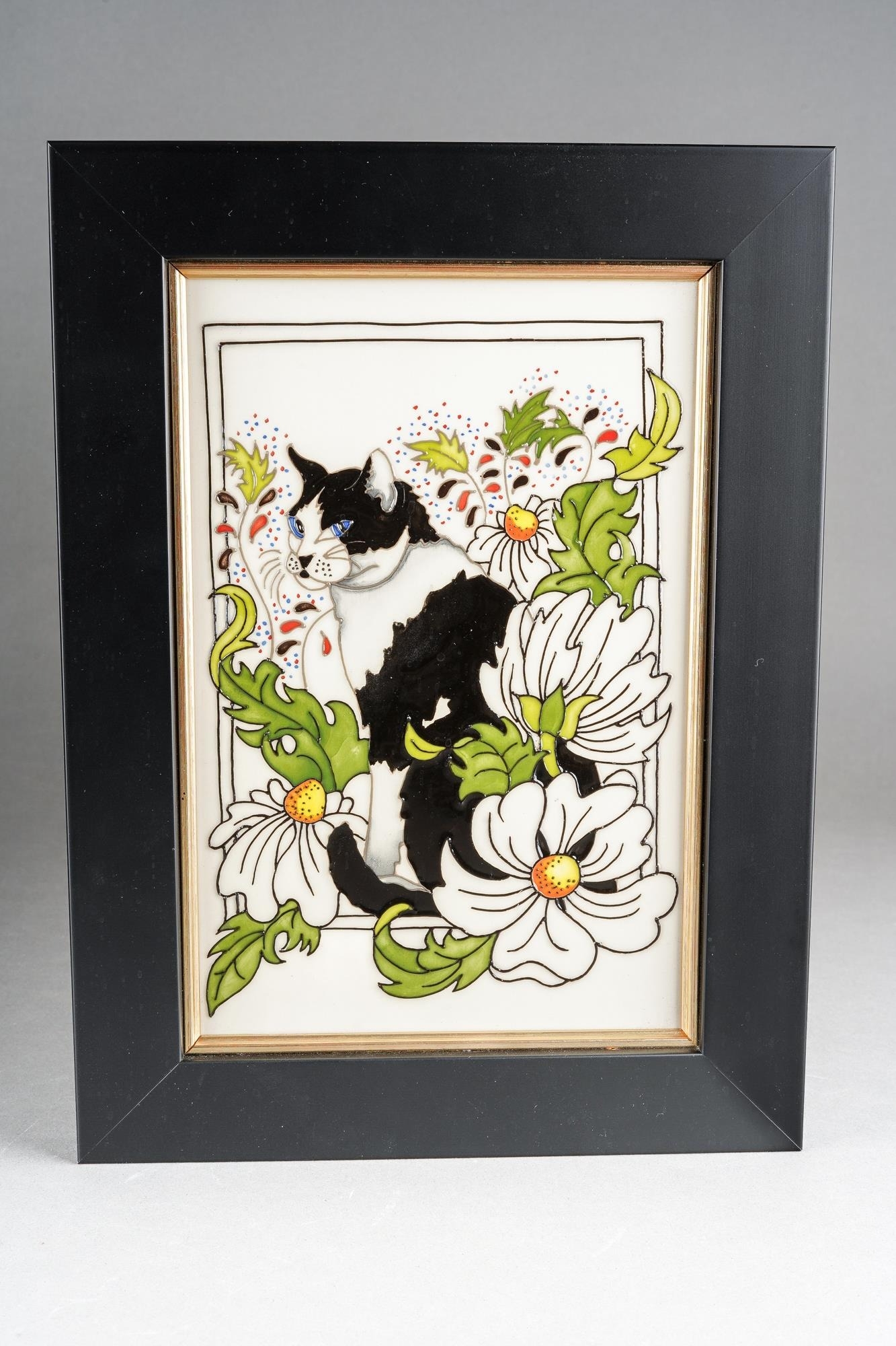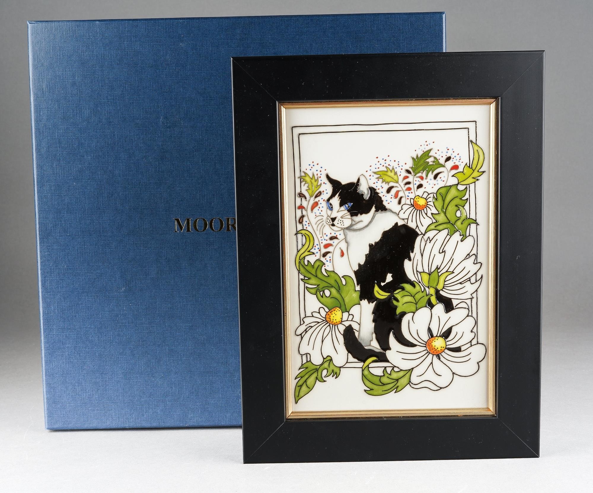 A Moorcroft Daisy the Cat plaque, designed by Rachel Bishop, incised 2017 date cypher, painted and printed mark, the plaque approx 21 x 13.5cm, framed, boxed [1]