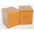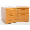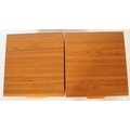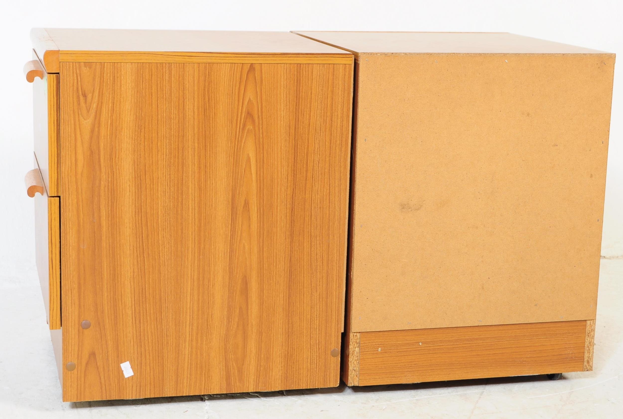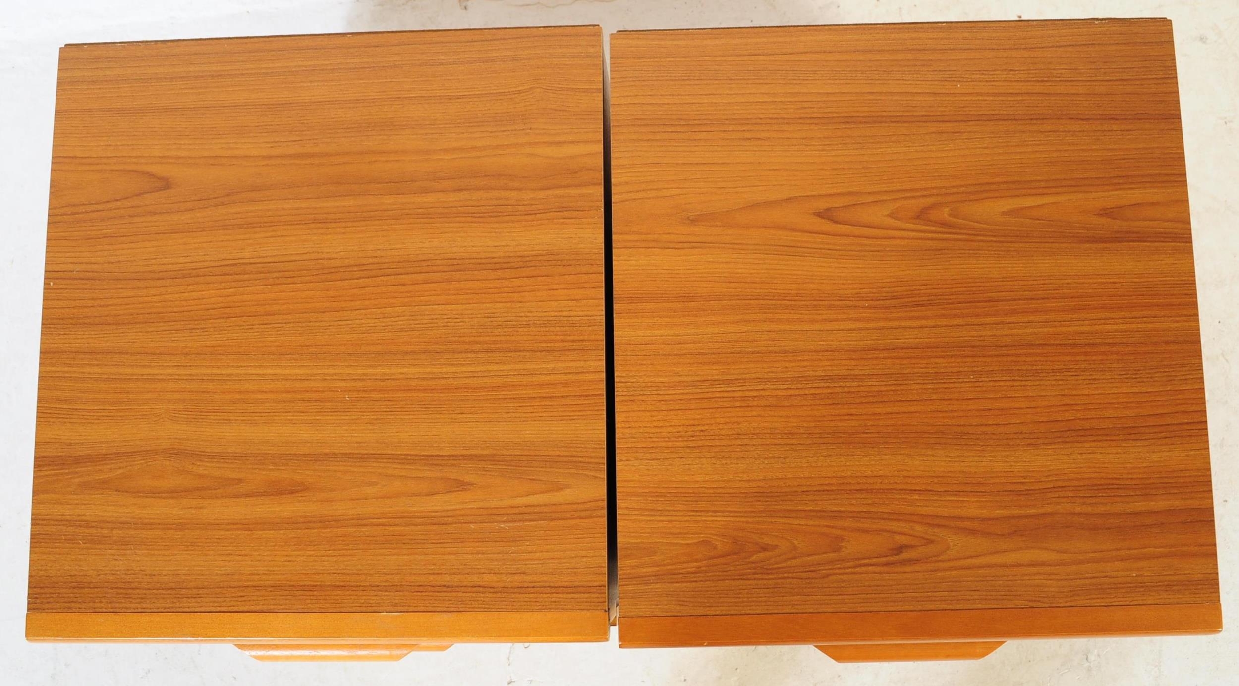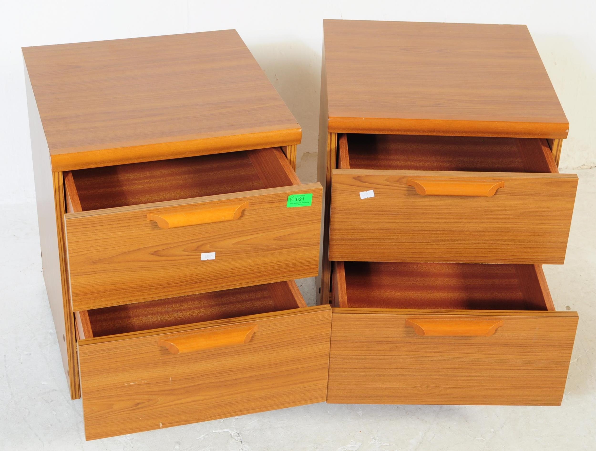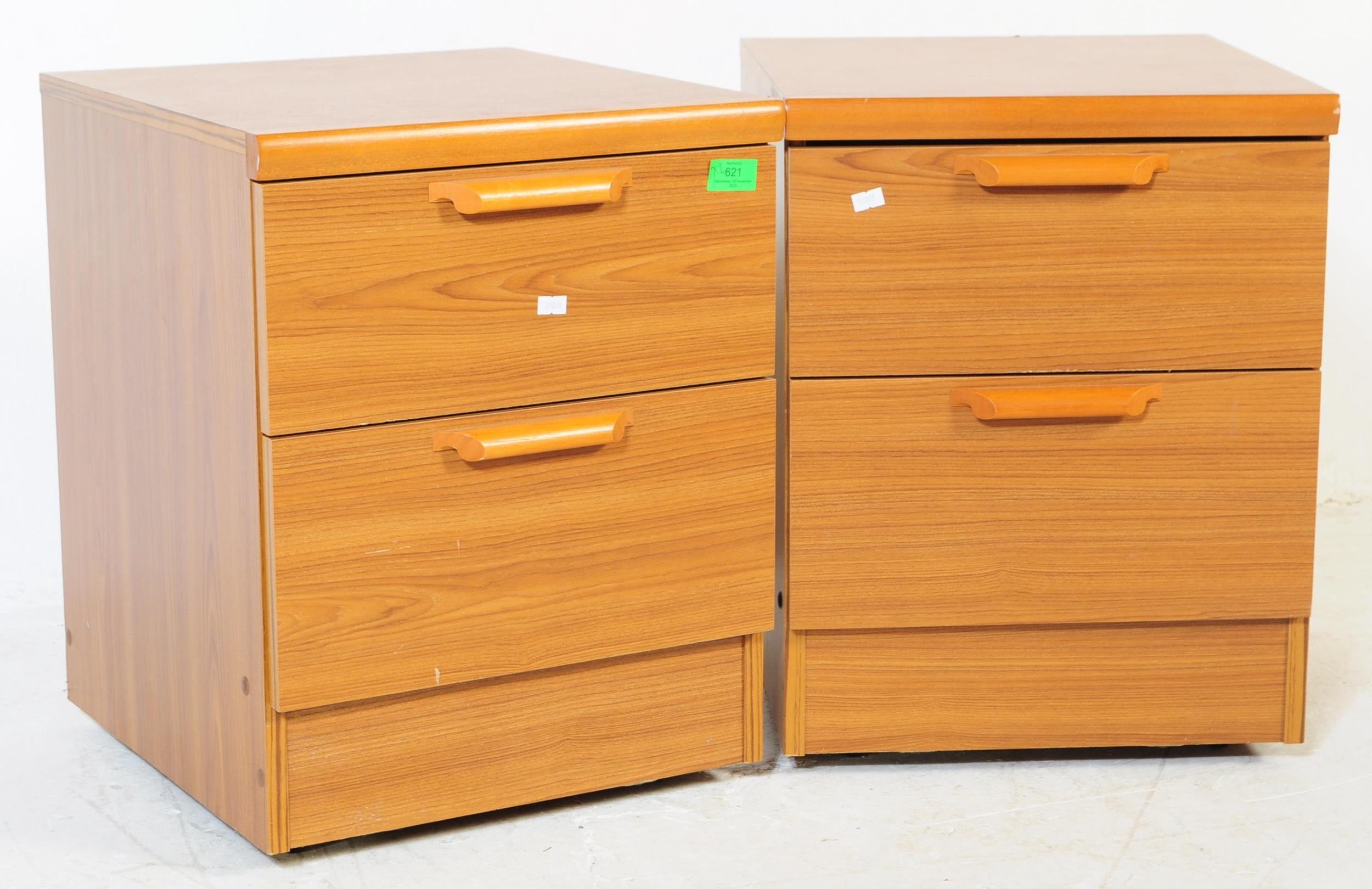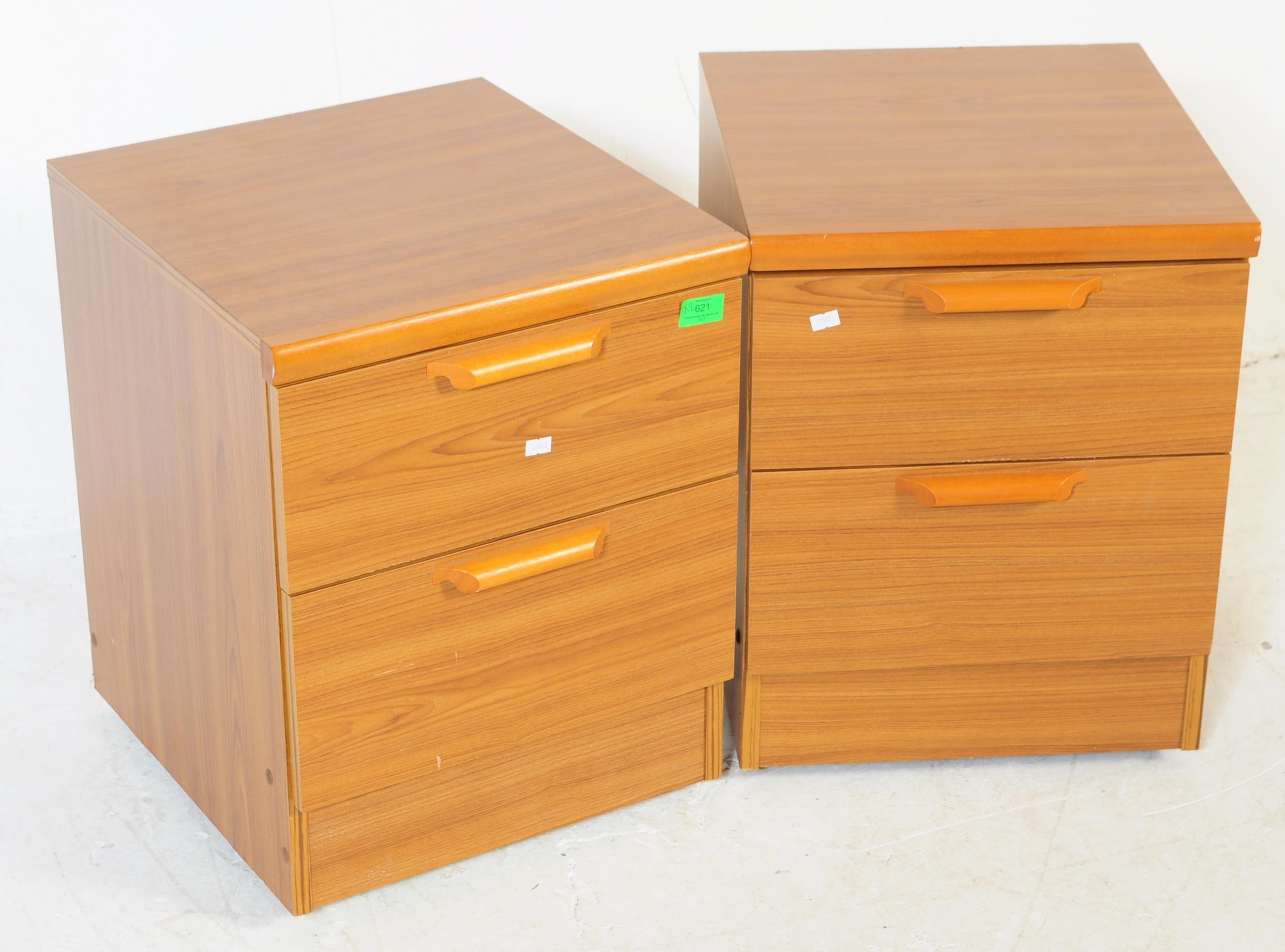 British Modern Design - A pair of retro mid 20th century teak bedside cabinets. Each having a bank of two drawers with lipped handles raised over plinth bases. G Plan Fresco style.