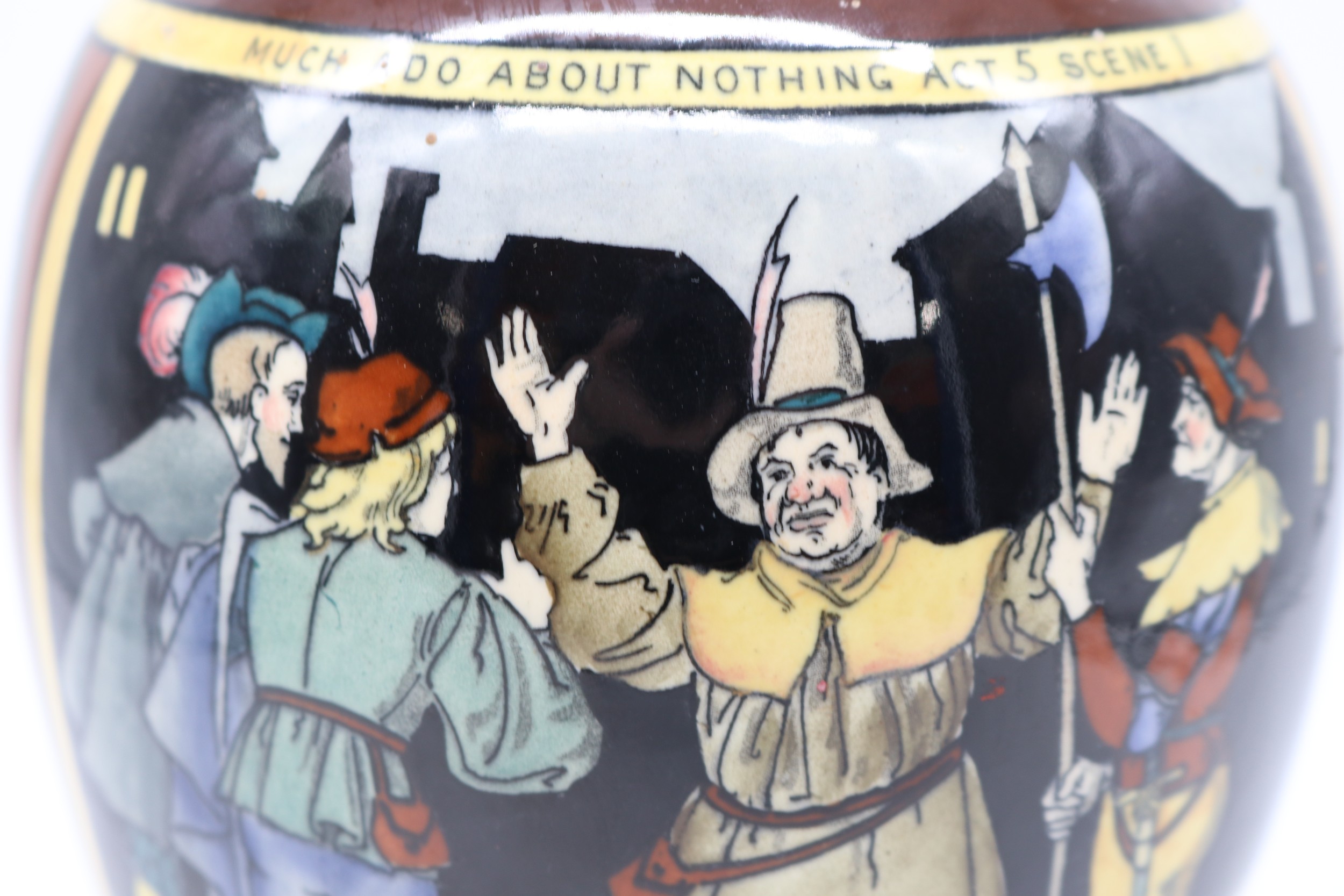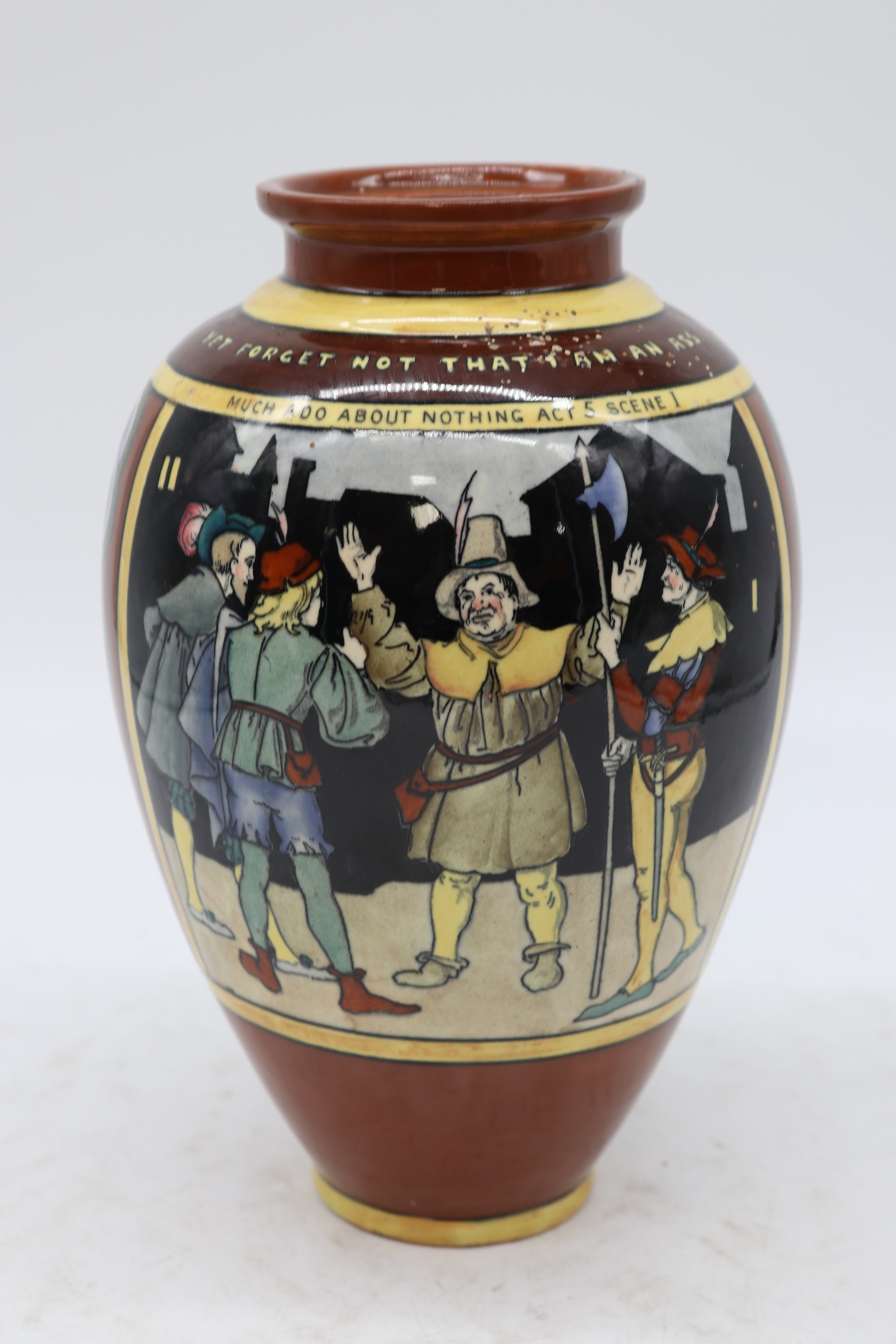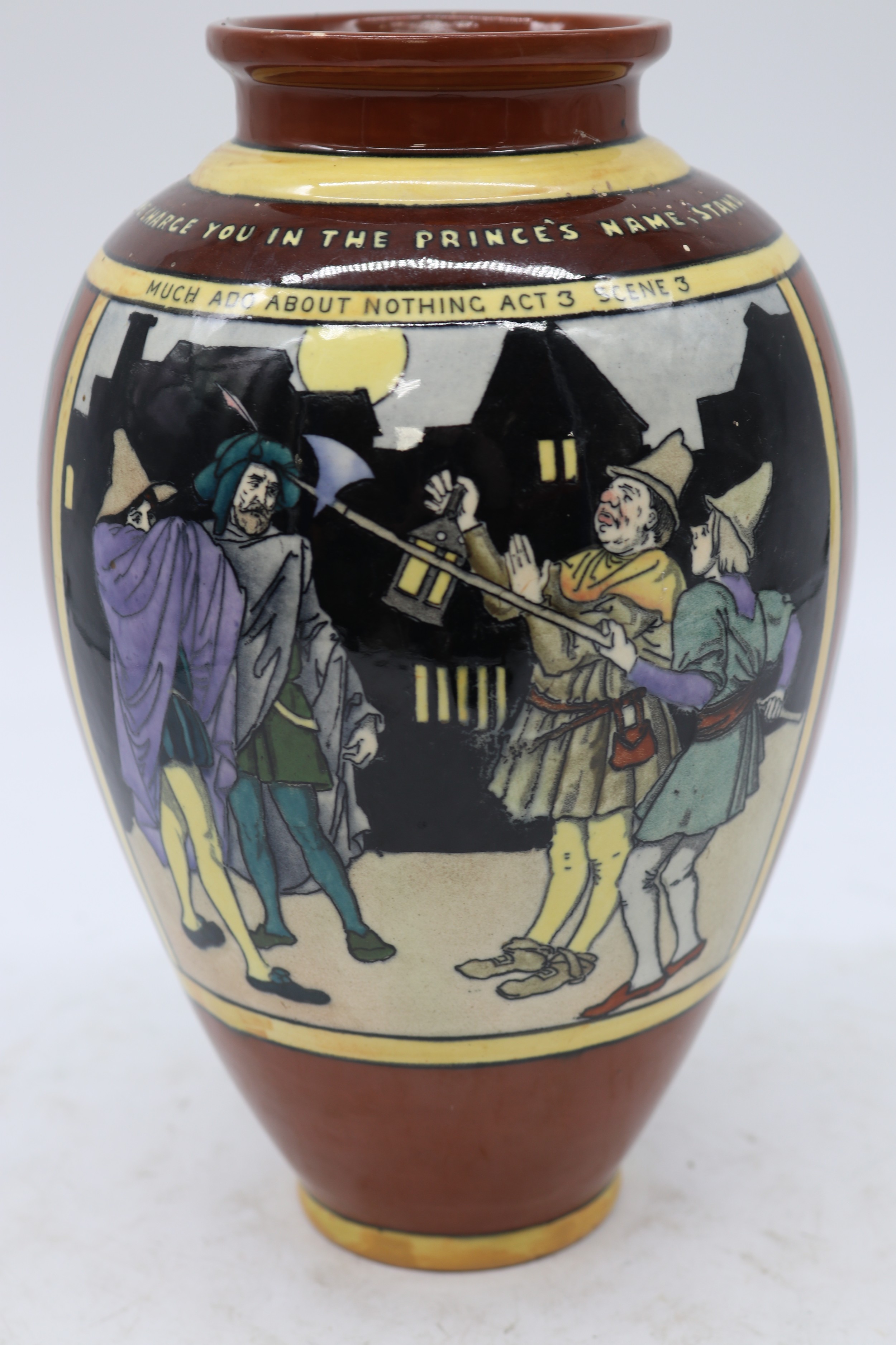 The Foley Intarsio vase 'Much Ado About Nothing' two panels showing Act 3 Scene 3 and Act 5 Scene 1, baluster form, H23.5cm