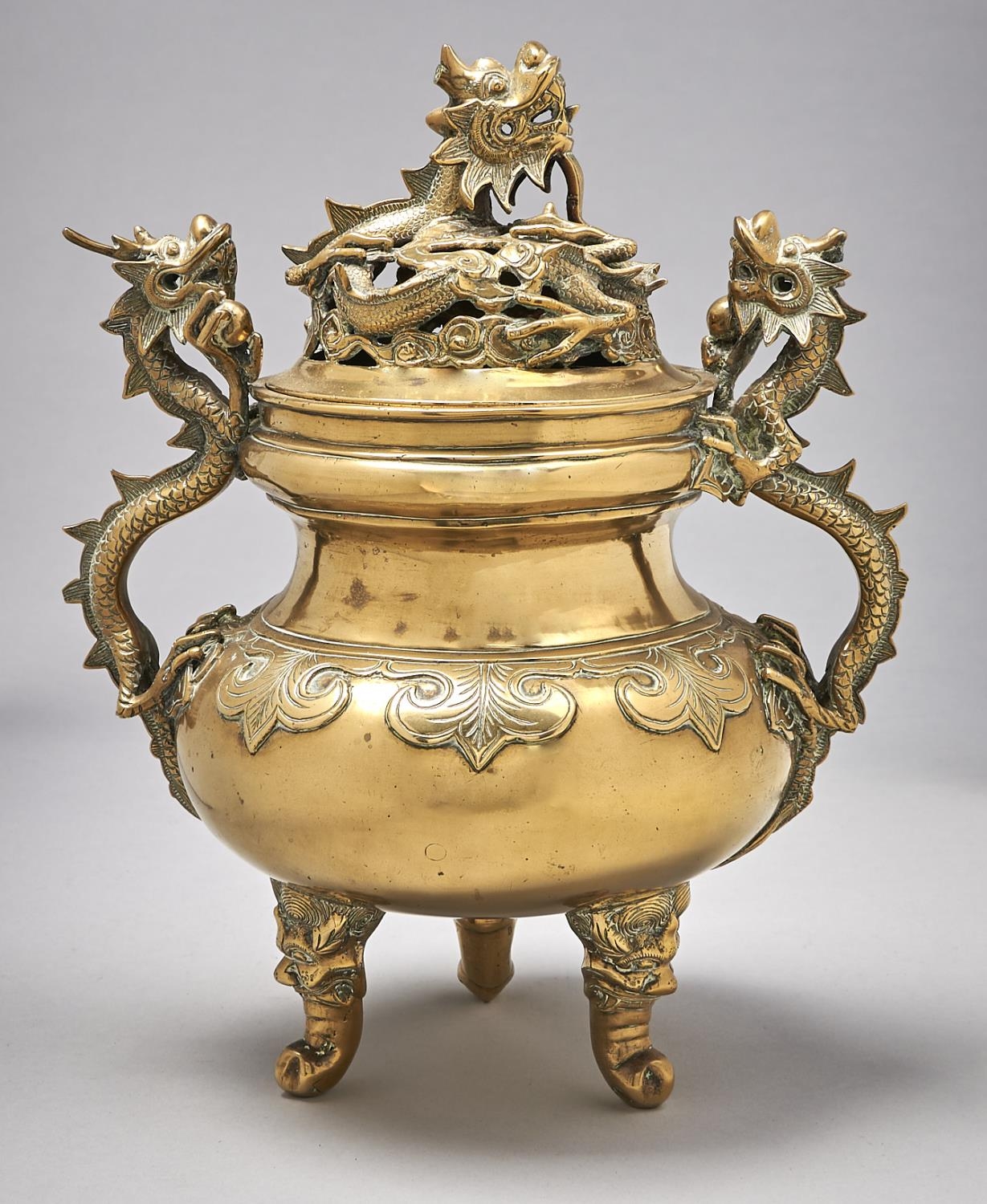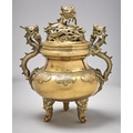 A Chinese brass tripod vessel and cover, late 19th / early 20th c, with dragon handles, 34cm h