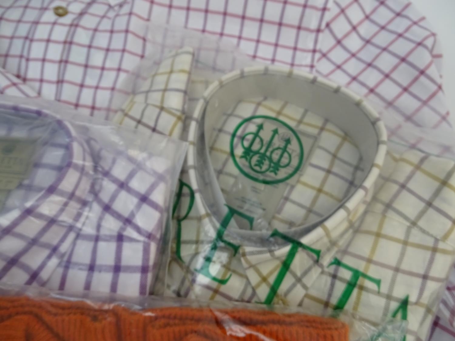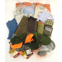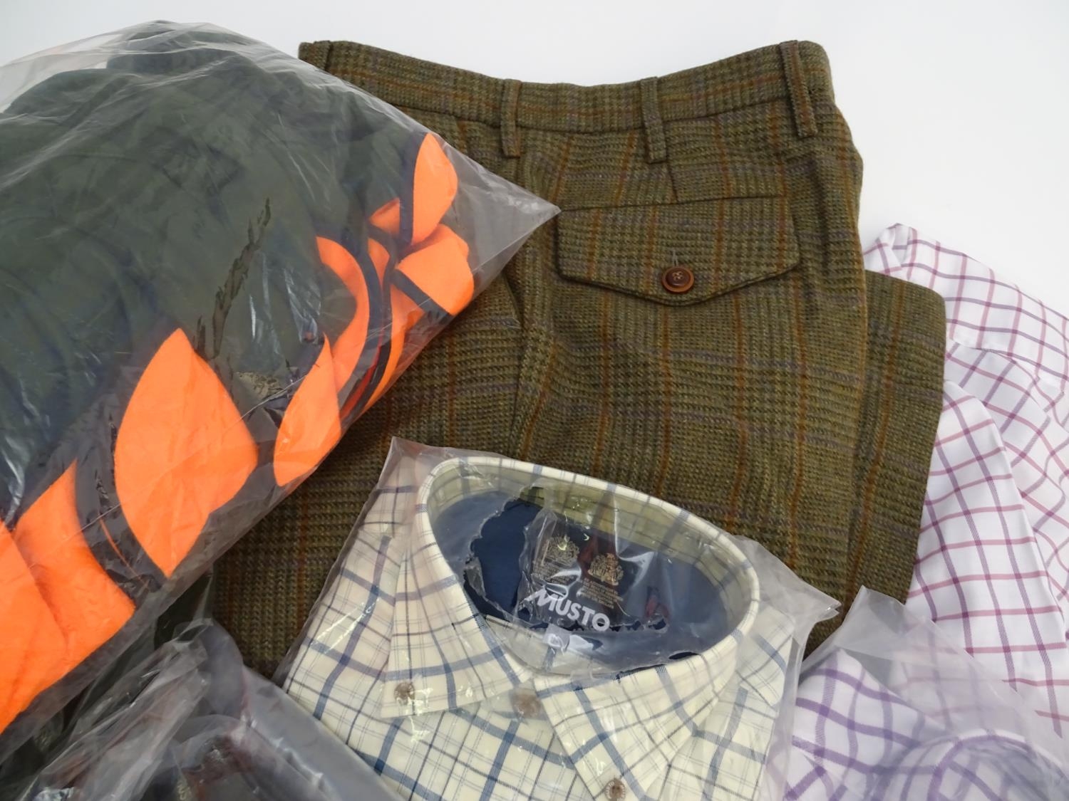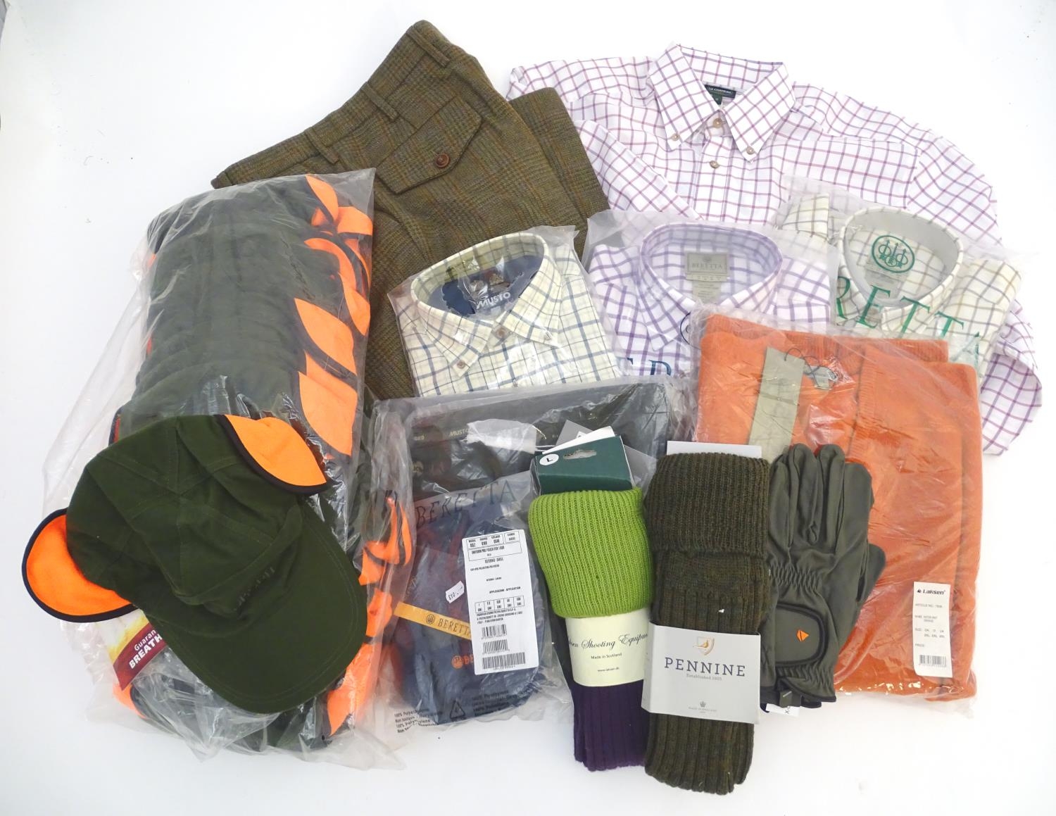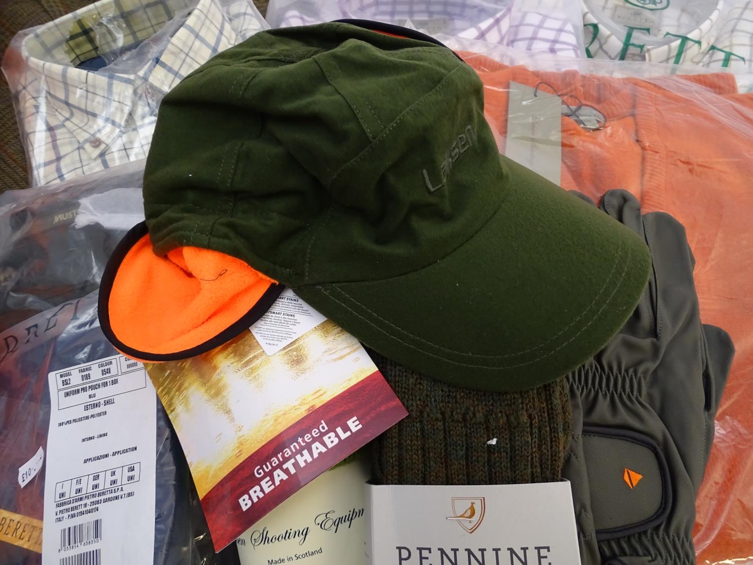 Box of assorted clothing to include, one Laksen orange jumper size 2XL; four shirts, 2 Beretta, 1 Le Chameau and 1 Musto; one pair of Laksen tweed trousers size 36"; one pair of Musto trousers size 42; sixteen Laksen stalker caps; two pairs of socks; one pair of gloves etc.