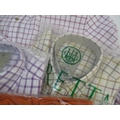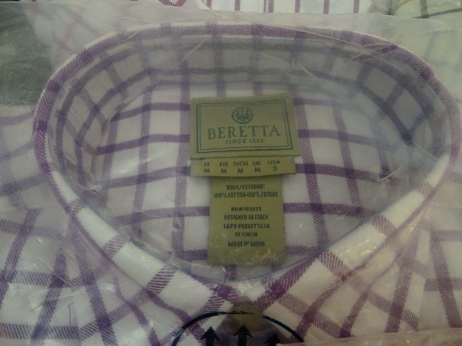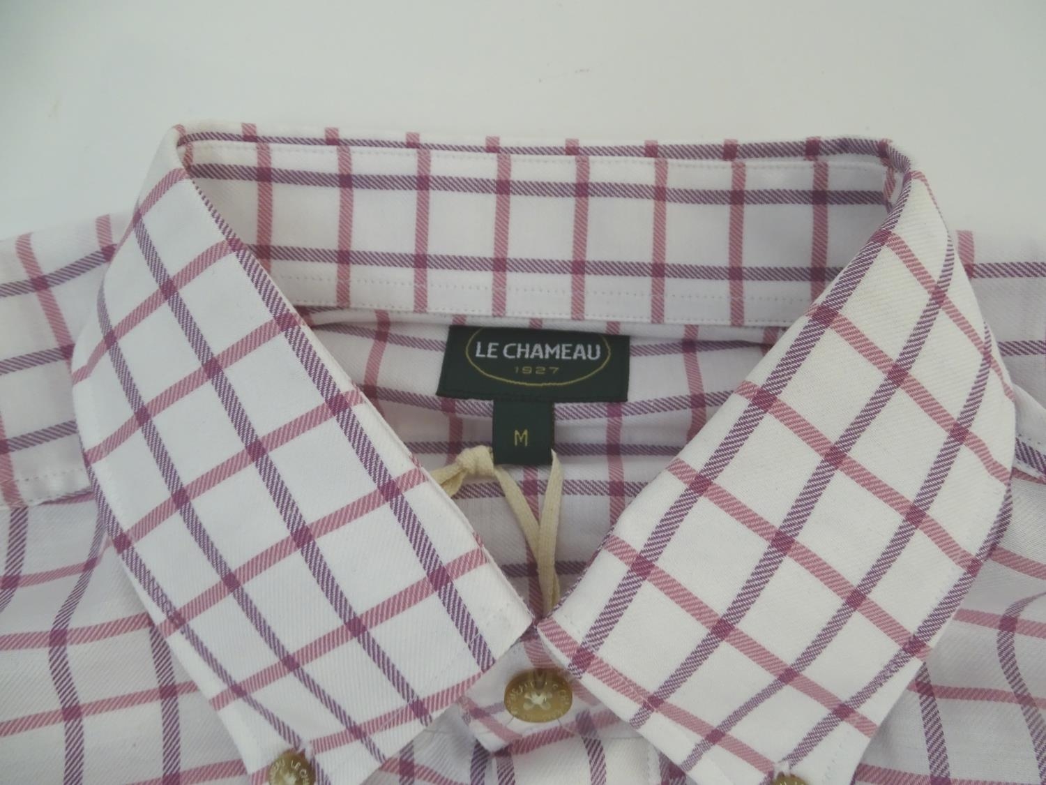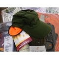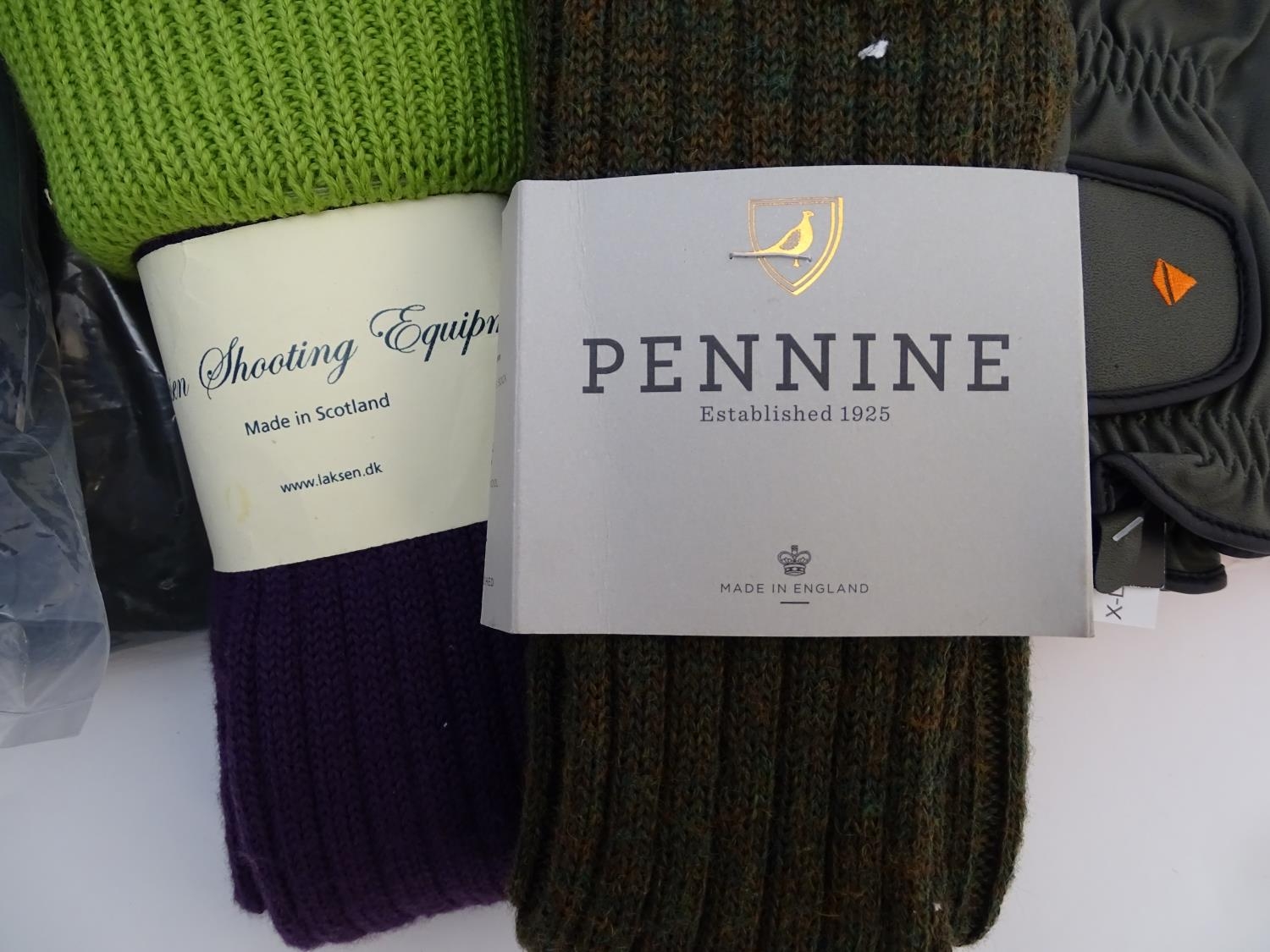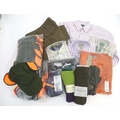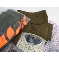 Box of assorted clothing to include, one Laksen orange jumper size 2XL; four shirts, 2 Beretta, 1 Le Chameau and 1 Musto; one pair of Laksen tweed trousers size 36"; one pair of Musto trousers size 42; sixteen Laksen stalker caps; two pairs of socks; one pair of gloves etc.