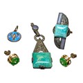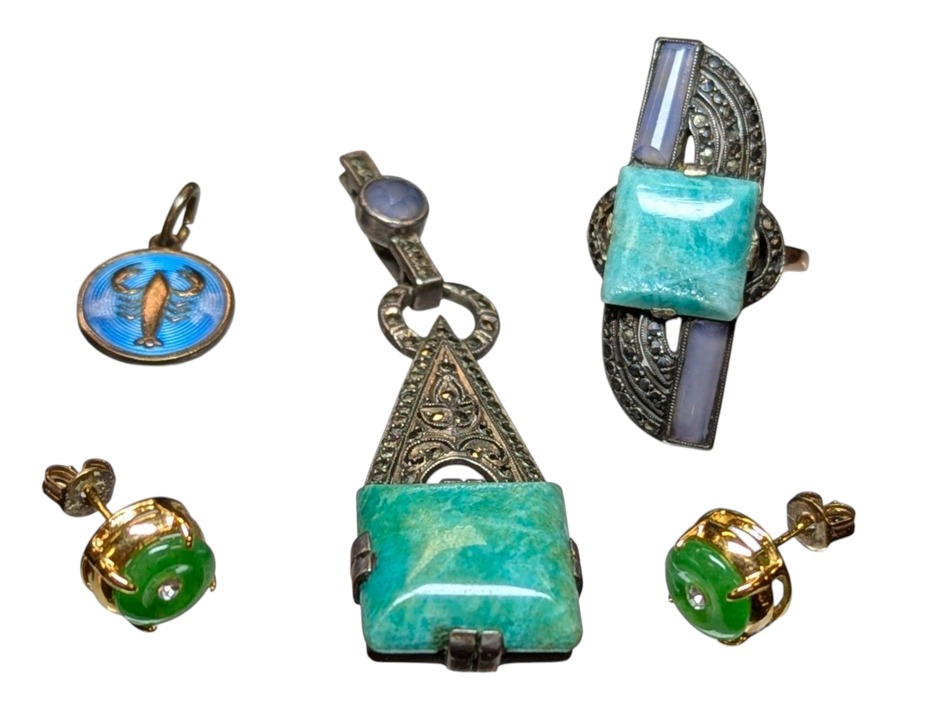 to include an Art Deco Style tested 9ct rose gold and silver aventurine quartz, chalcedony and marcasite set ring, size L 1/2, an Art Deco Style "925" stamped silver aventurine quartz, chalcedony and marcasite set pendant, approx. 5.7cm's high including bale and 1.8cm's max width, a David Andersen blue enamelled sterling silver Scorpion charm, approx. 2cm's high including bale and 1.3cm's max width and a pair of gold plated dyed green quartz and paste stone set stud earrings, a/f