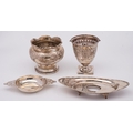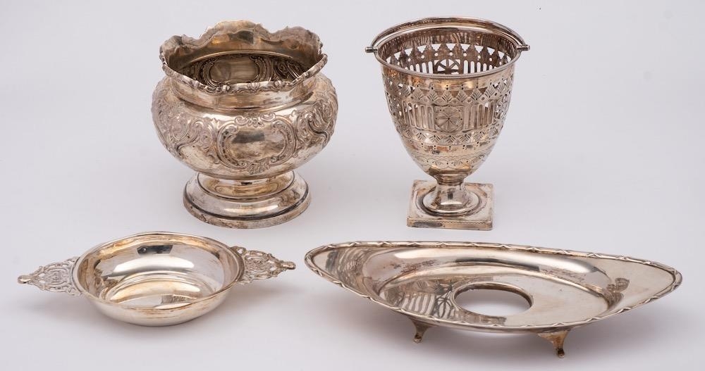 An Edward VII silver sugar basin, maker Williams (Birmingham) Ltd, Birmingham, 1901: of circular outline with embossed foliate and scroll banded decoration, on a spreading circular foot, 13cm diameter, a silver cream pail of traditional design with loop carrying handle, on a square foot, 17cm high, a silver quaiche and teapot stand, total weight of silver 566gms, 18.19ozs. (4).