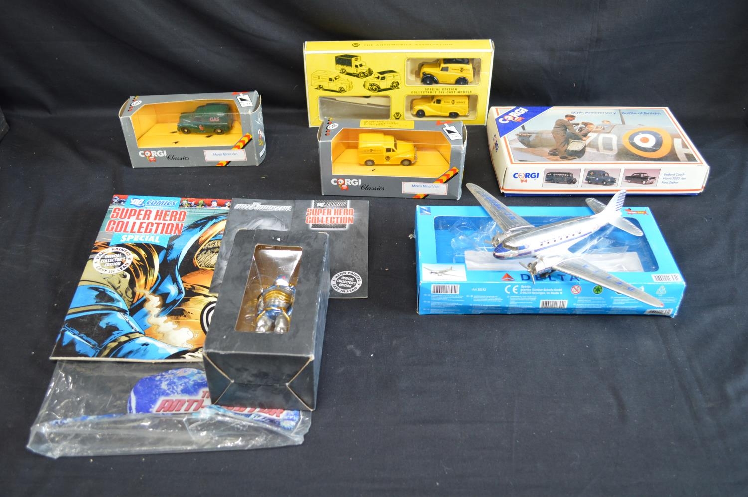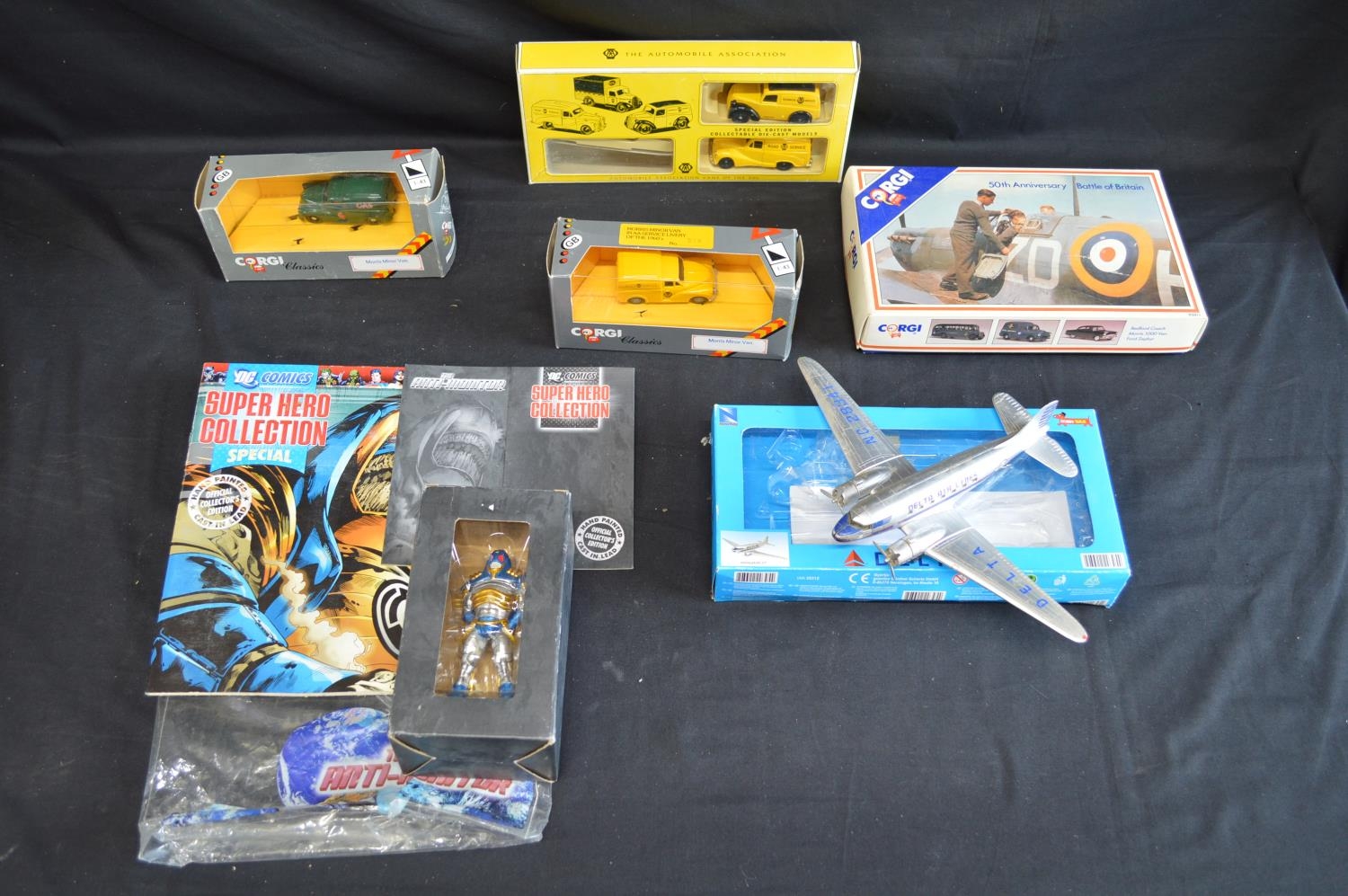 Quantity of Corgi and Days Gone model vehicles together with an aircraft model and DC Comics figure
