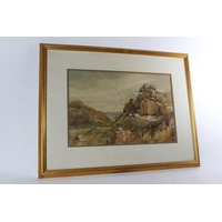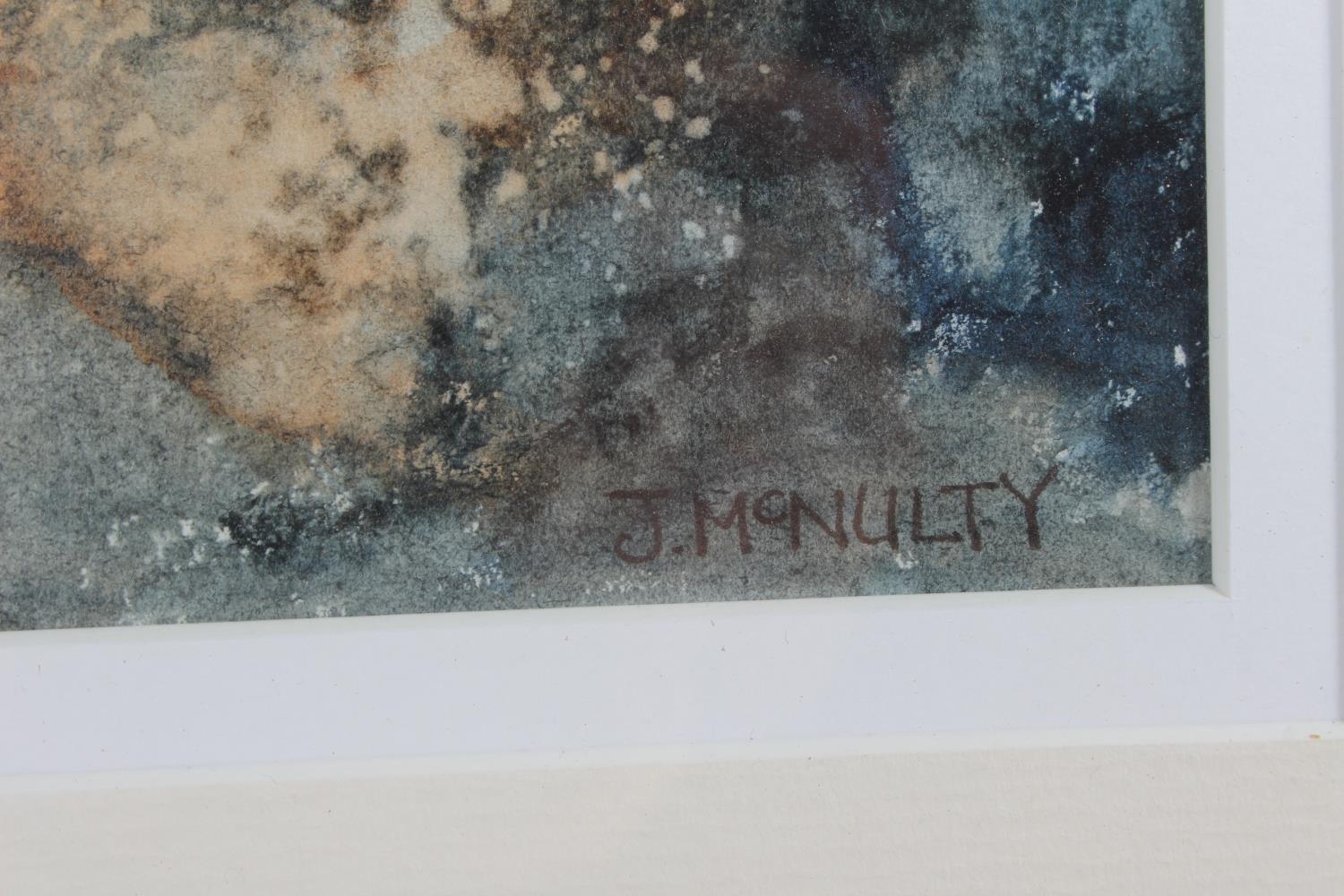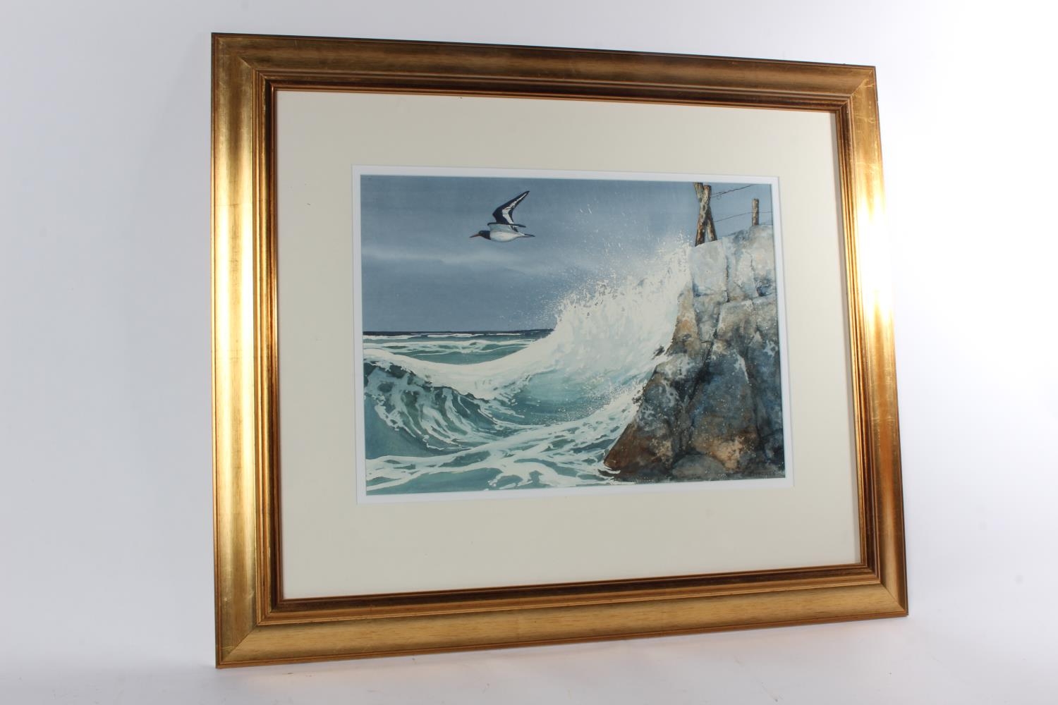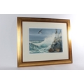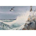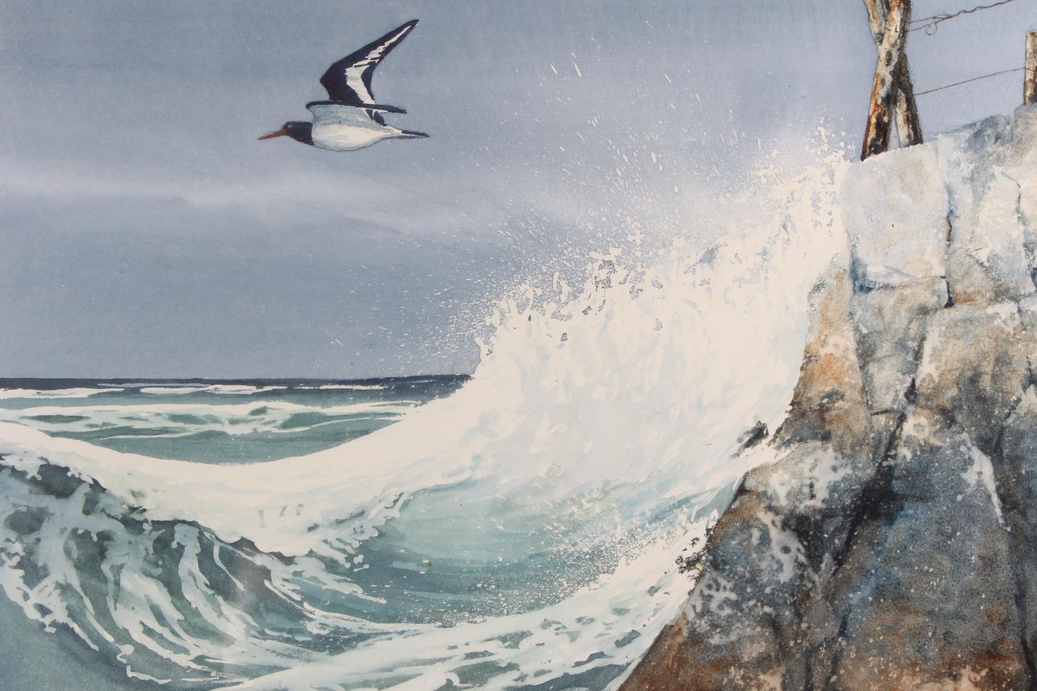 A stunning framed watercolour painting of a bird flying at a Coastal scene, signed J McNulty 45cm 32.5cm painting size