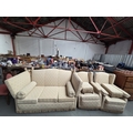 A Knoll drop arm three seater sofa with two matching armchairs and footstools