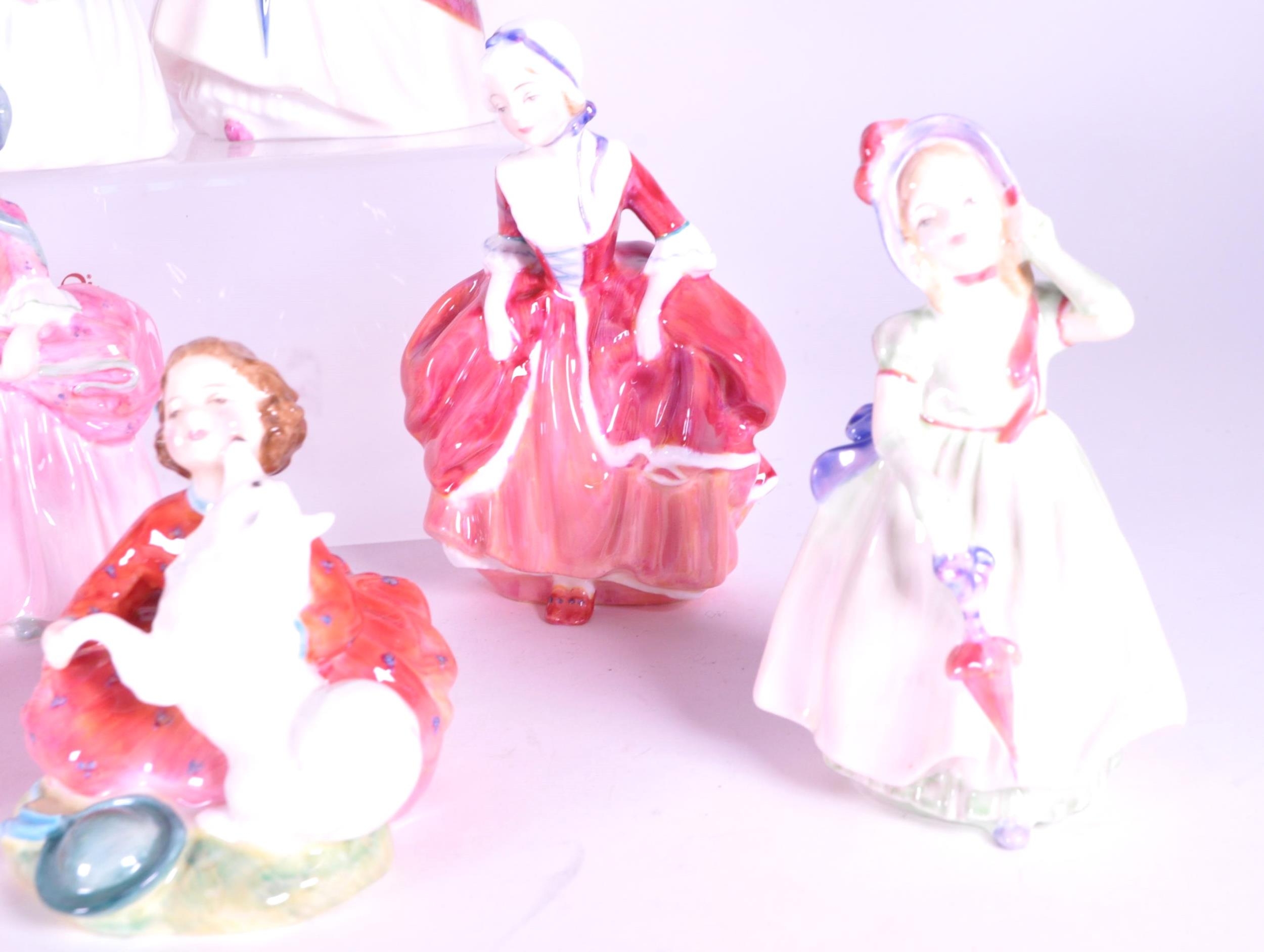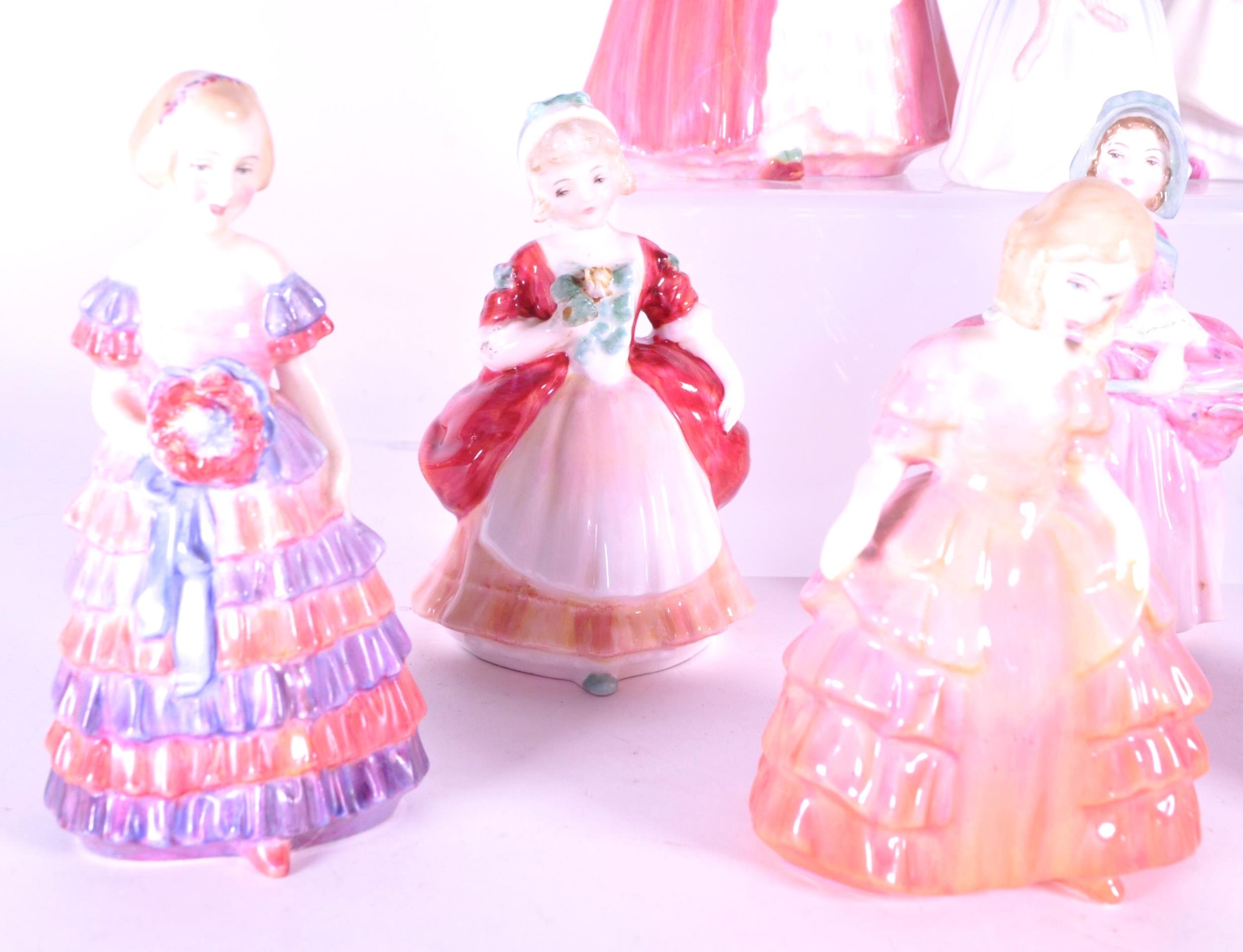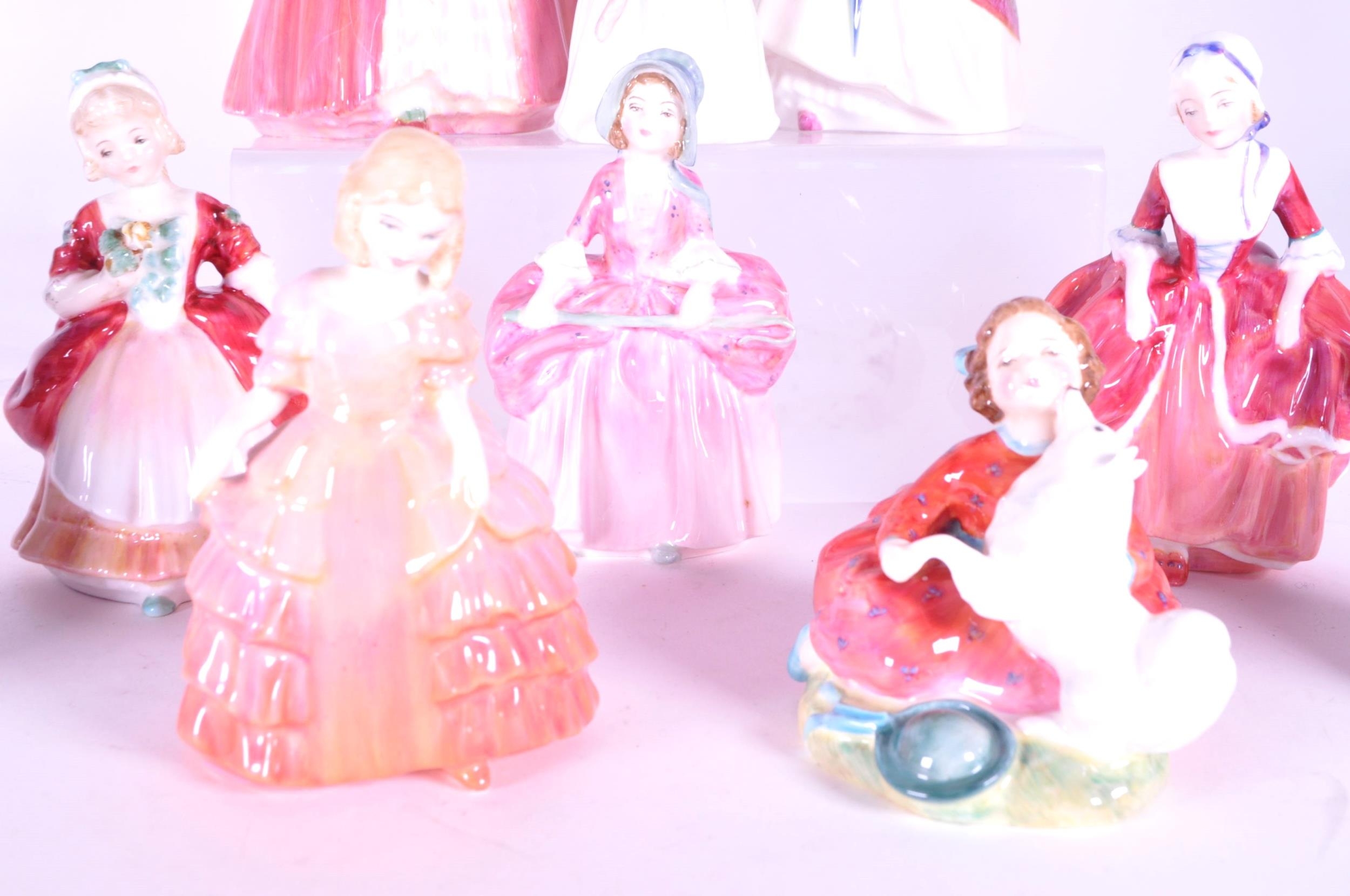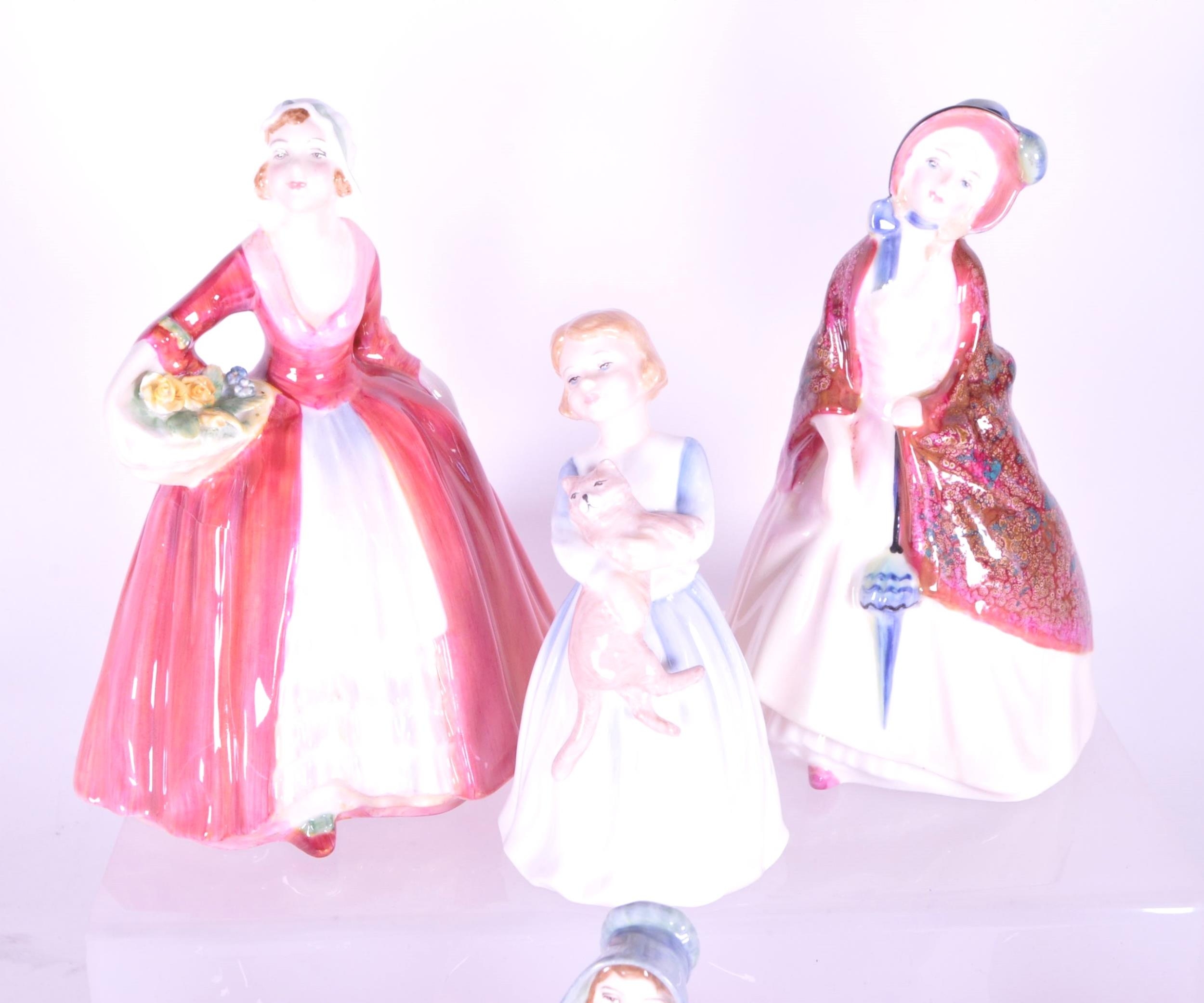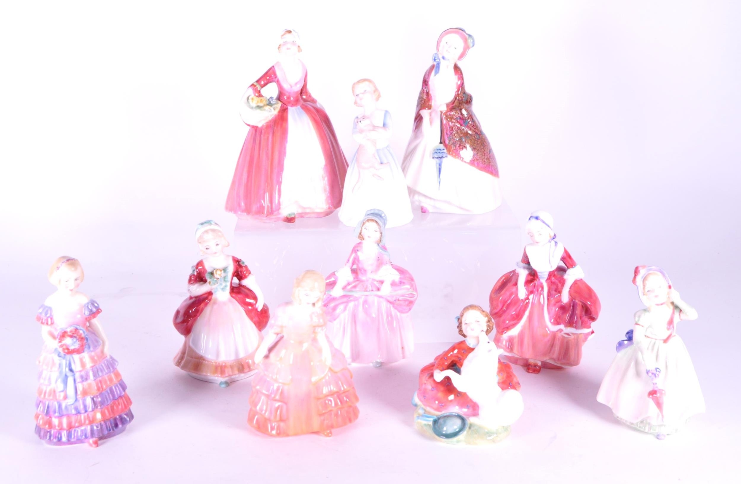 Royal Doulton - Collection of 20th century porcelain lady figures, examples including Rose HN 1368, The Little Bridesmaid, Valerie HN 2107, Bo-Peep HN 1811, Janet HN 1537, Paisley Shawl HN 1988, and more. Makers mark to the underside of each piece. Largest measuring approx. 16cm tall.