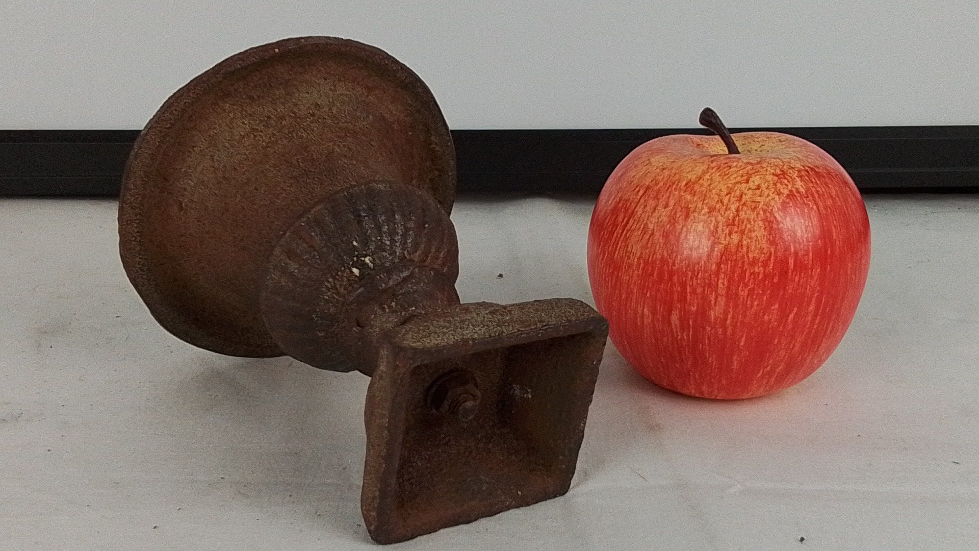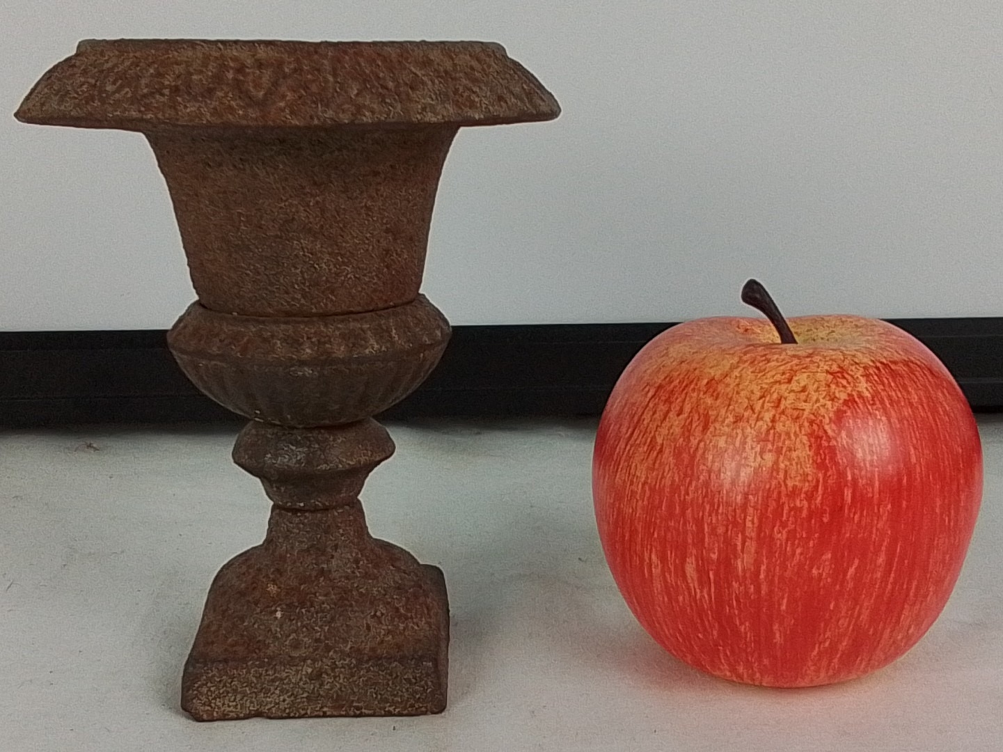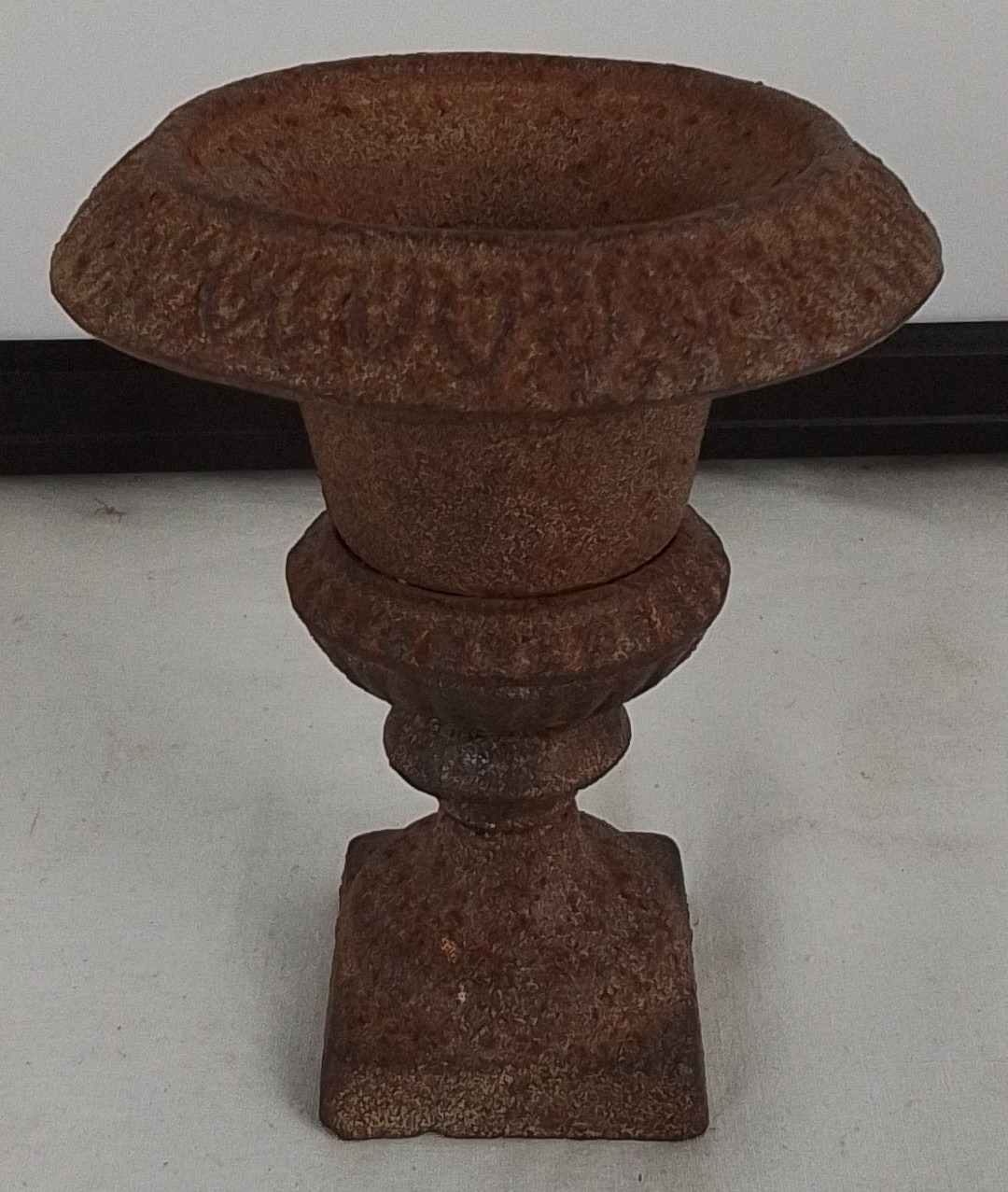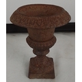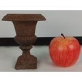 An early salesman cast iron urn-form planter/vase on integral pedestal base, with lobed rim and square plinth foot, presented with a surface patina.