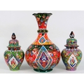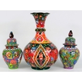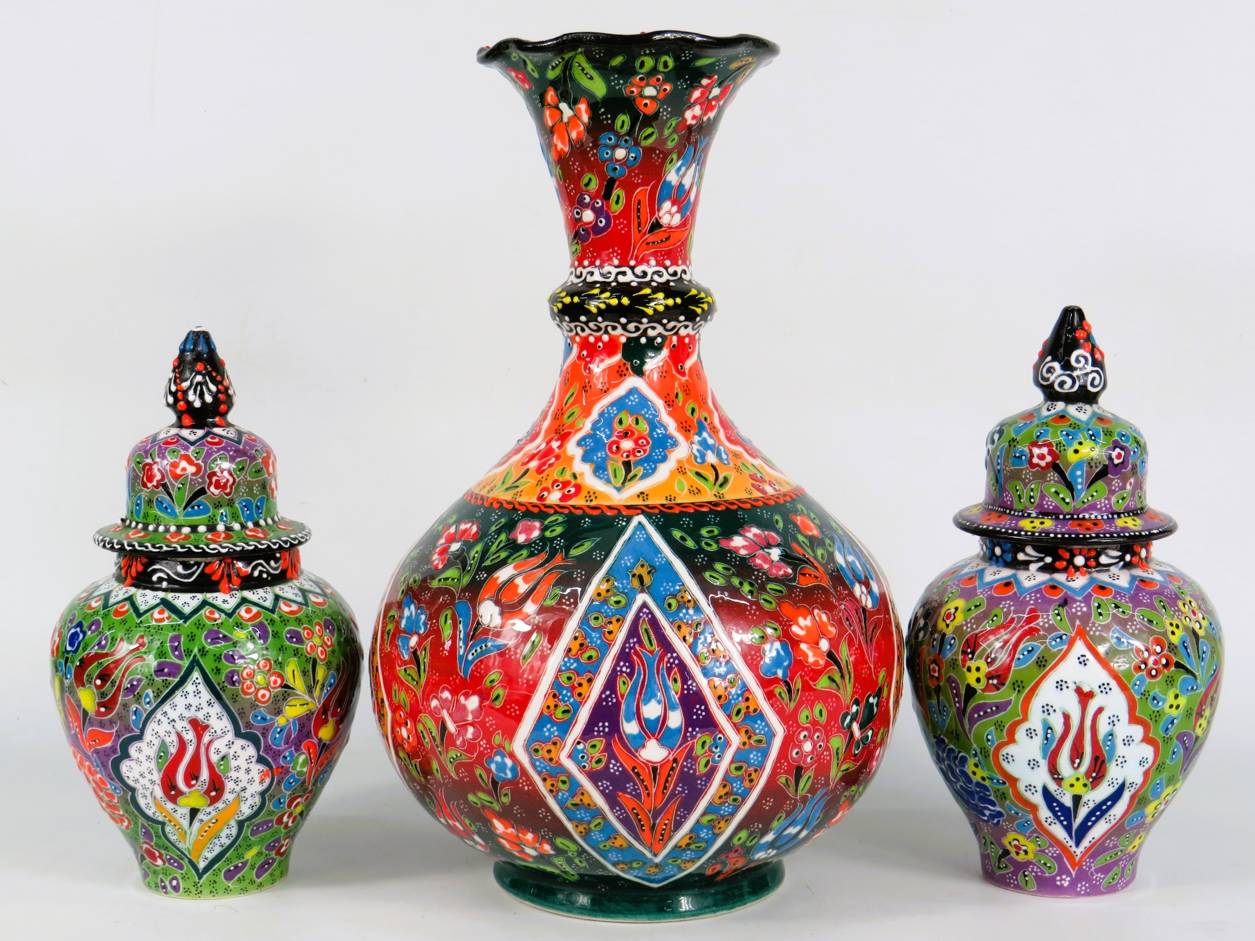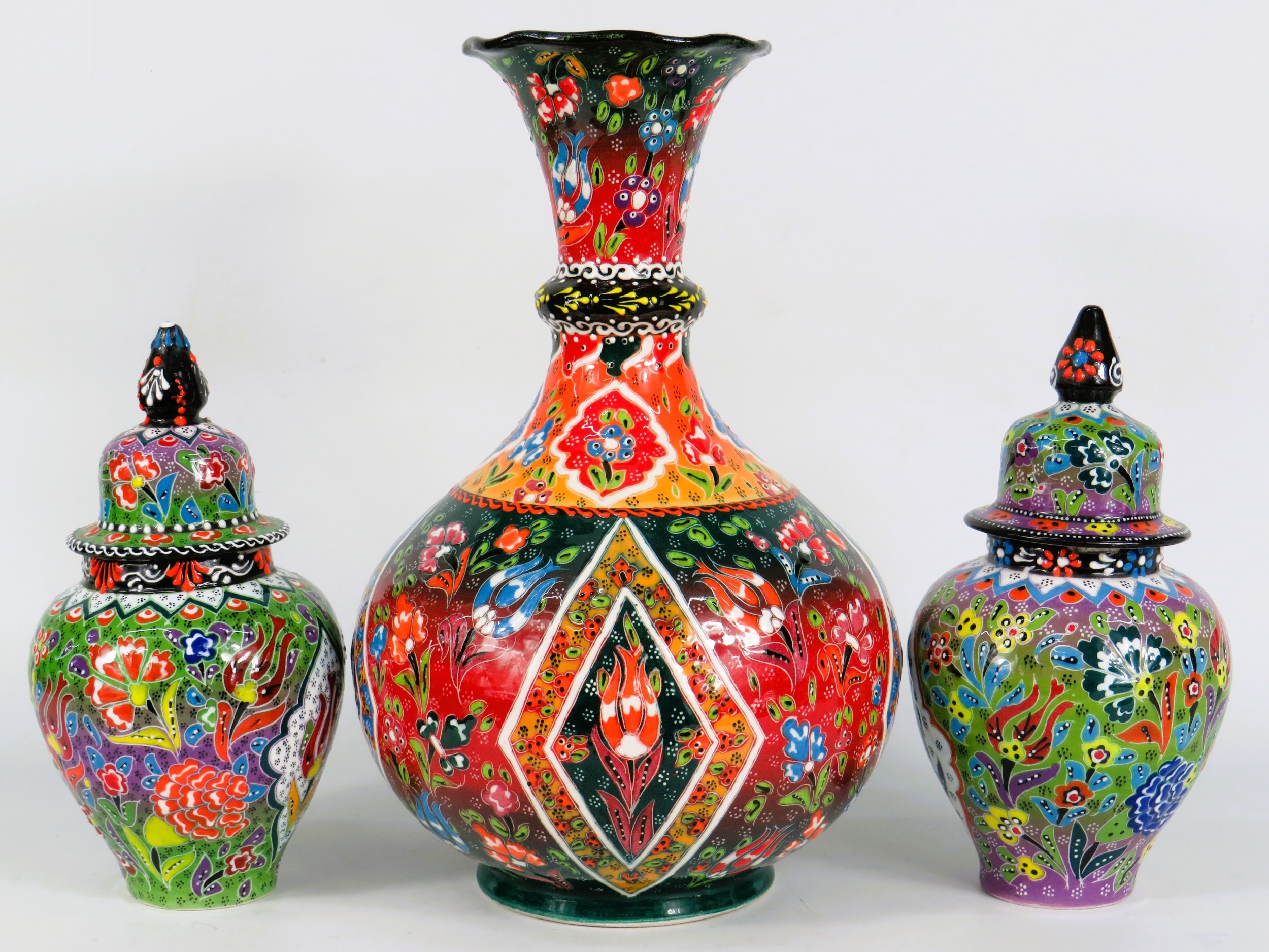 Three Handmade Turkish Ceramics - Large Floral Vase (29cm) & Two Lidded Jars (20cm) - Vivid Multicolour Design