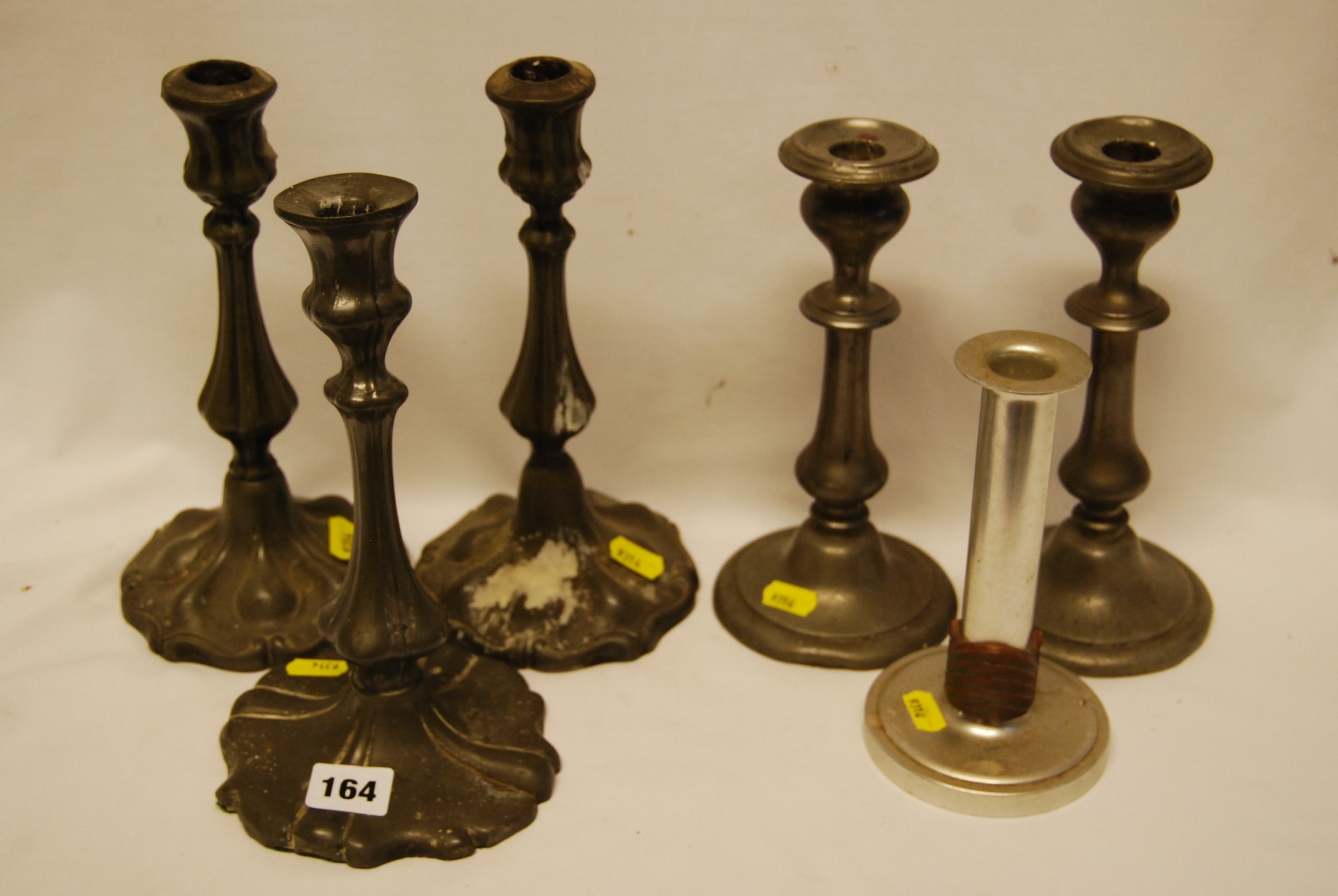 2 PAIRS OF 18TH CENTURY PEWTER CANDLESTICKS, 1 ODD ONE AND 1 ALUMINIUM ONE