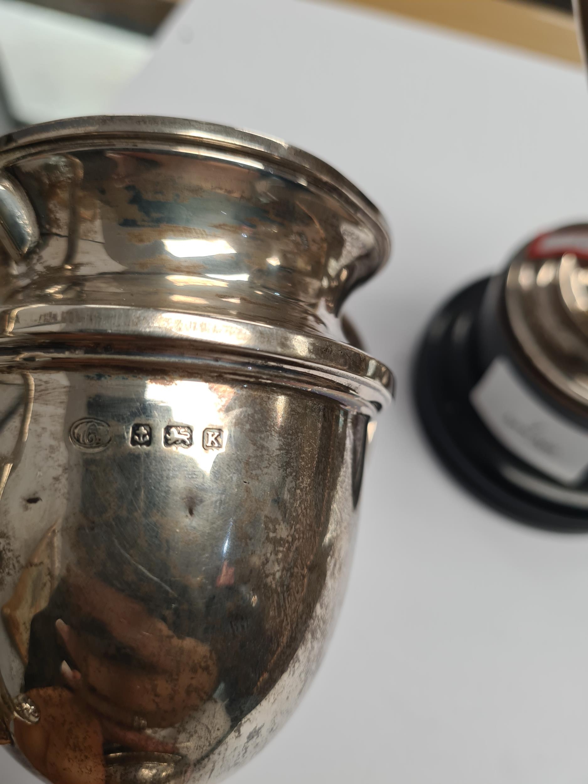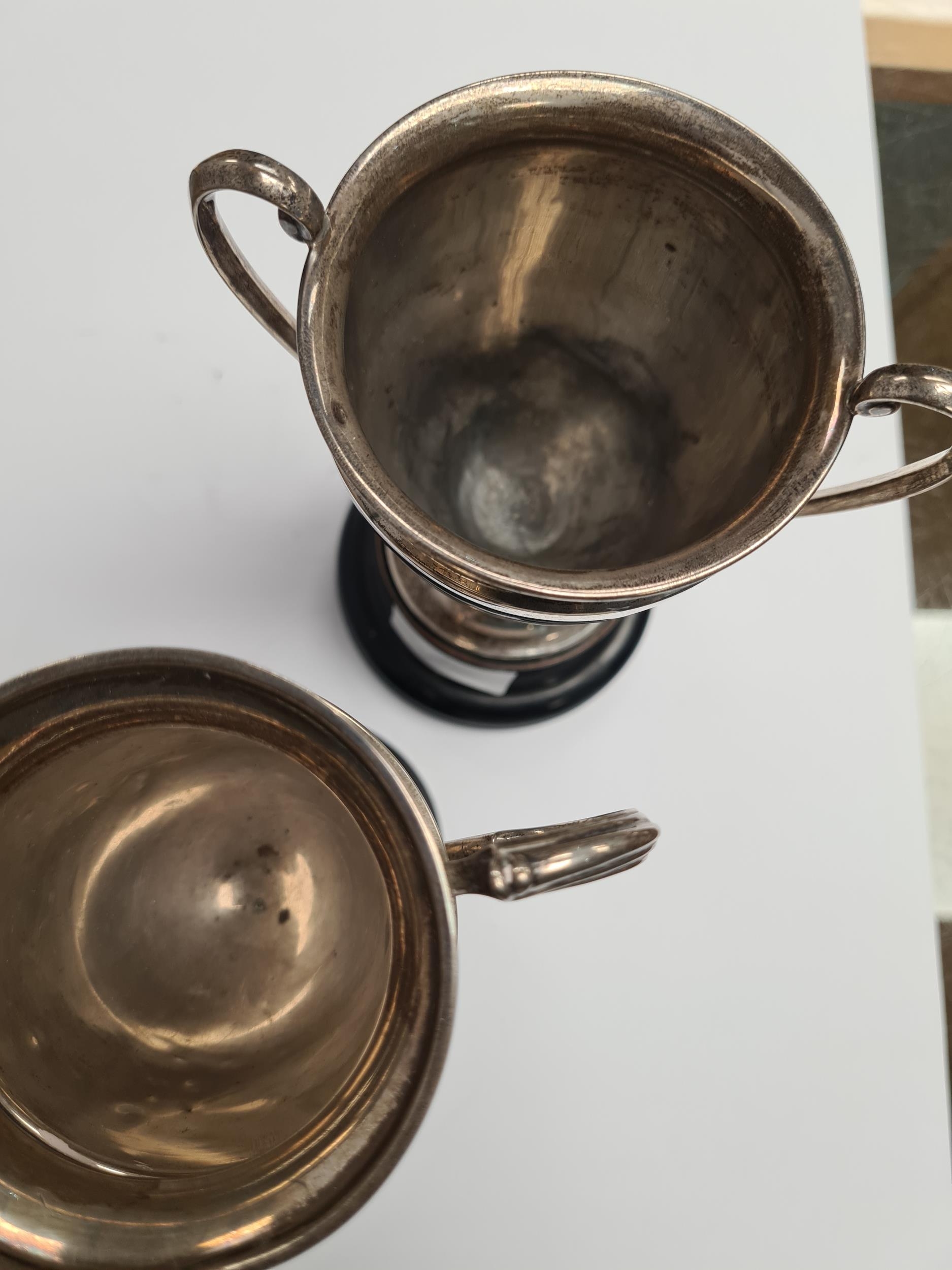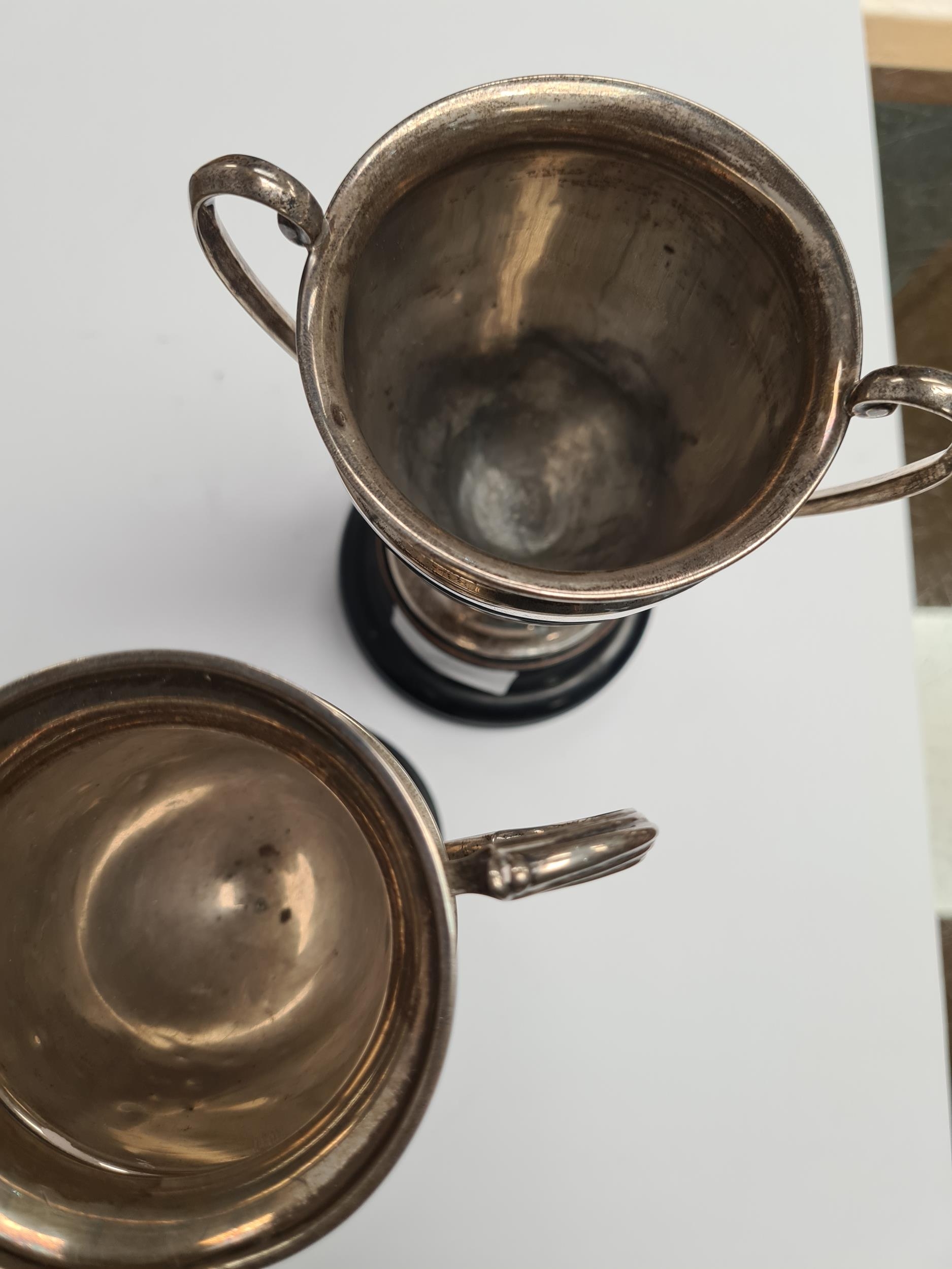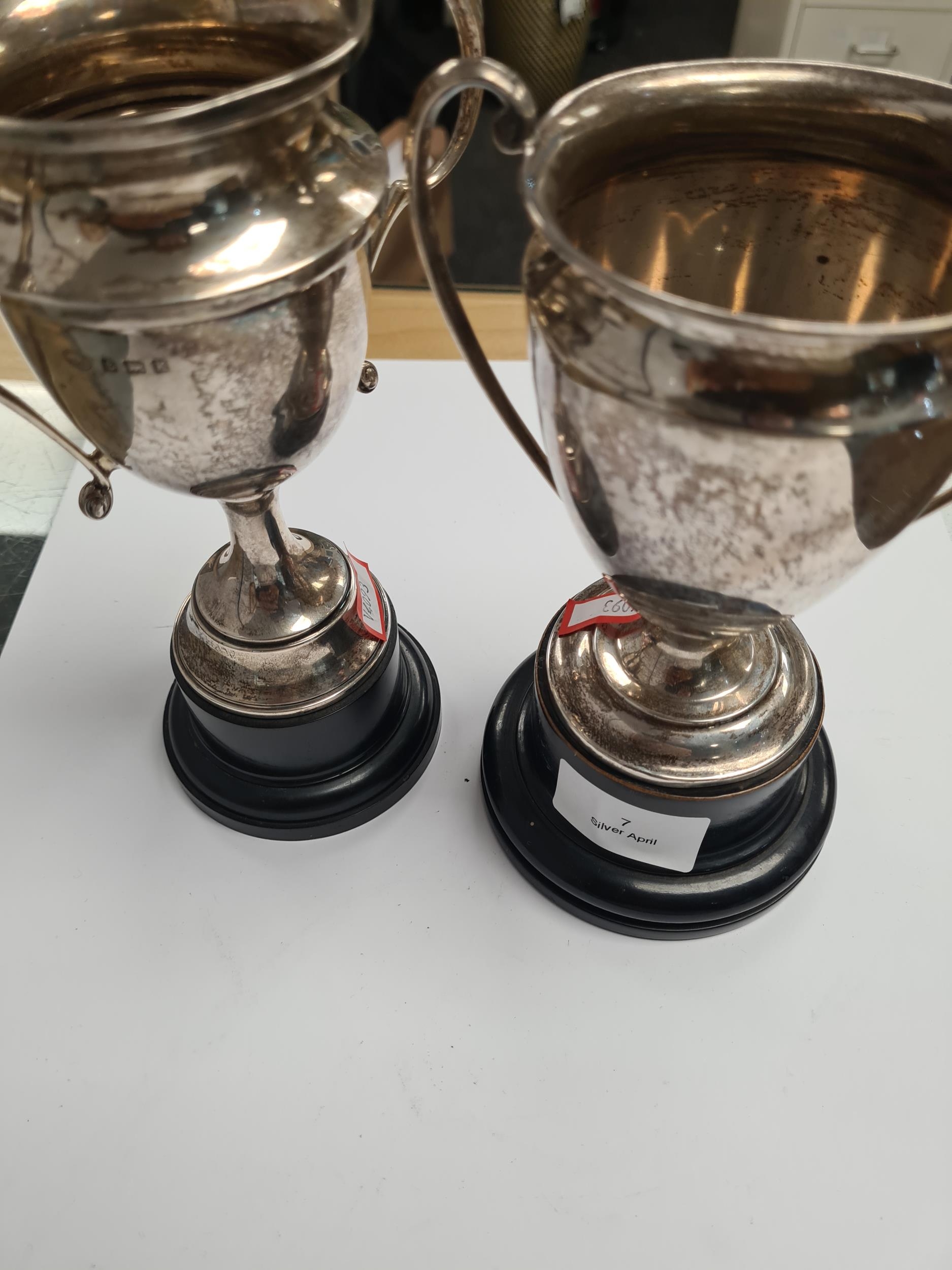 Two silver trophy cups, one by Alexander Clark and Co Ltd., the other Elkington and Co Ltd., 1934 and 1928, Birmingham. On stands, 7.92ozt approx. Condition Report: Minor wear, denting