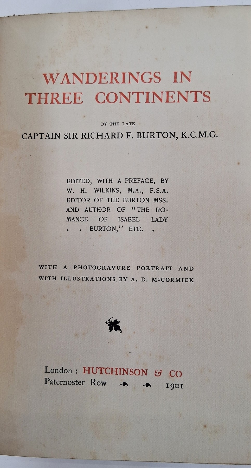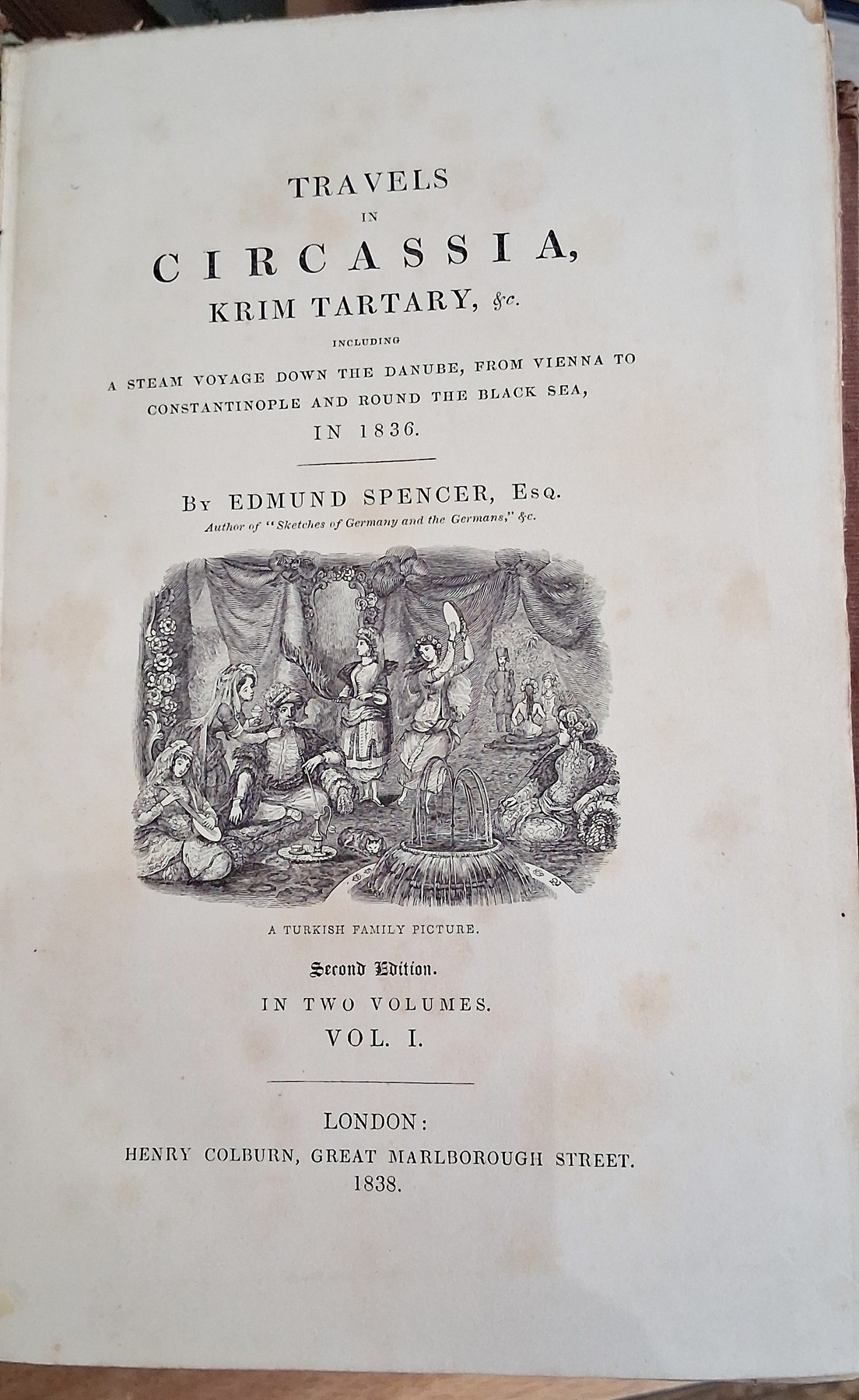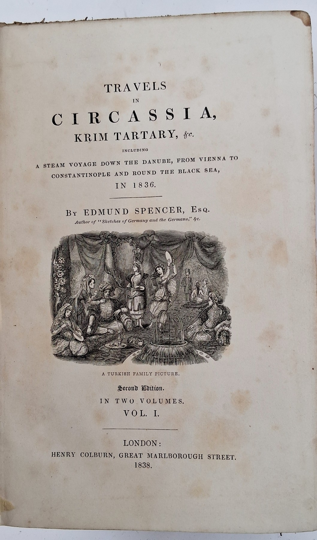 European and Eastern travel - Spencer, Edmund 'Travels in Circassia, Krim, Tartary etc, 1836' second edition Henry Coleburn 1838 volume 1 only, colour frontis with tissue guard, vignette on the title page, advertisements, folding map, front hinge cracked, original publishers blind stamped cloth, back strip is chipped and separating, Burton, Sir Richard 'Wanderings in Three Continents' Hutchinson 1901, photographic frontis, original red cloth with gilt titles, some staining to front board, Perrin, A. 'East of Suez', Anthony Treherne & Co. 1901, rebound, half leather over maroon boards, gilt title, Mockler-Ferryman, Major A.F. 'In the Northman's Land, Travels, Sport and Folk-Lore in the Hardanger Fjord & Fjeld' Sampson Low Marston & Co. 1896, photo frontis, folding map, various plates, original publishers cloth showing the gilt head of a reindeer on the front board and gilt titles to the back strip, Thomas, Margaret 'A Scamper through Spain and Tangier' Hutchinson (1892), frontis portrait, illustrations throughout, Putnam Weale B.L. (Ed) 'Indiscreet Letters from Peking' Hurst and Blackett (1900), publishers yellow cloth with black titles, the whole book is cocked, Kipling, John Lockwood 'Beast and Man in India......' Macmillan & Co 1891, illustrations throughout, bookplate, half leather over marble boards, the back strip is chipped with loss and the front board is nearly detached and other volumes (14)