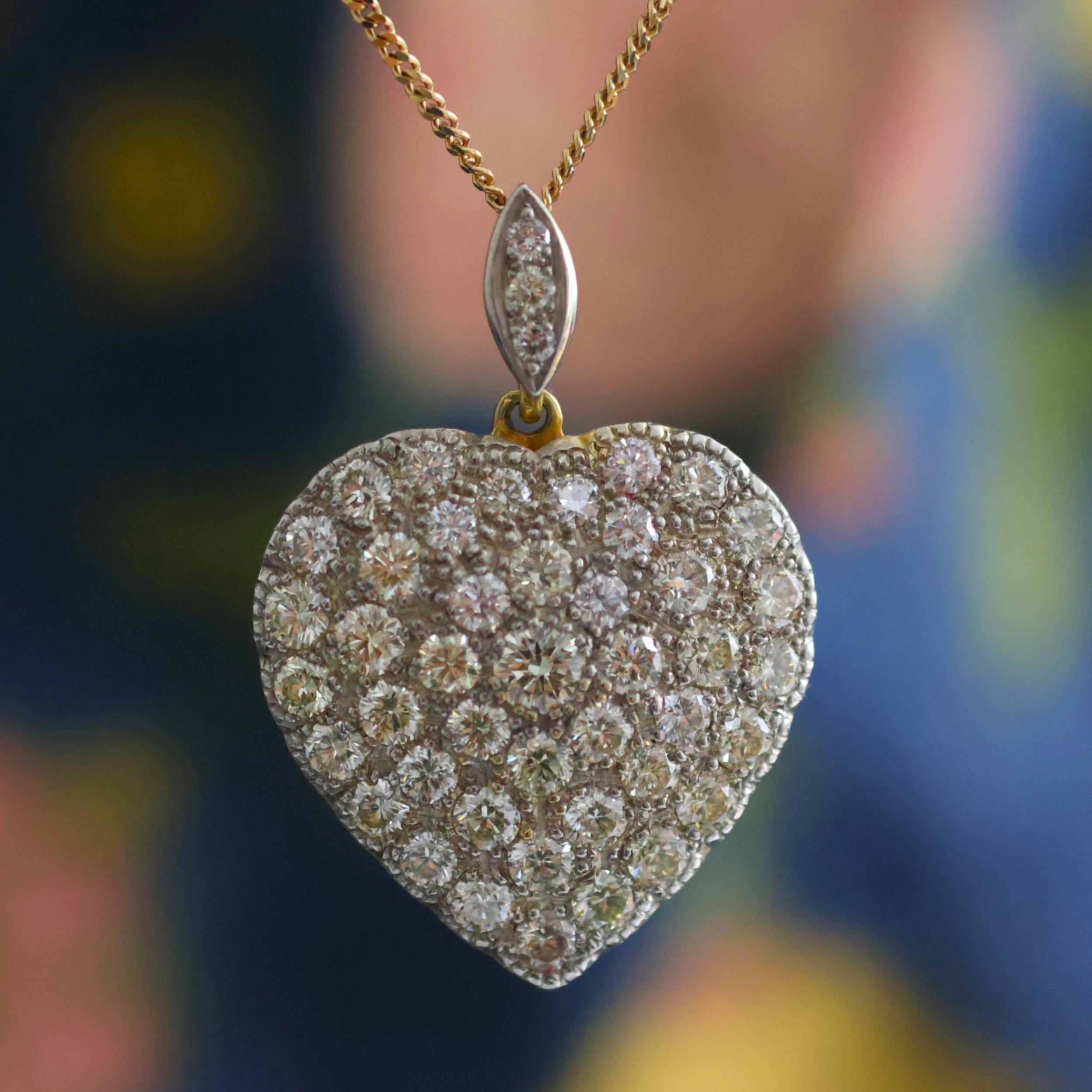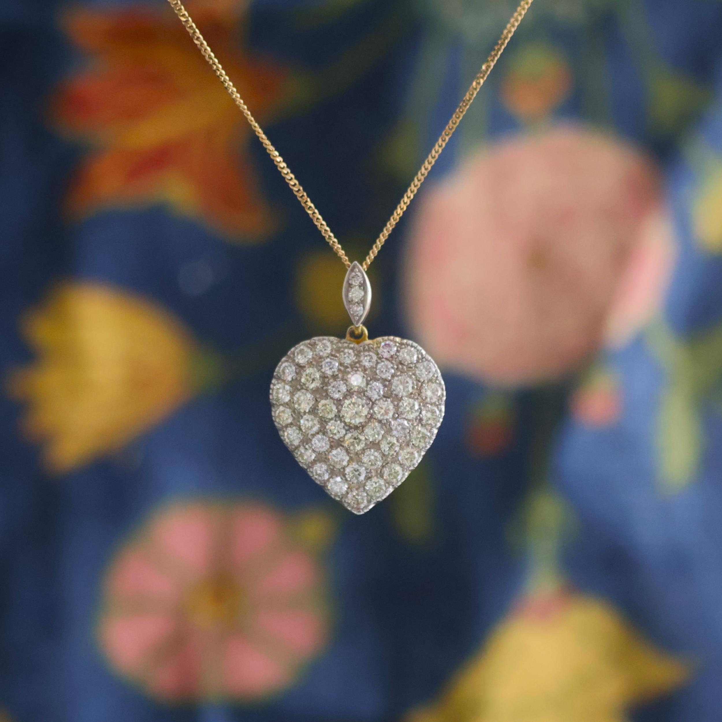 A mid 20th century diamond heart pendant, the pendant set with forty six graduated round cut diamonds, all set in white metal to the front with yellow metal half closed reverse encompassing central heart motif, with diamond set pendant bale, 3.5cm long, upon associated 9ct gold chain, 41cm long, gross weight 9.8gms, total diamond weight estimated 6.60ct