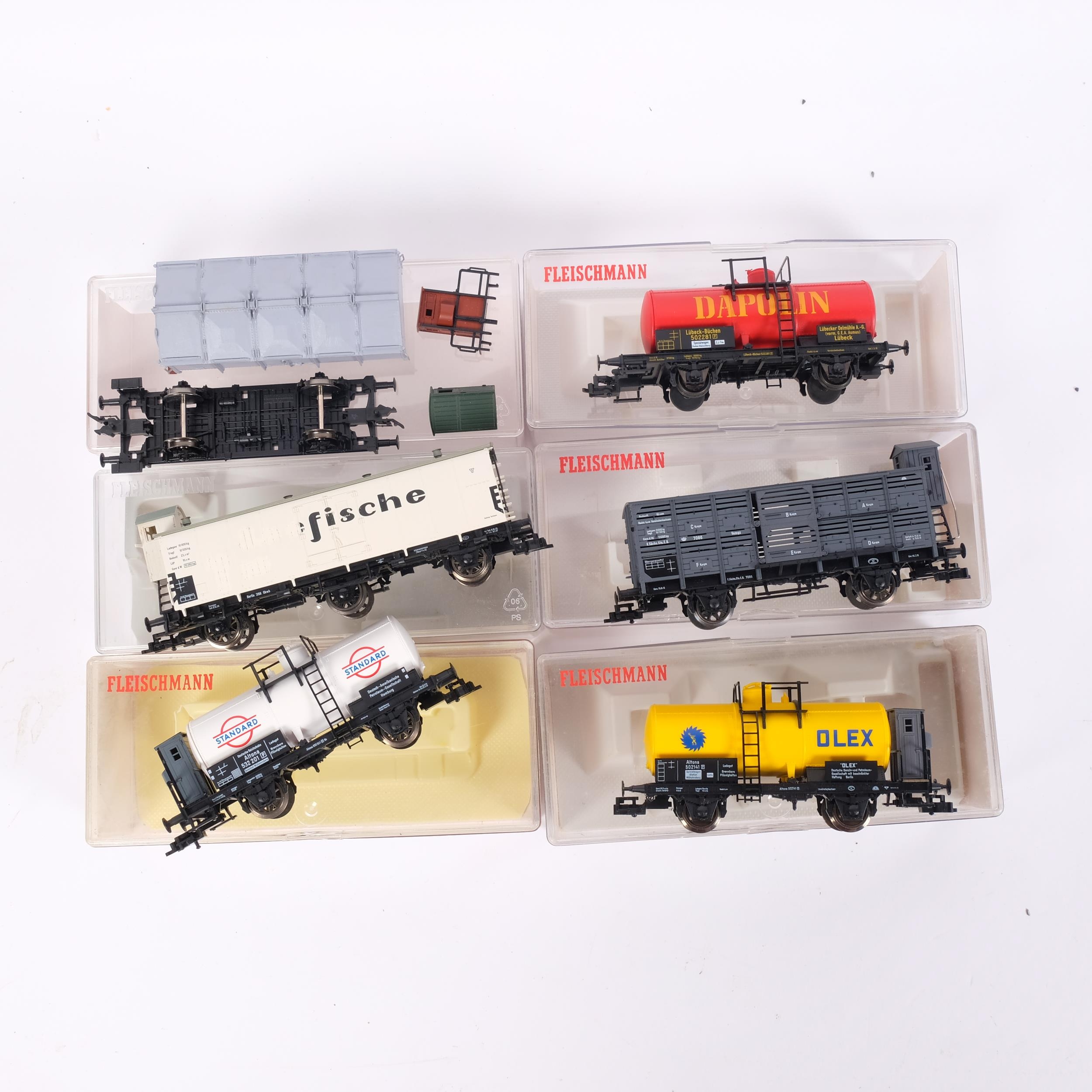 A collection of 6 various HO scale wagons, most Fleischmann, each in unassociated box