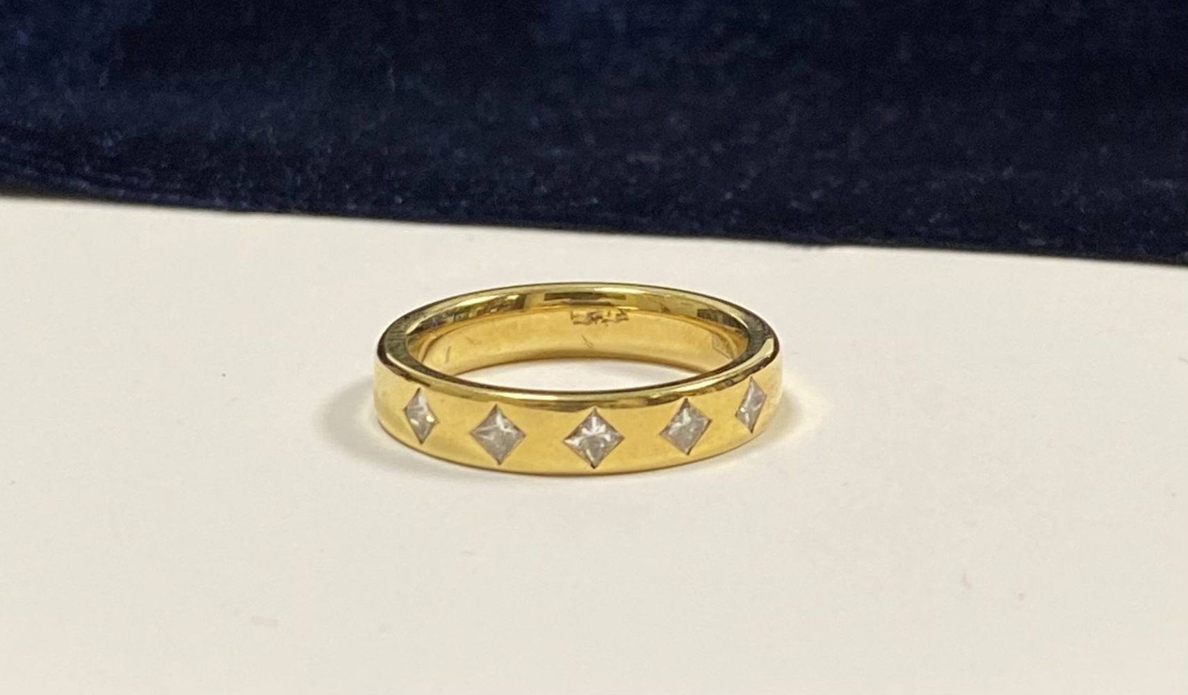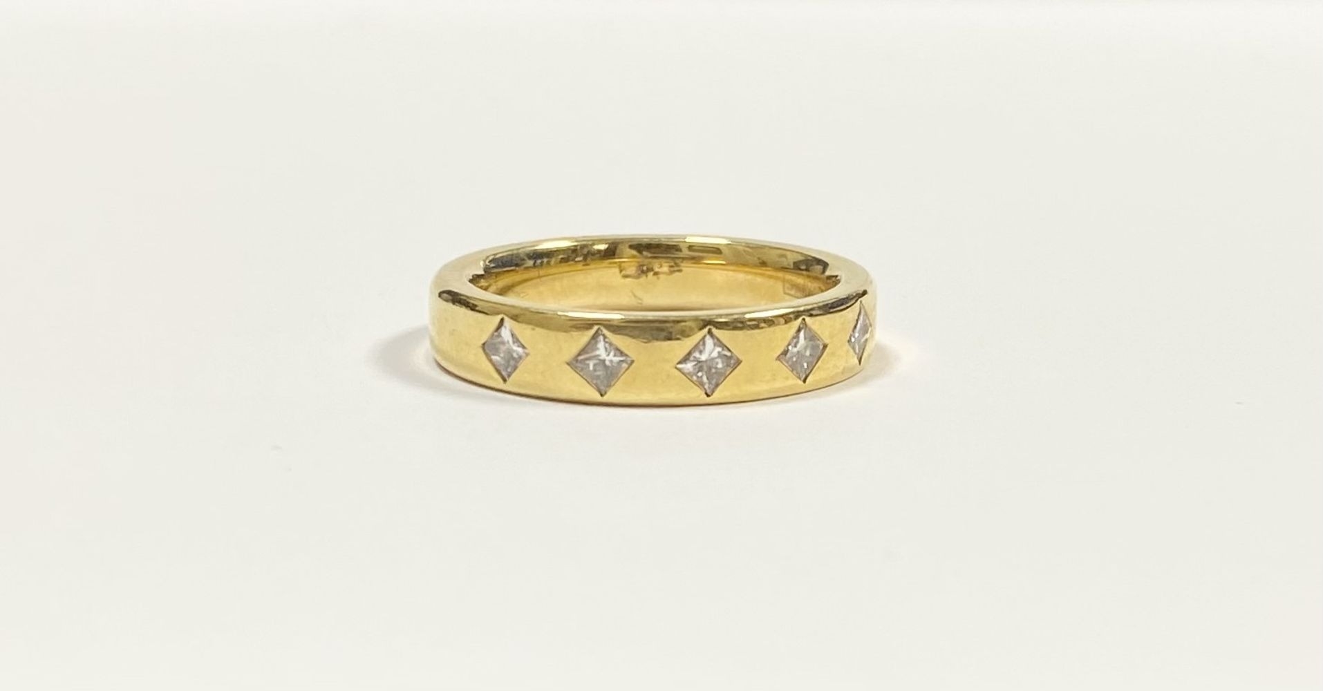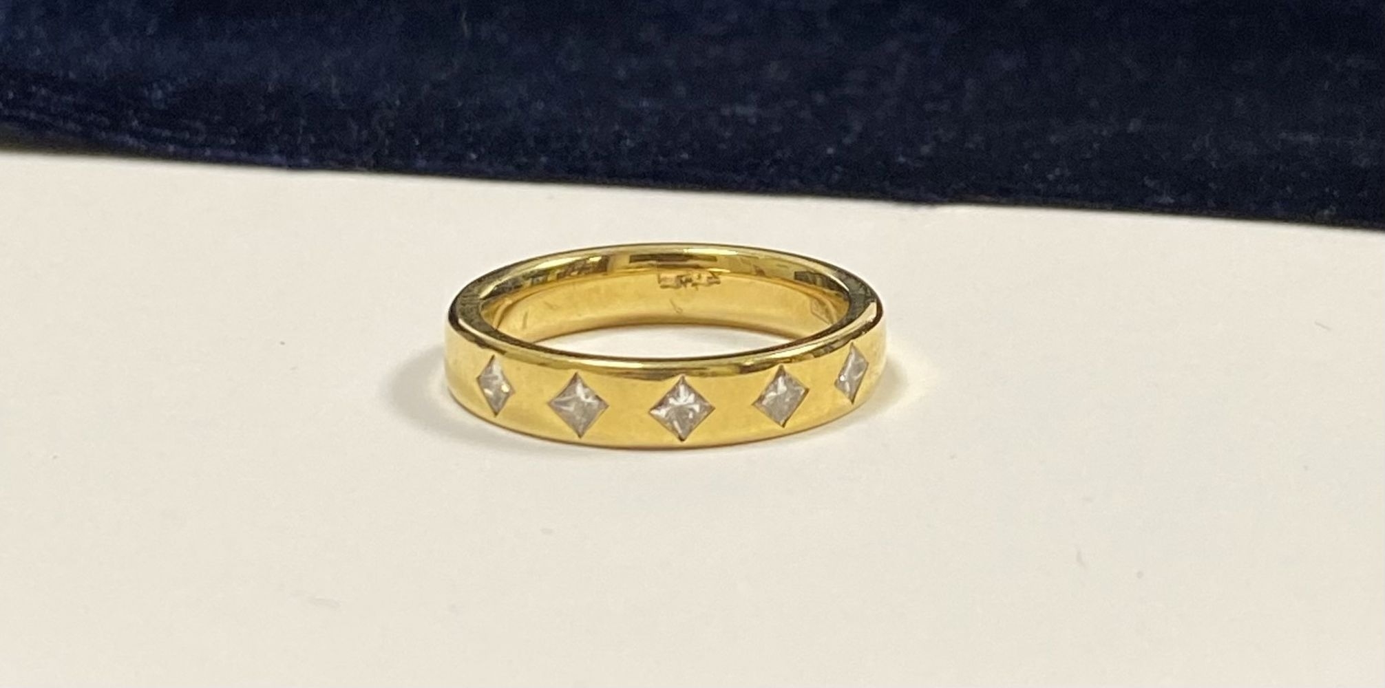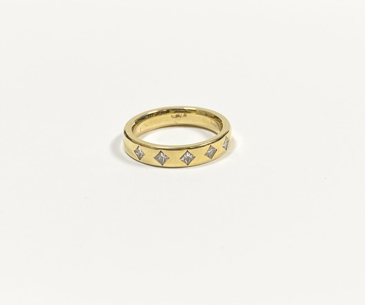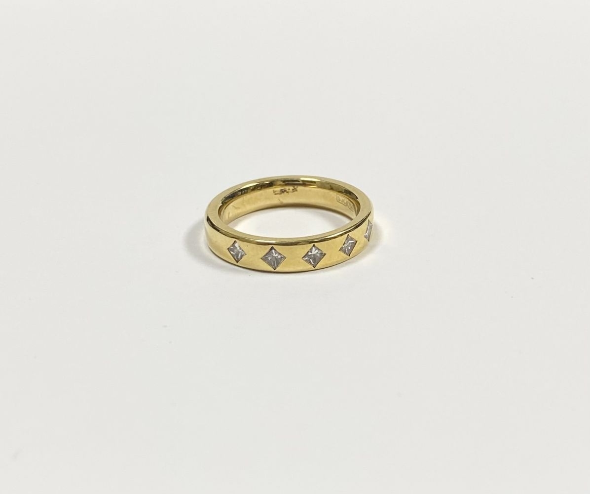 AN 18CT YELLOW GOLD FIVE STONE DIAMOND BAND RING, with five princess cut diamonds set in 18ct yellow gold band. Hallmarked to interior band 750, Makers mark SJC, Birmingham. Ring size: L