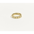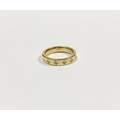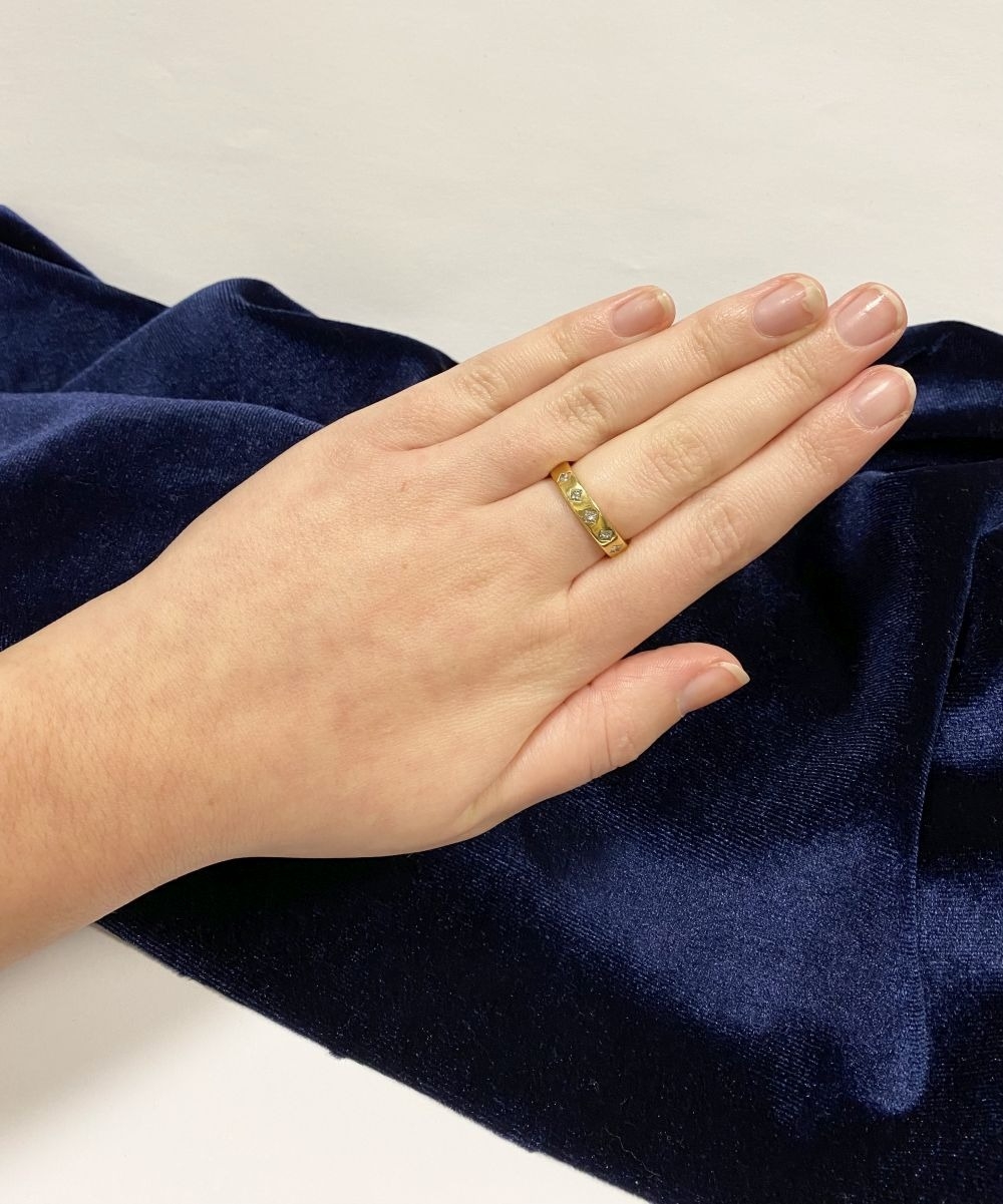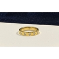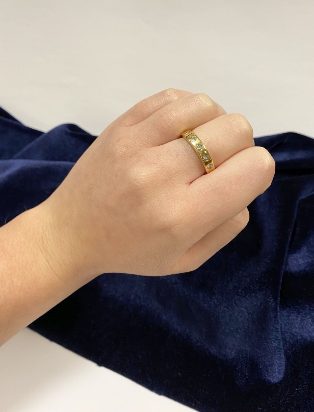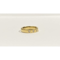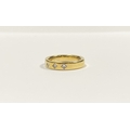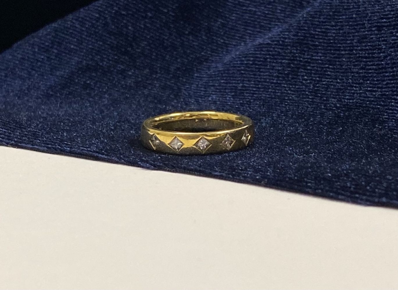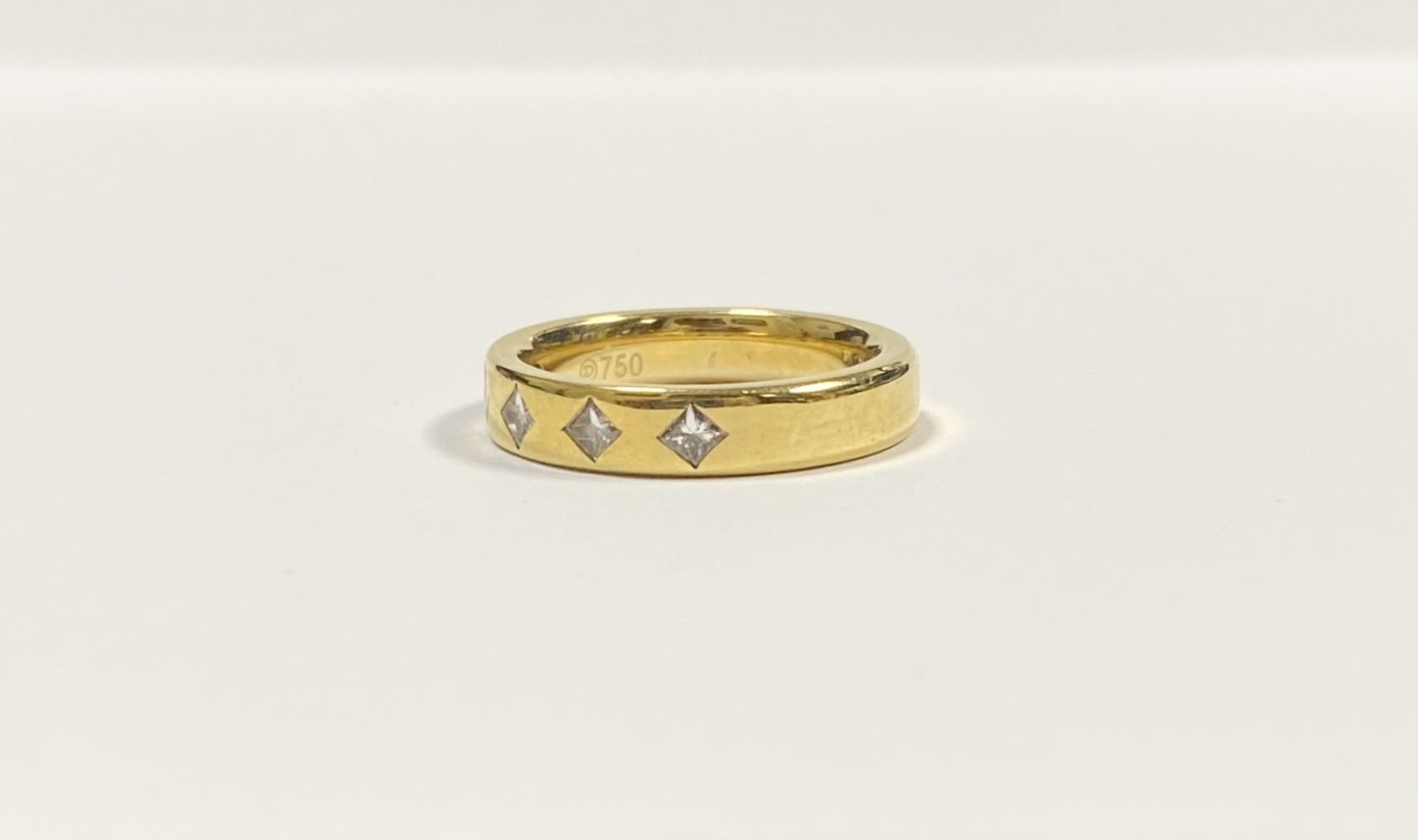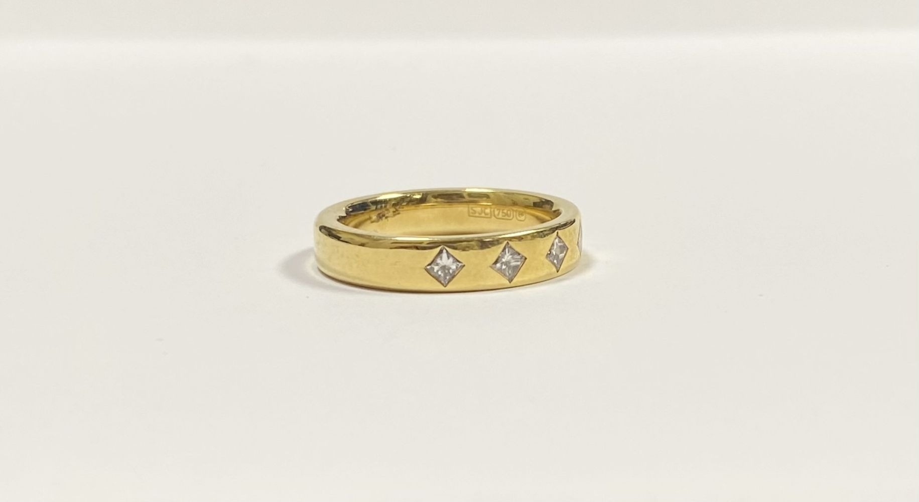 AN 18CT YELLOW GOLD FIVE STONE DIAMOND BAND RING, with five princess cut diamonds set in 18ct yellow gold band. Hallmarked to interior band 750, Makers mark SJC, Birmingham. Ring size: L