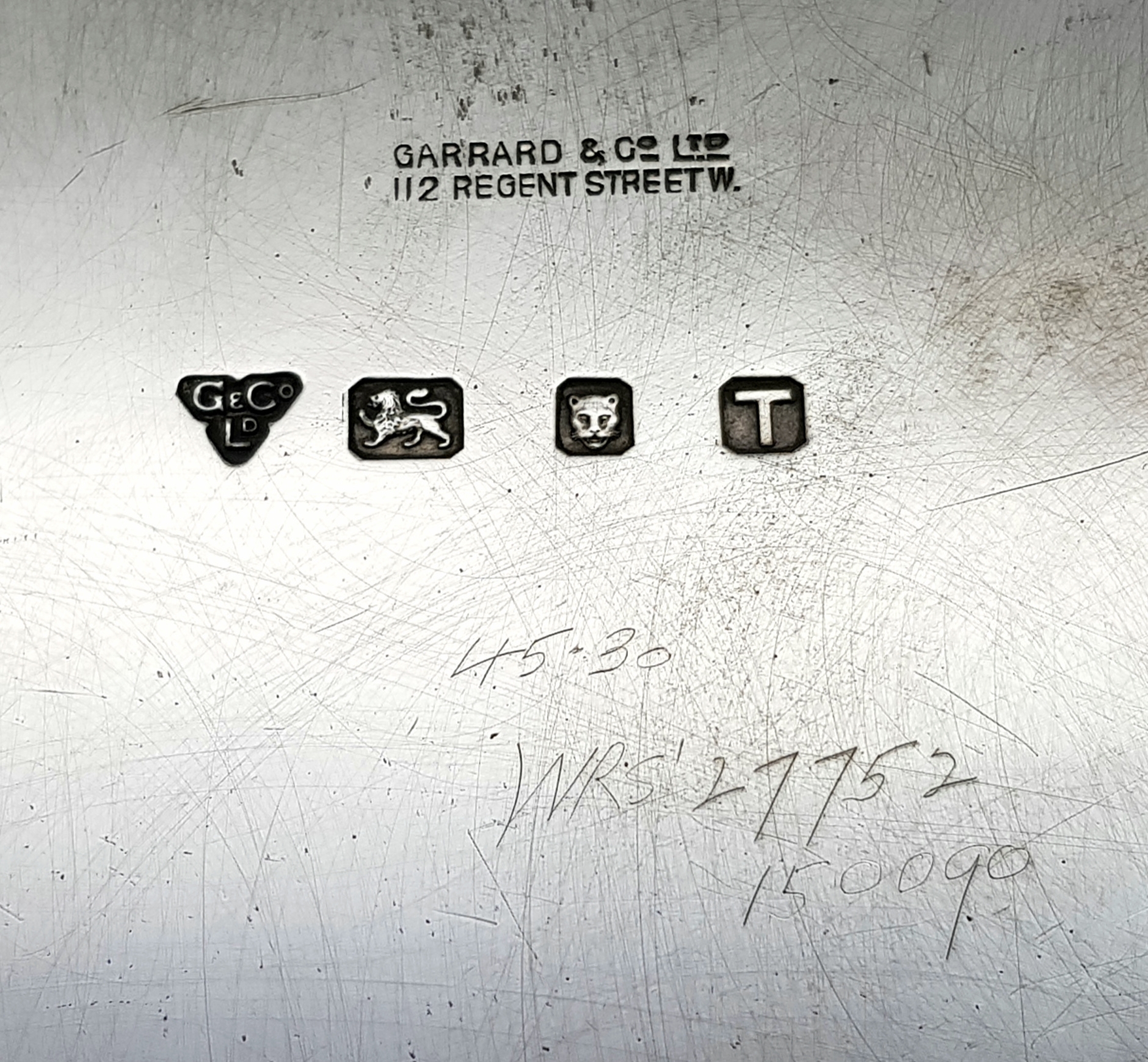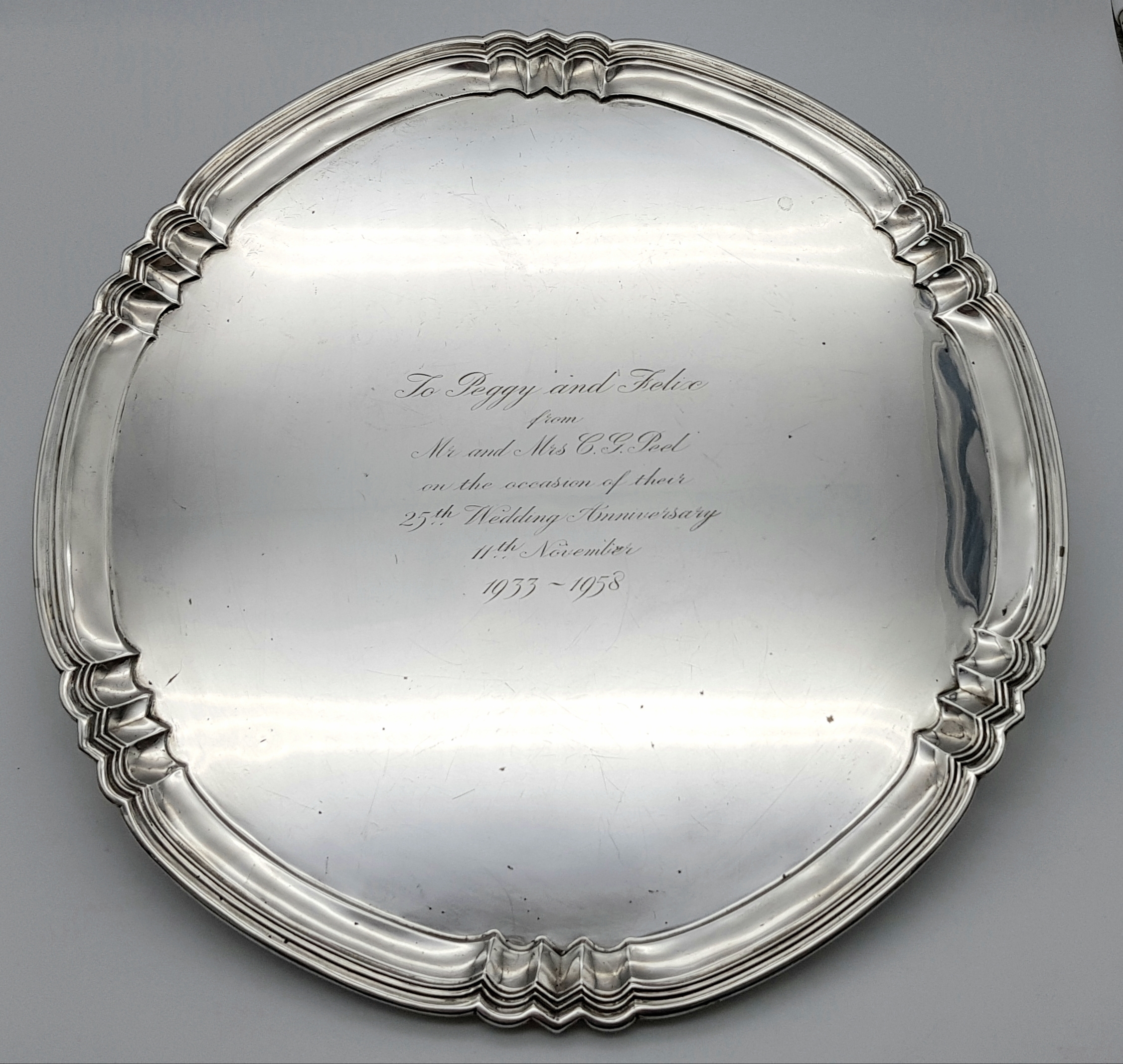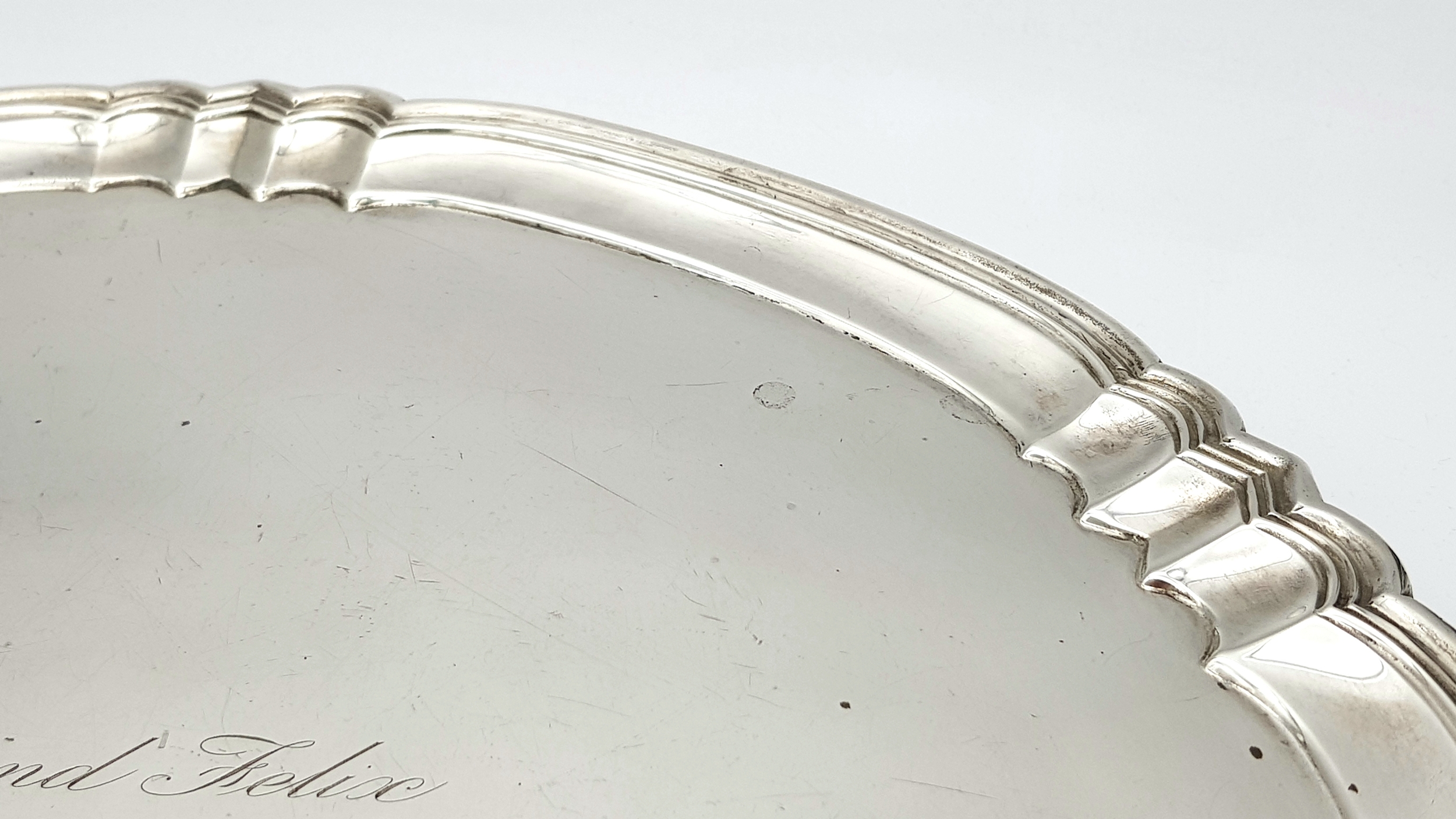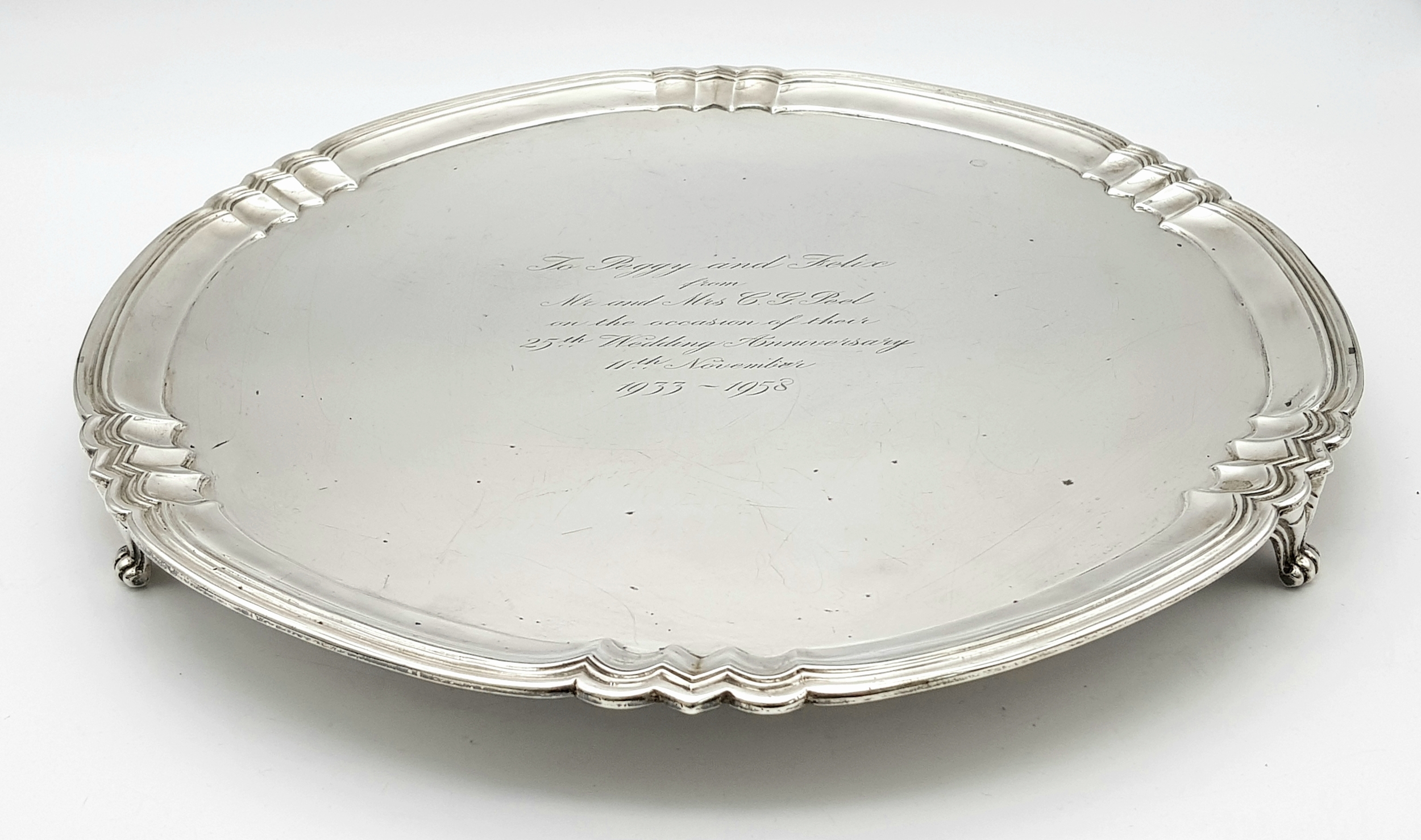 A Vintage Garrard and Co. Sterling Silver Salver. Originally a wedding gift. Hallmarks for London 1954. 1.4 Kilograms. 35cm diameter.