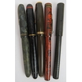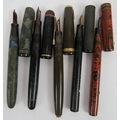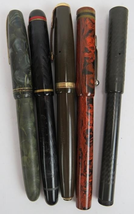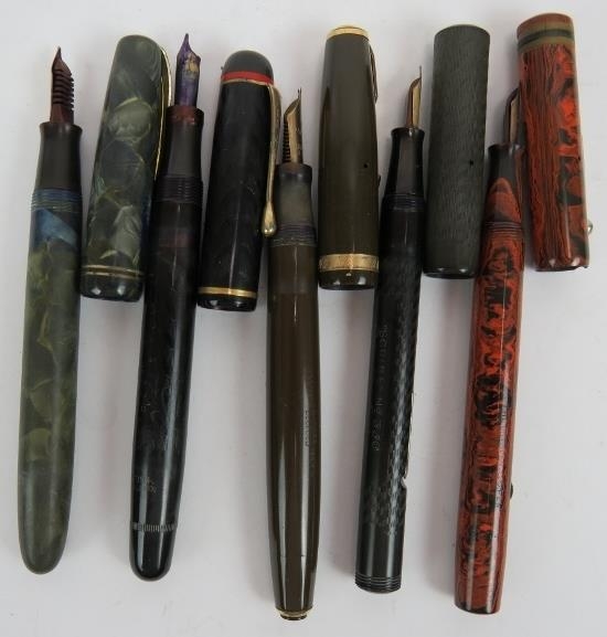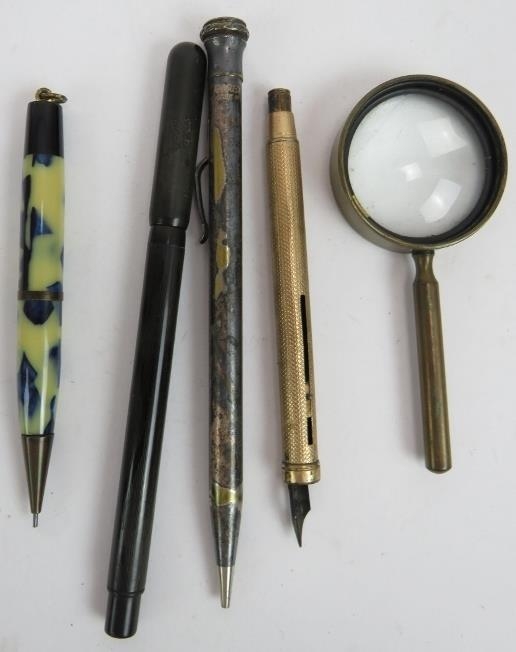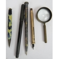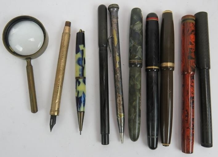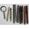 Five vintage fountain pens including a Parker Duo Fold, Esterbrook Relief, Burnham No 55, Conway Stewart 470M and 330 plus two pencils, two pens and a magnifier. (10).