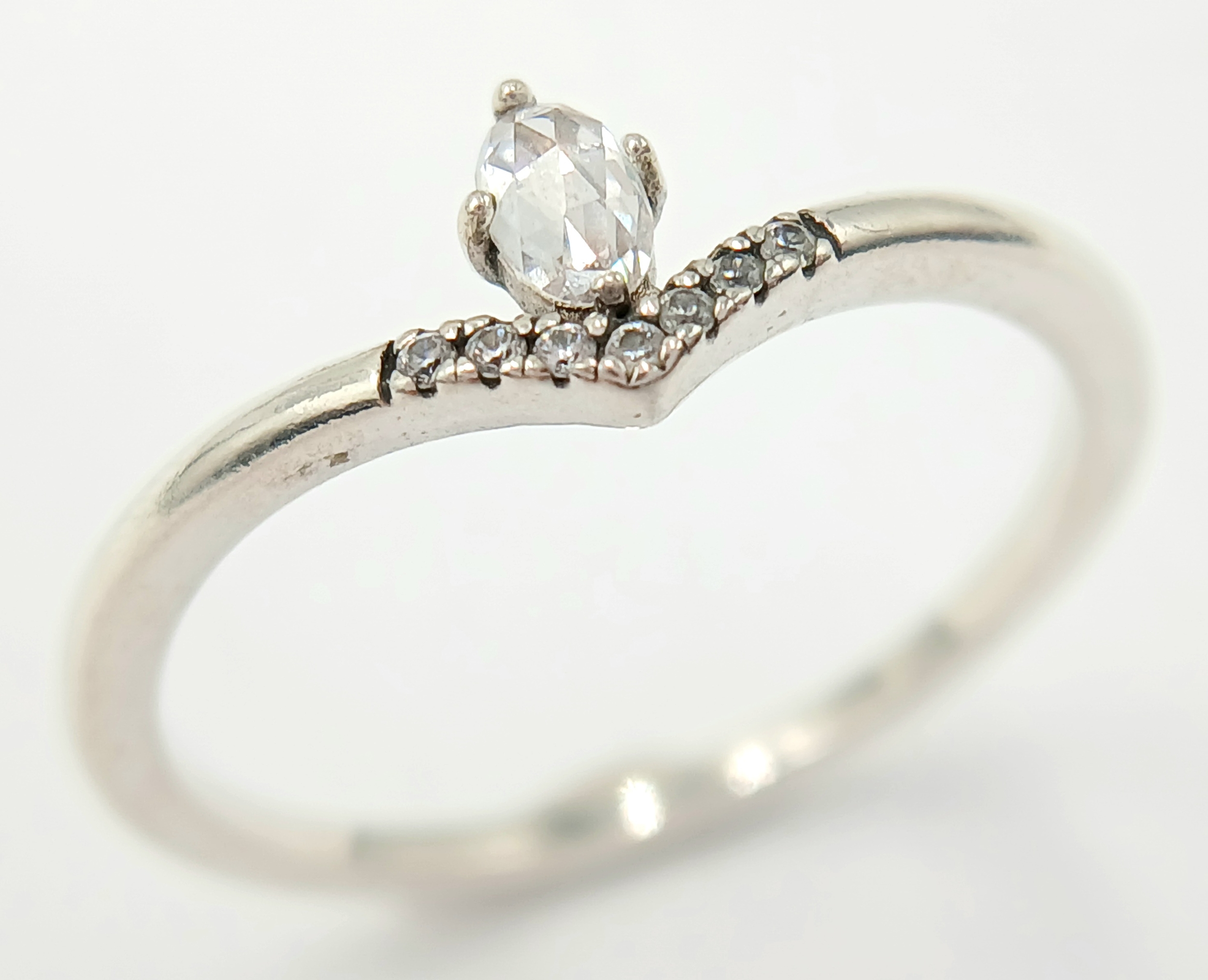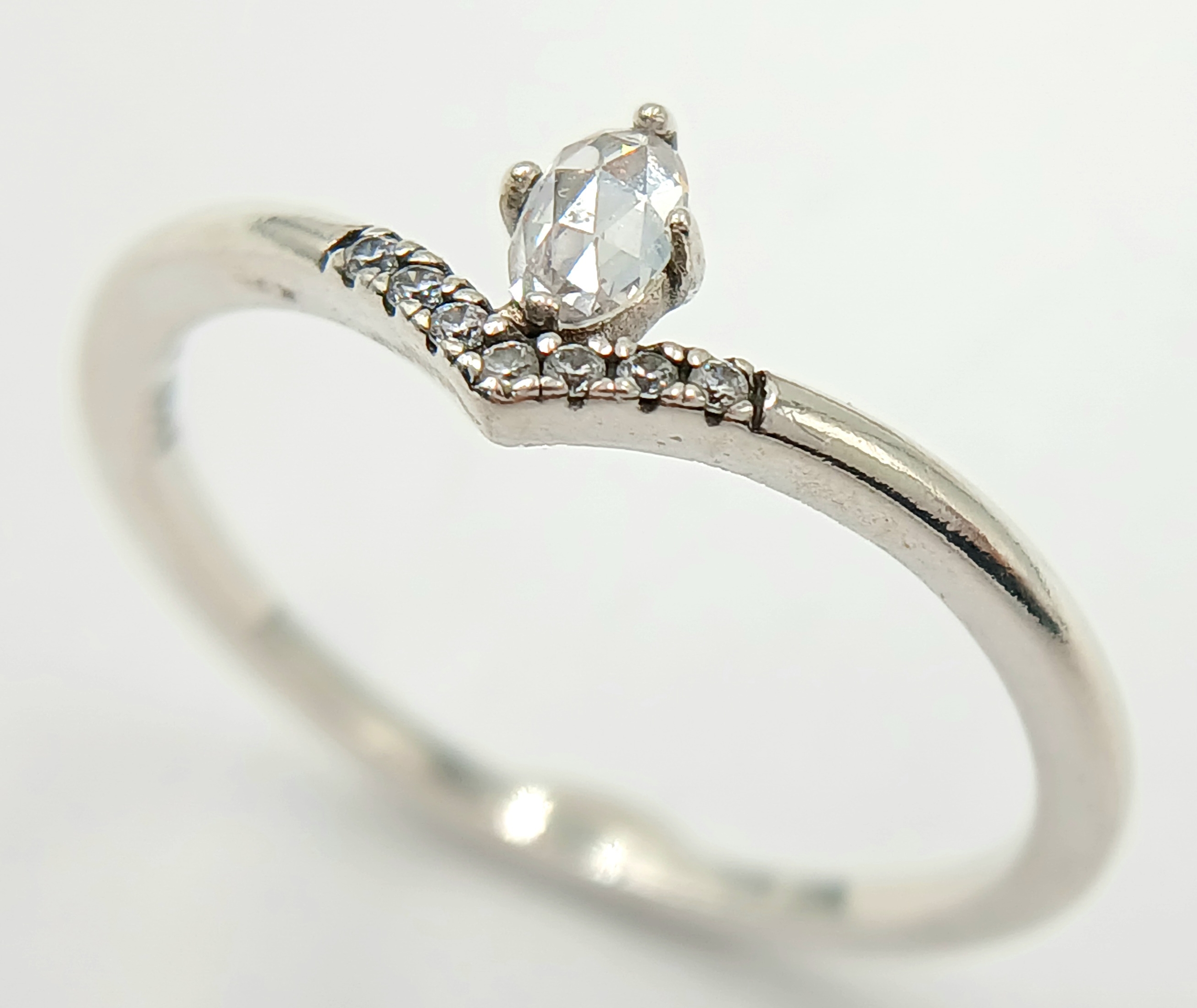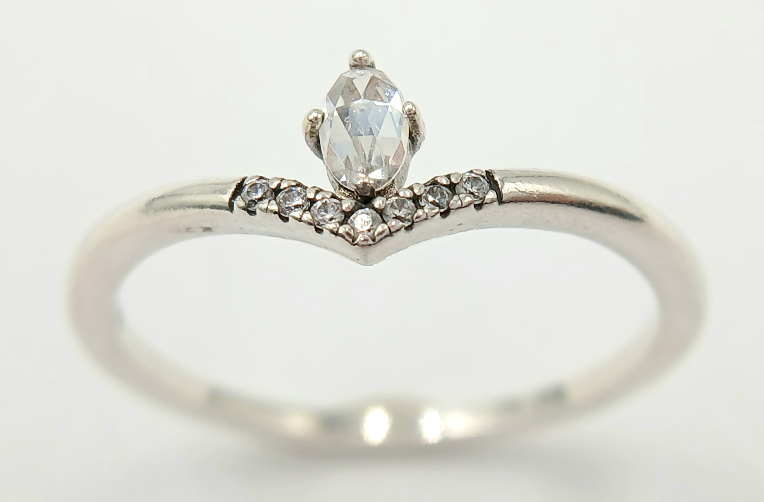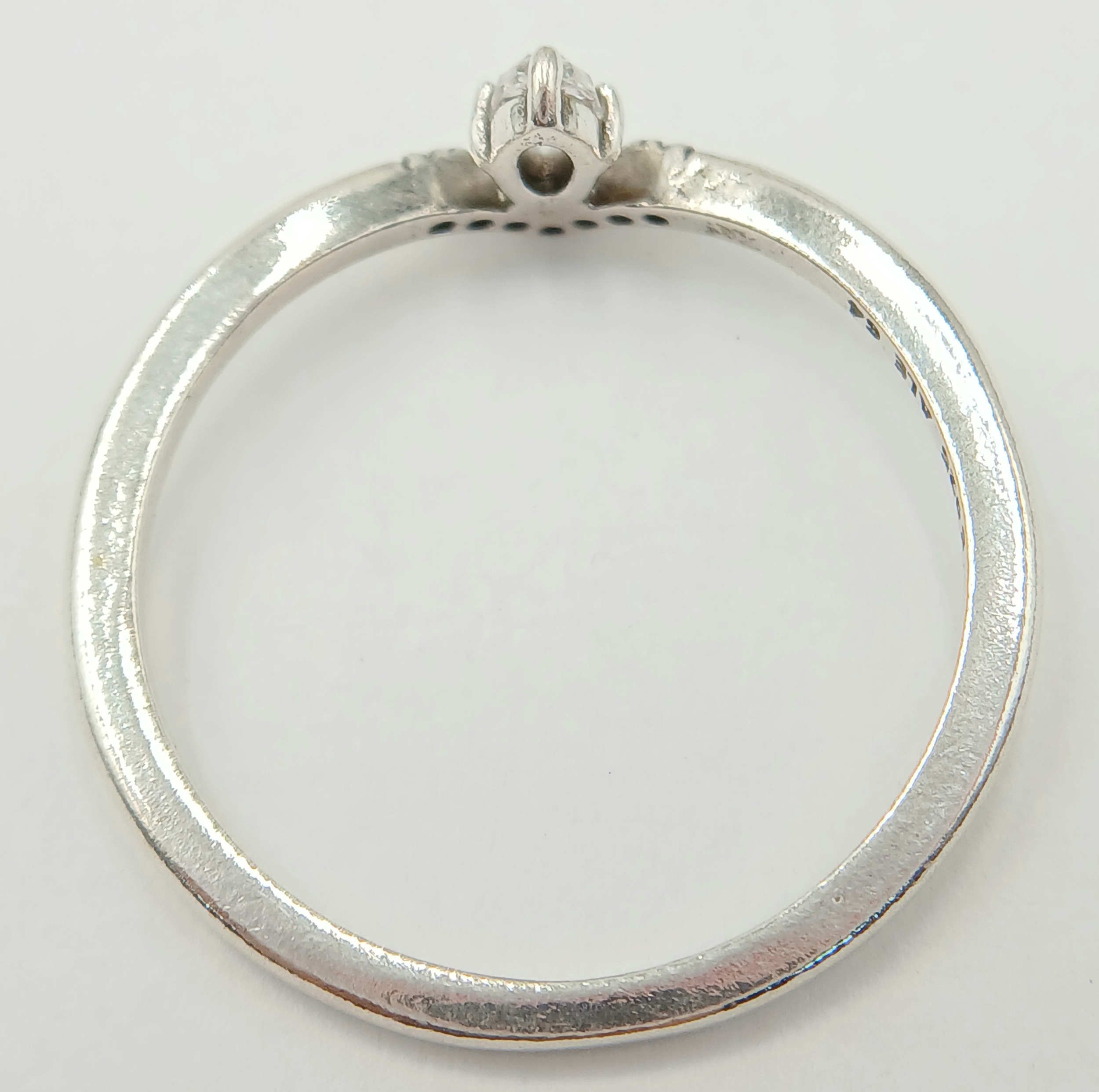 A fancy Pandora 925 silver CZ set ring. Total weight 2G. Size V/W.
