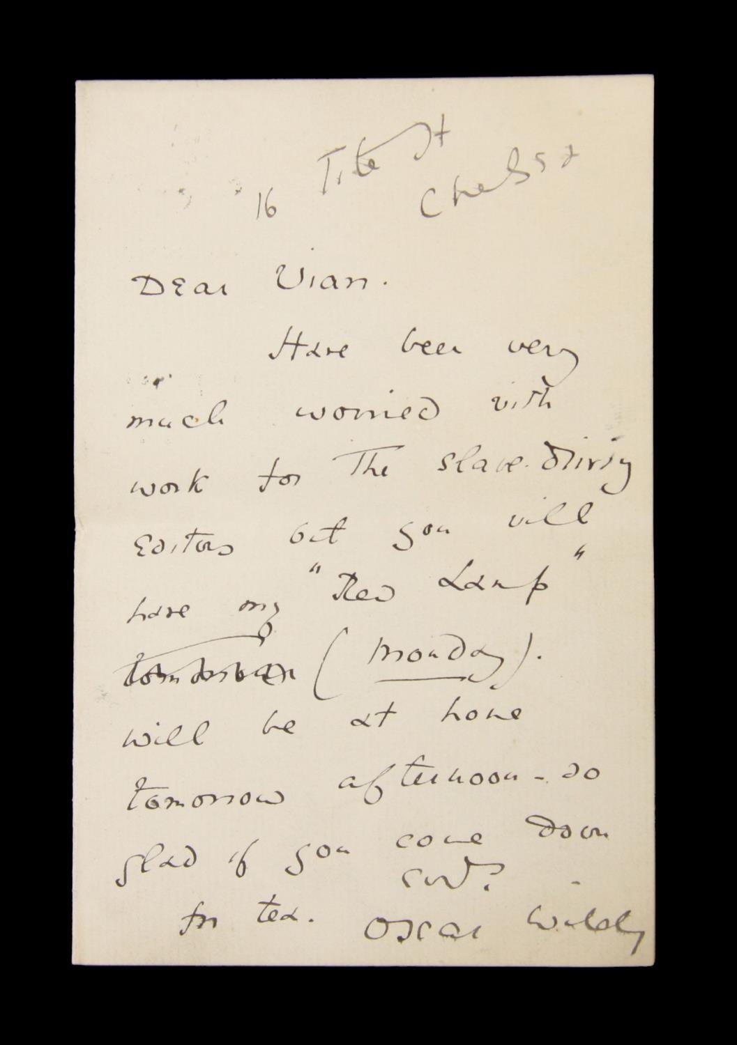 Oscar WILDE (Oscar Fingal O'Flahertie Wills Wilde (1854-1900), als to Alsager VIAN (Alsager Richard Vian 1863-1924, Editor Court & Society Review), undated 1886/7, folded octavo, single page of text, hand written, 16, Tite Street, Chelsea, Dear Vian Have been very much worried with work for The slave driving Editors but you will have my ''New Lamp'' tomorrow (the word 'tomorrow' has been crossed through) ( Monday). Will be at home tomorrow afternoon - so glad if you come down for tea. Yours truly, Oscar Wilde