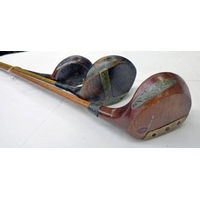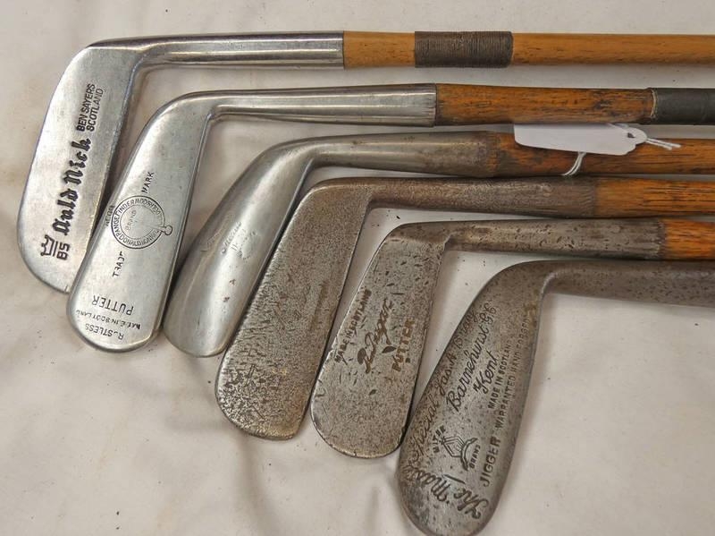 6 HICKORY SHAFTED GOLF CLUBS TO INCLUDE A PUTTER BY DONALDSON, AULD NIBLICK BY BEN SAYERS, JIGGER BY BARNEHURST KENT, IRON BY J BRAID AND TWO OTHERS -6-