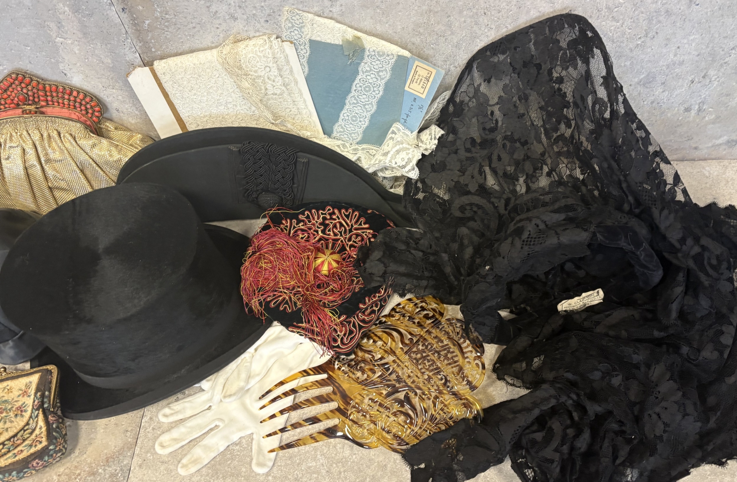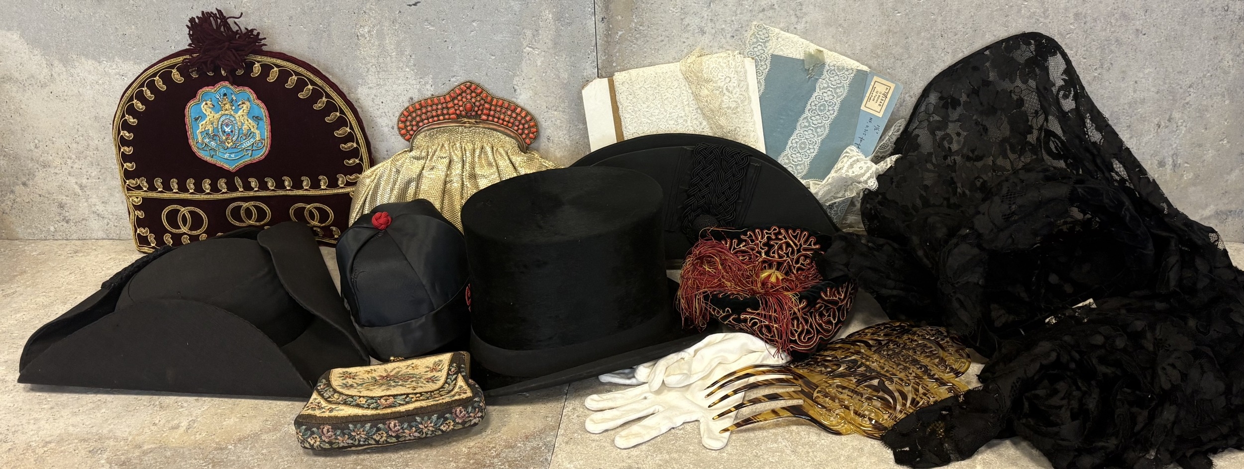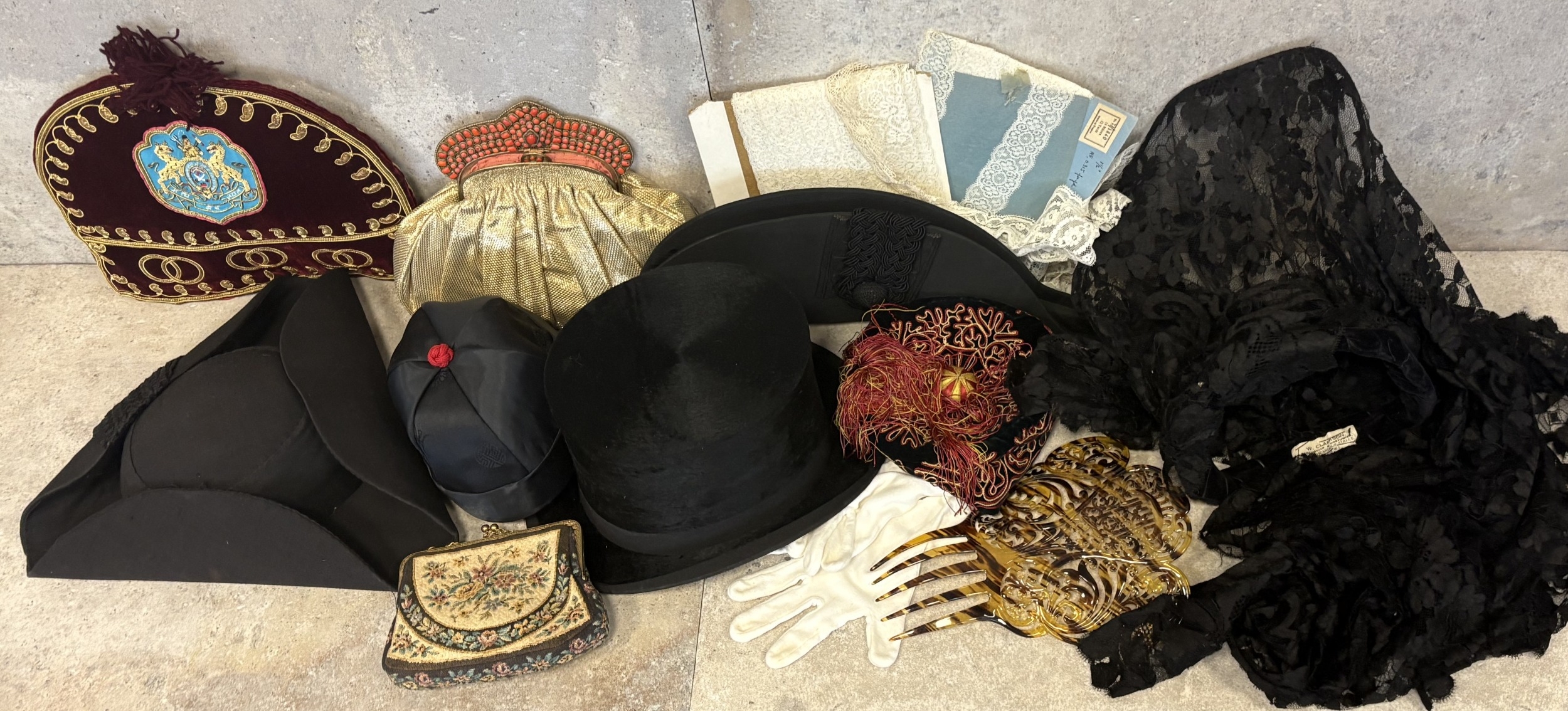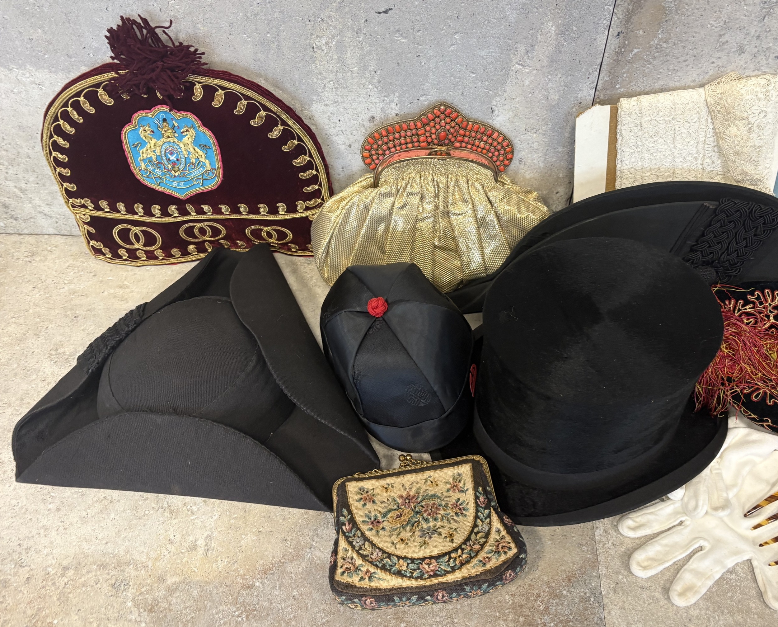 A vintage John A Hogg top hat together with an Ede & Ravenscroft tricorn hat, other hats, bags etc. Est. £40 - £60.