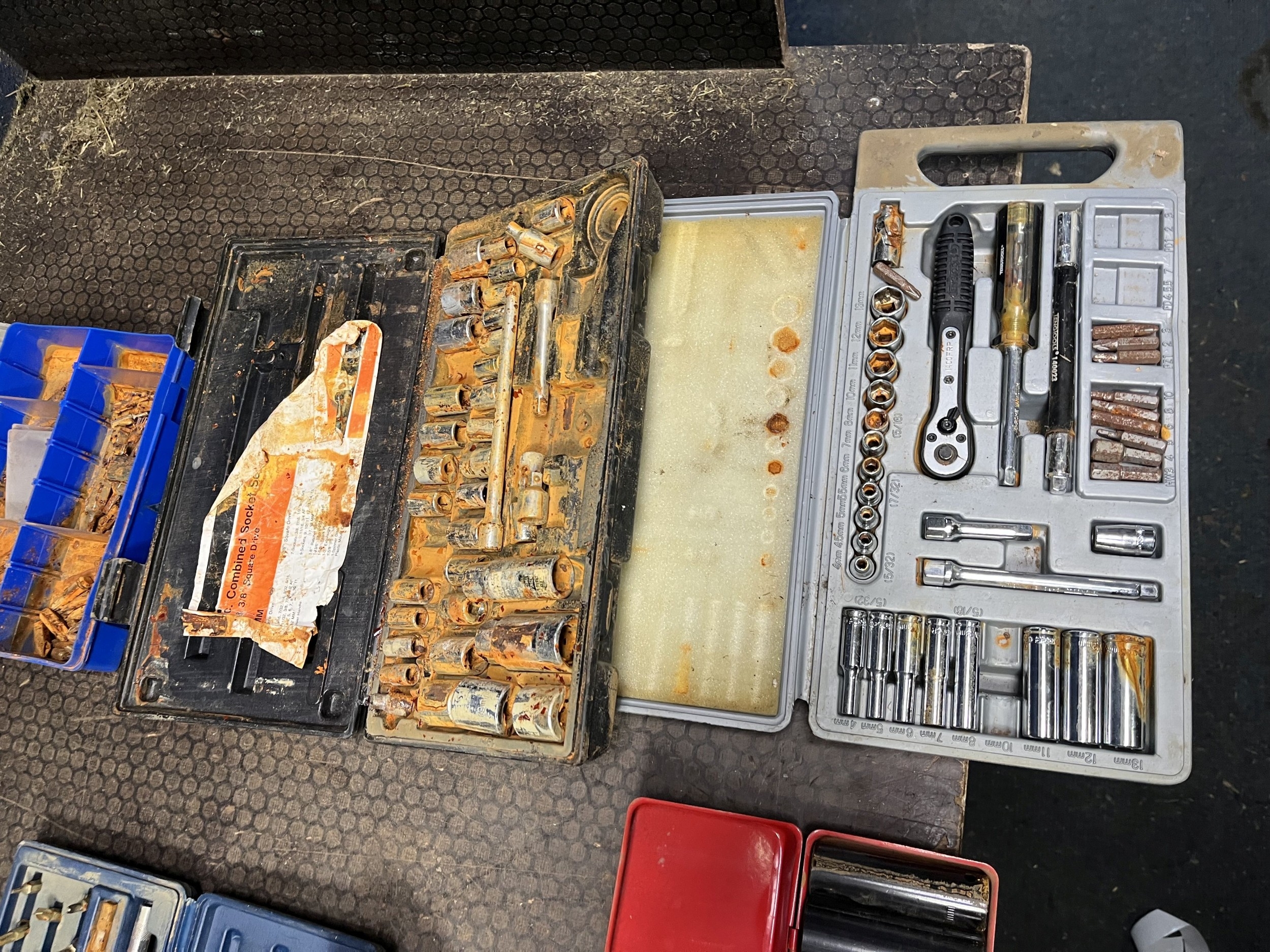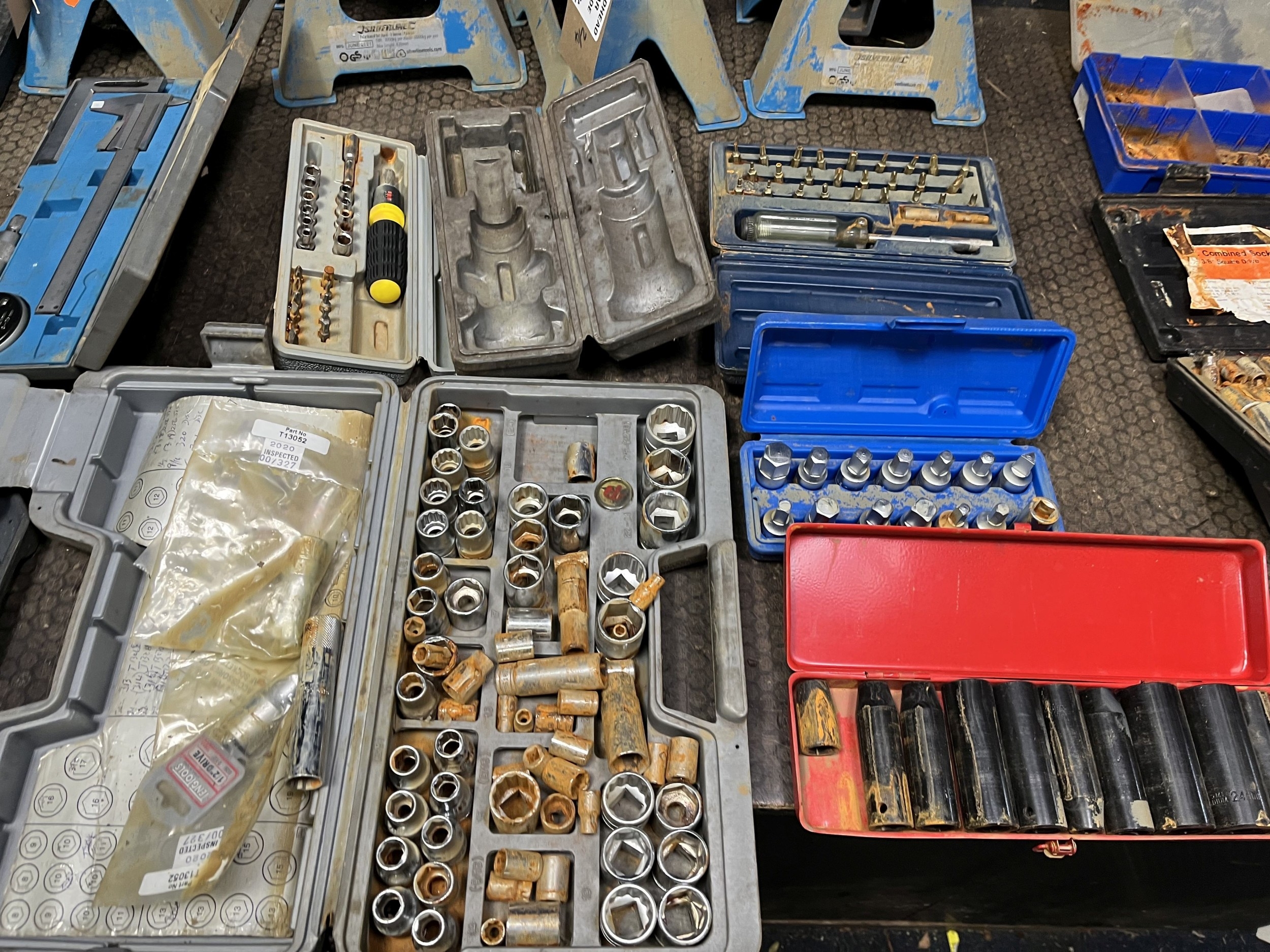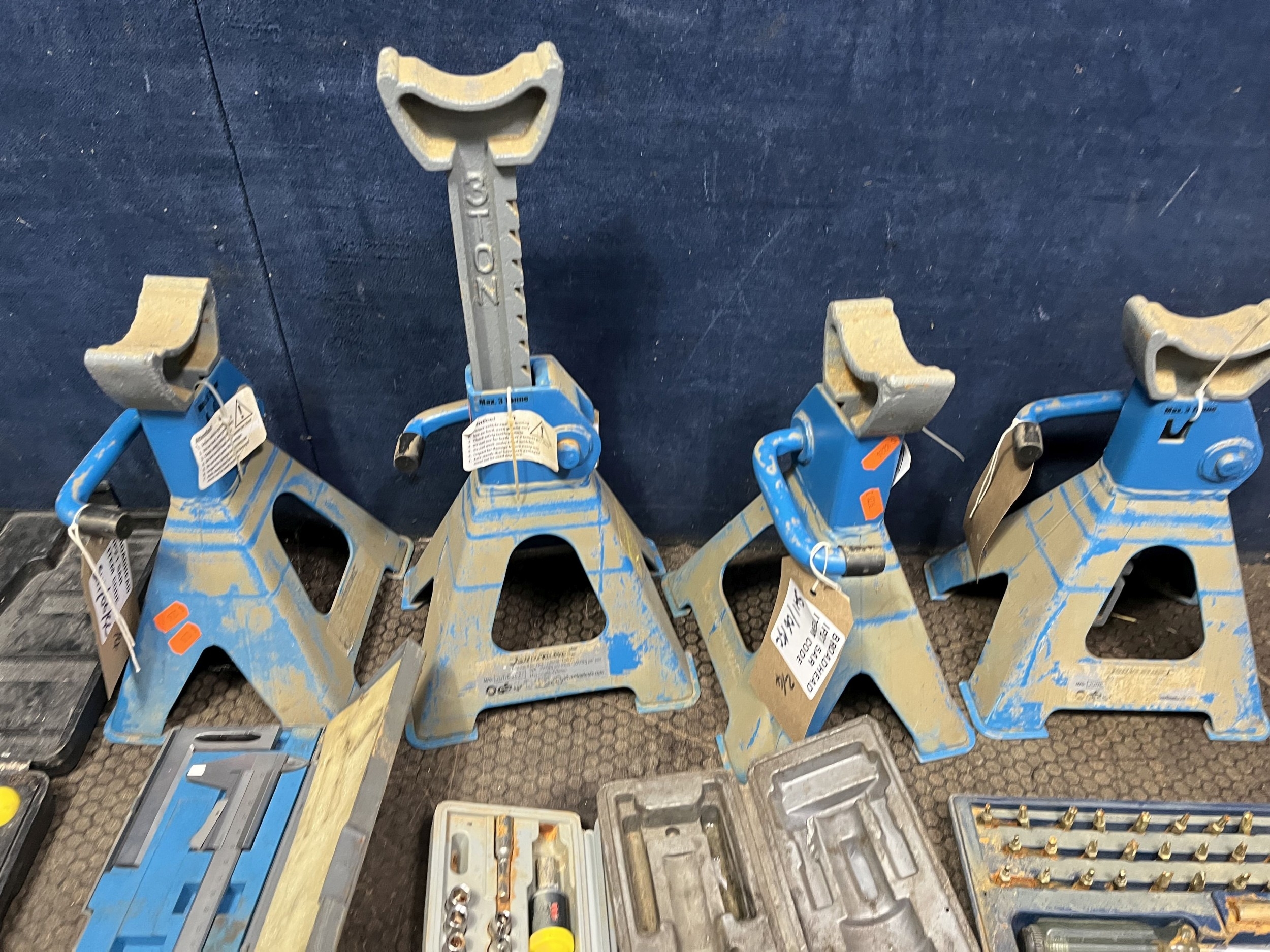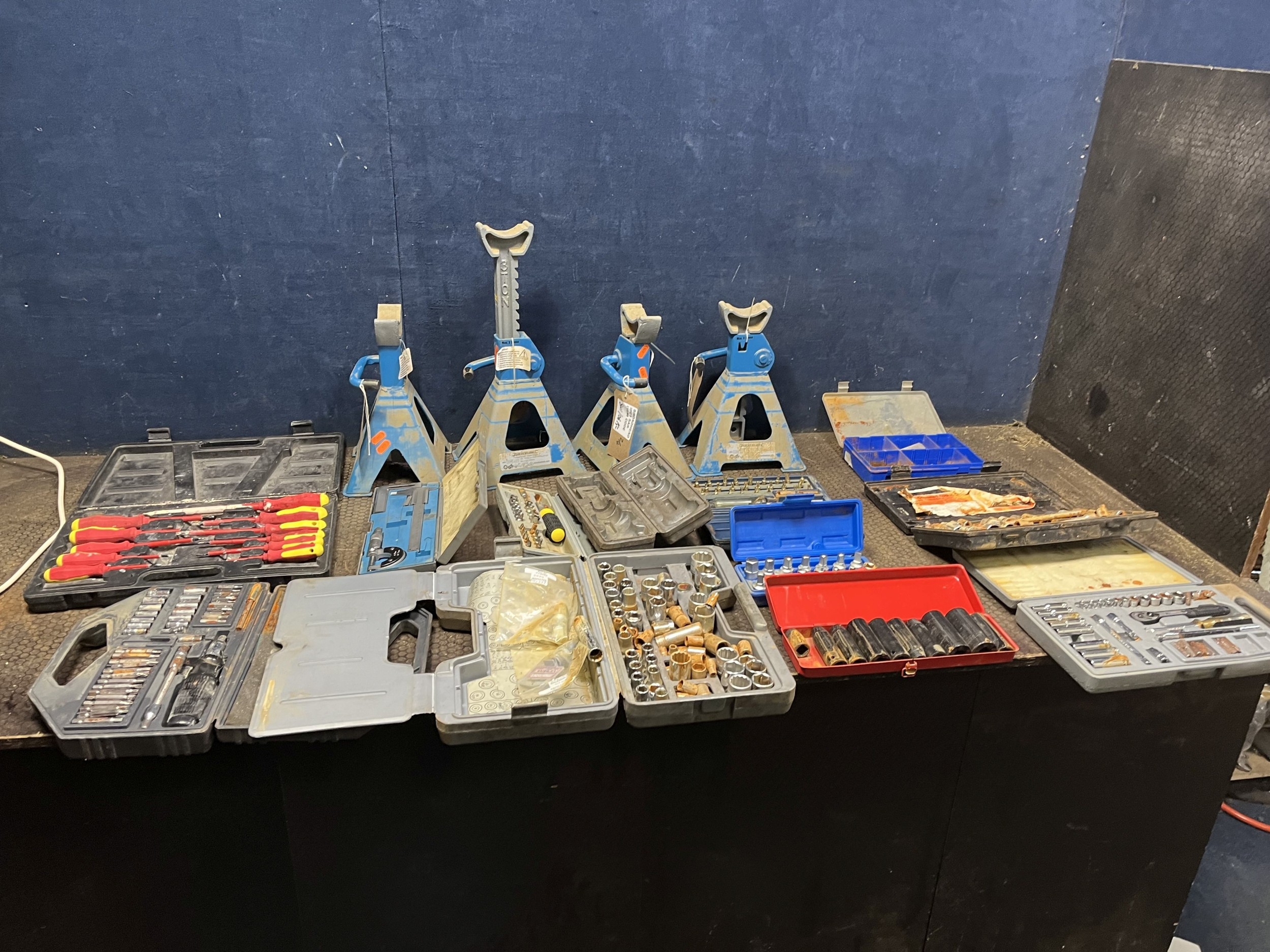A COLLECTION OF AUTOMOTIVE TOOLS: including two pairs of Silverline ratchet axle stands, Sealey, Kamasa, Teng socket sets, etc (16)