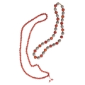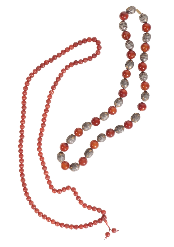 AN AGATE AND SILVER BEAD NECKLACE, YEMEN, together with another agate bead necklace (2)