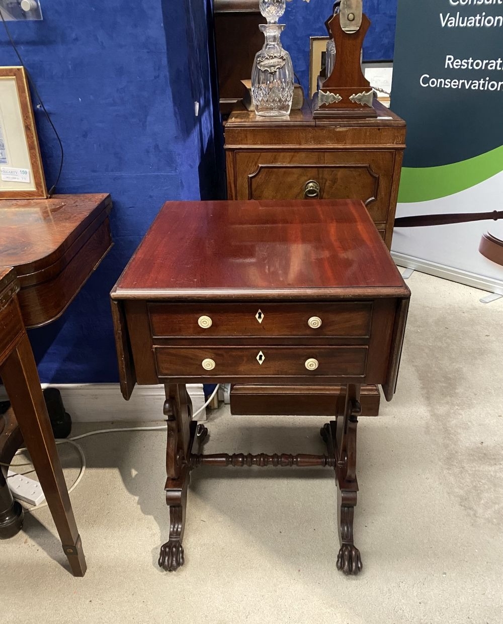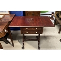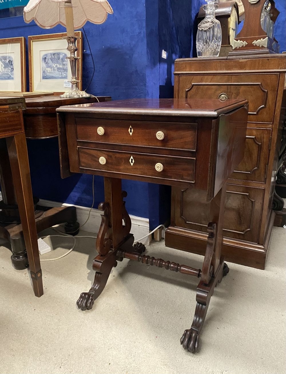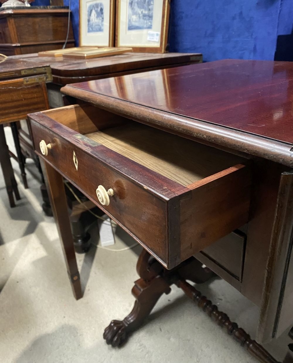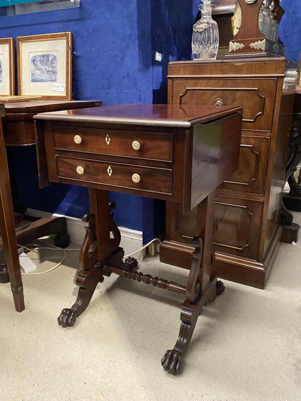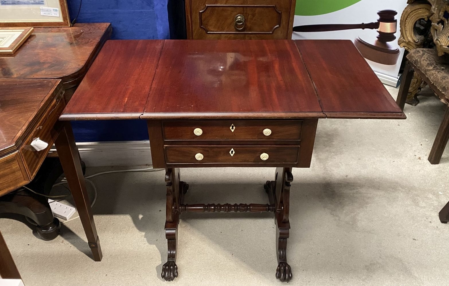 A WILLIAM IV DROP LEAF TWO DRAWER TABLE, the drop leaves with canted corners, the two drawers to front with carved bone handles and escutcheons. All raised on pod base with scroll carvings to sides, joined by turned cross stretcher, with downturned fluted legs on paw feet with castors. In overall good condition, some wear as photographed commensurate with age, including small loss to inside of the right leaf. Dimensions: 48.5cm deep x 74cm high x 49cm with leaves down; 88.5cm wide with leaves up approx.