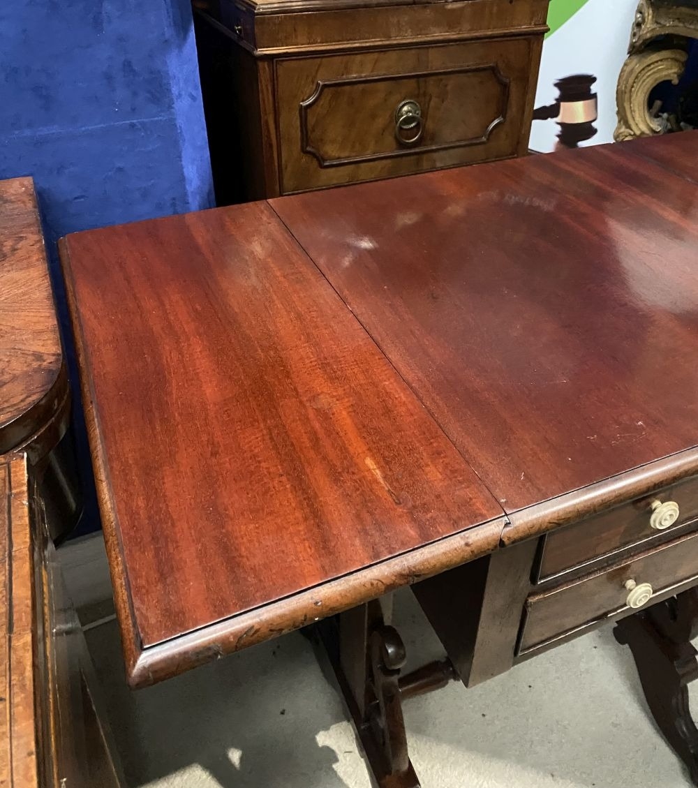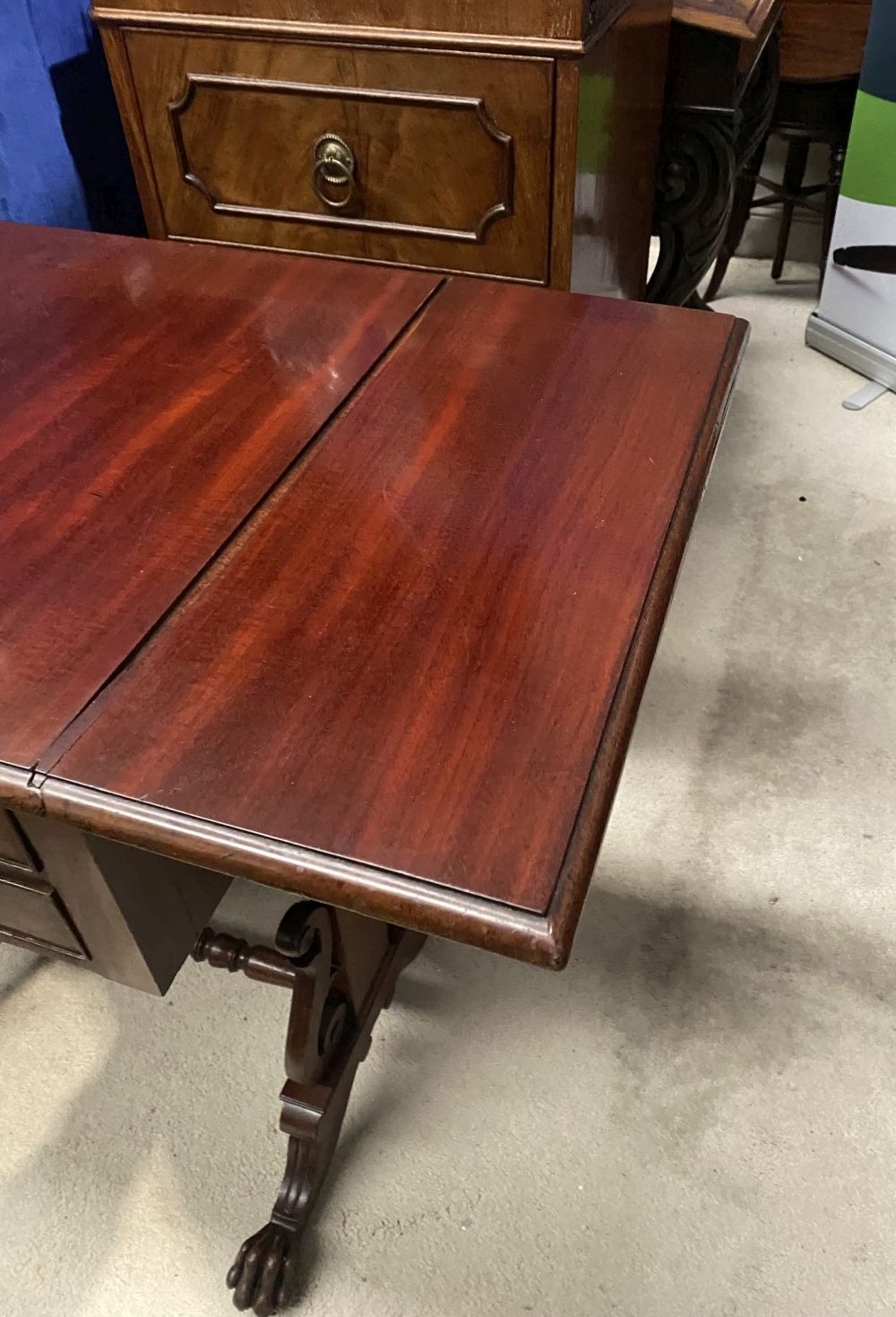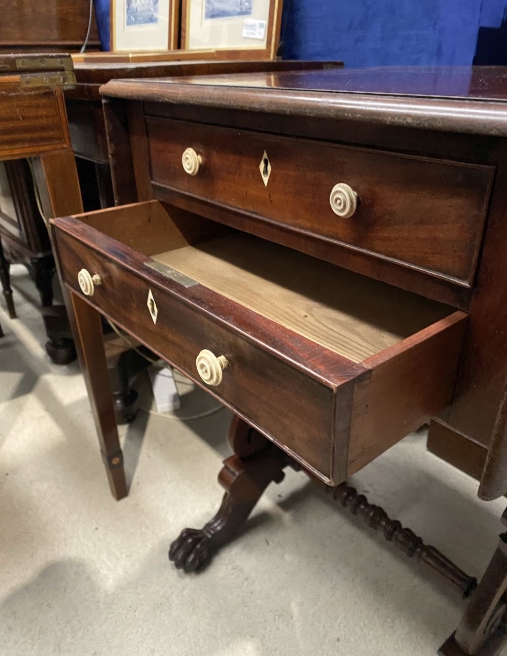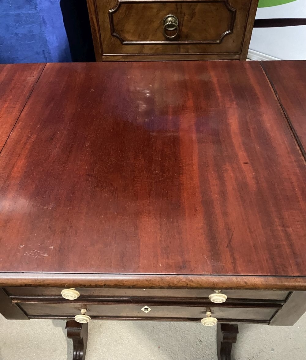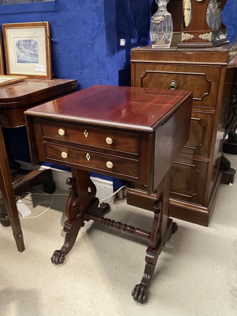 A WILLIAM IV DROP LEAF TWO DRAWER TABLE, the drop leaves with canted corners, the two drawers to front with carved bone handles and escutcheons. All raised on pod base with scroll carvings to sides, joined by turned cross stretcher, with downturned fluted legs on paw feet with castors. In overall good condition, some wear as photographed commensurate with age, including small loss to inside of the right leaf. Dimensions: 48.5cm deep x 74cm high x 49cm with leaves down; 88.5cm wide with leaves up approx.