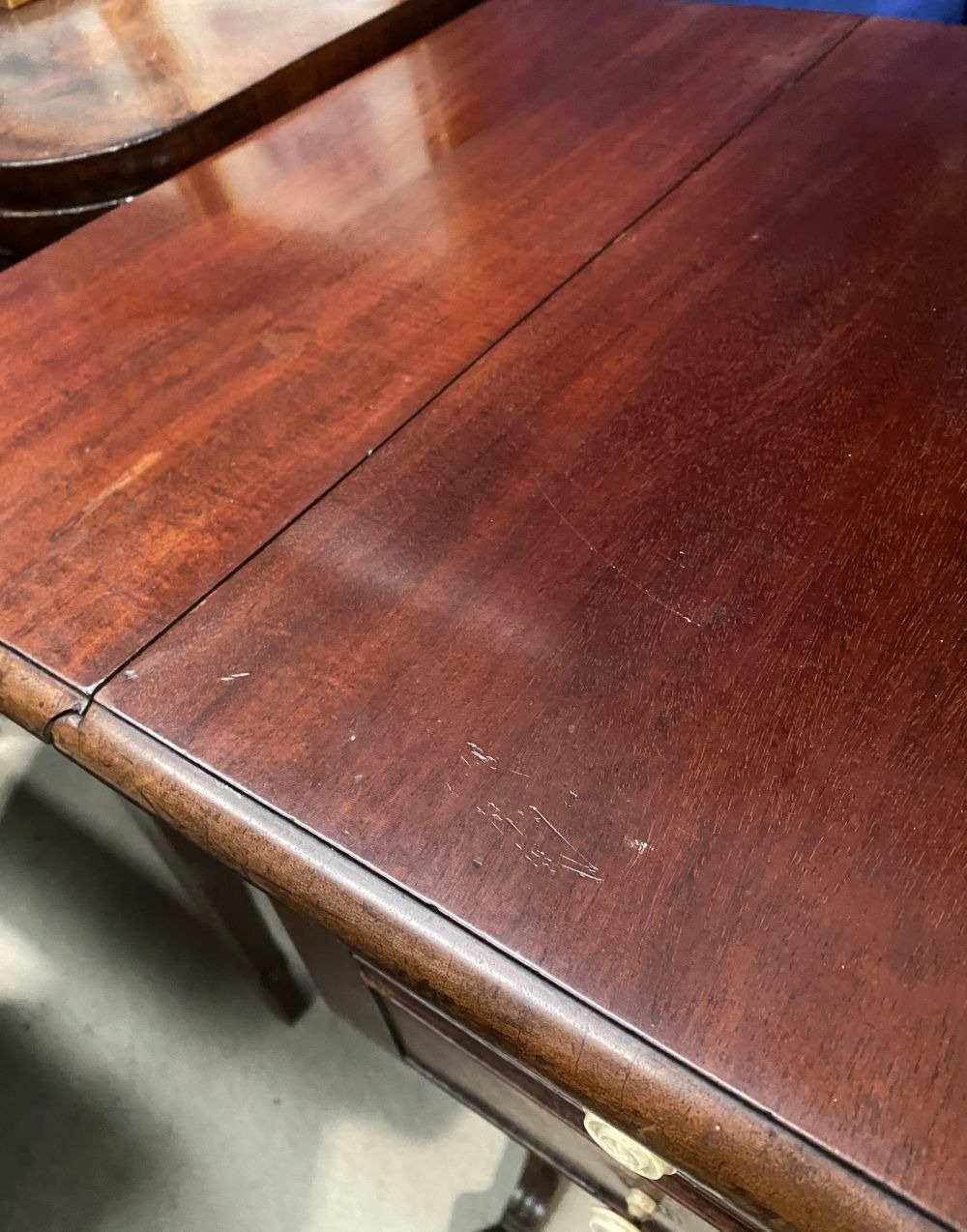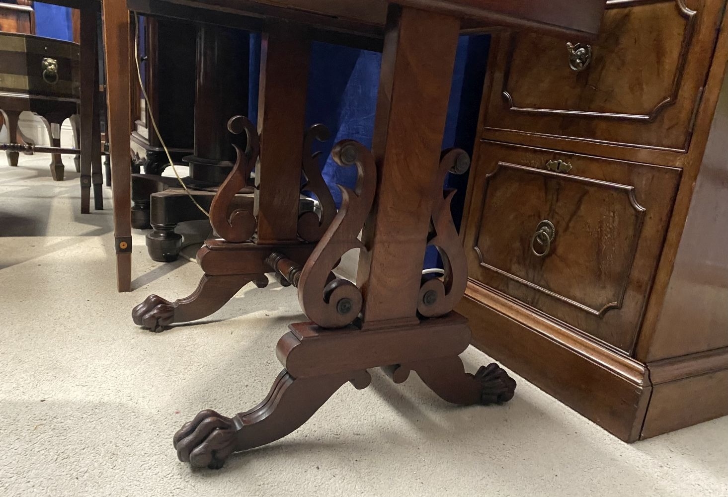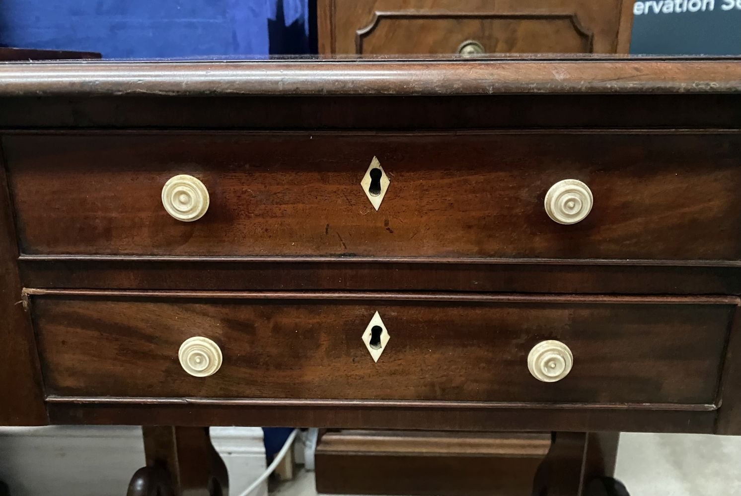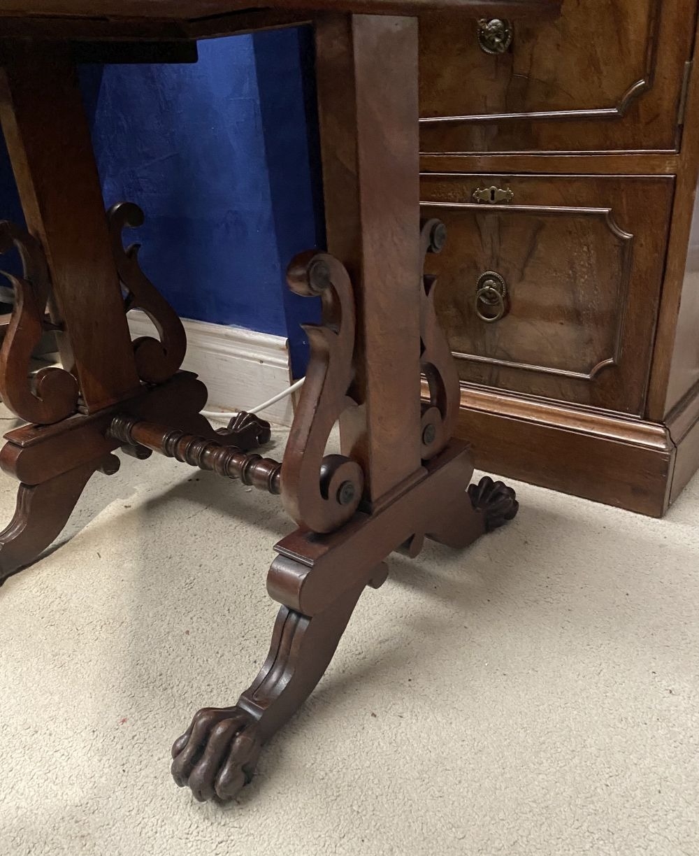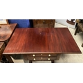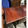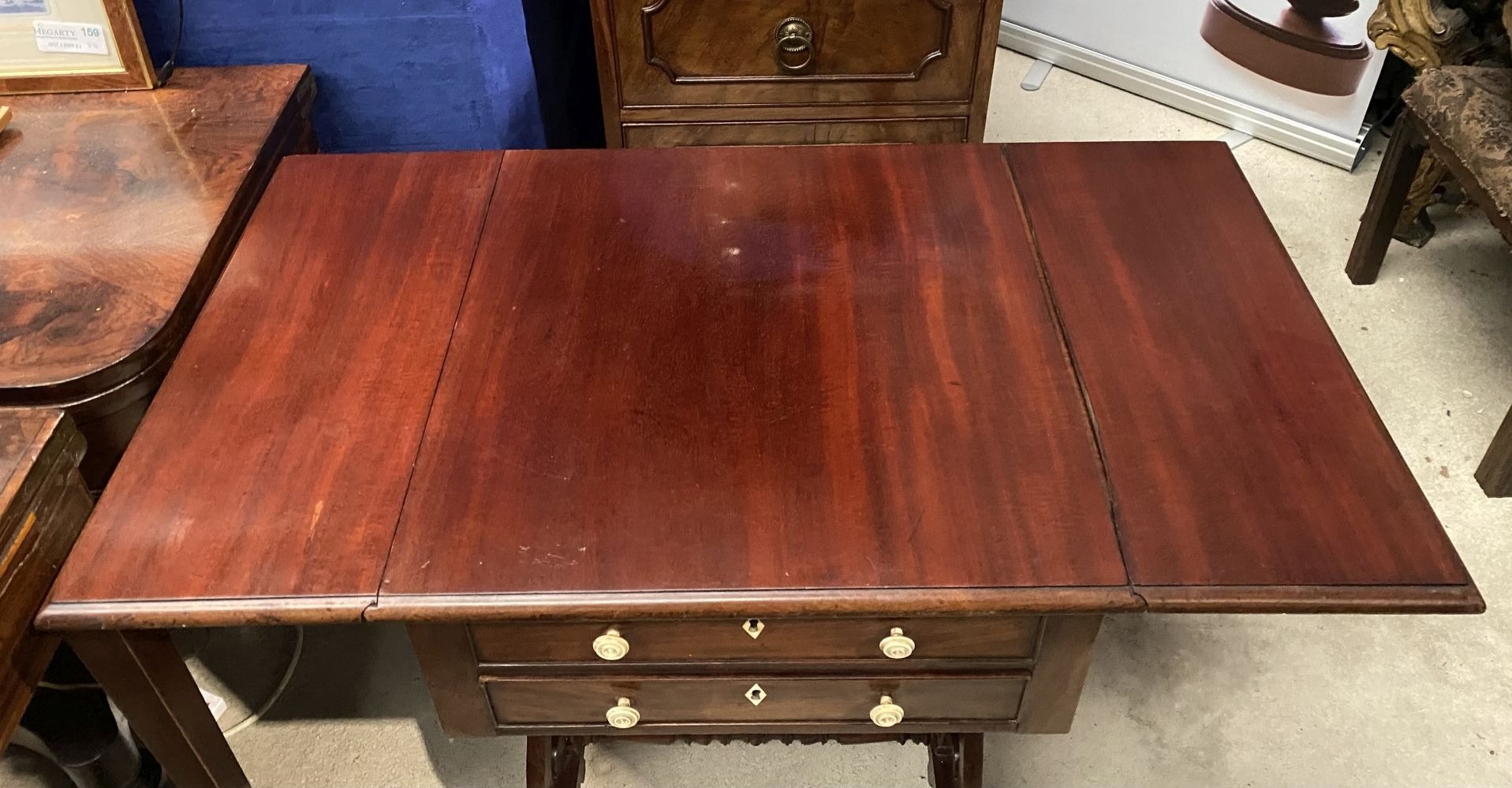 A WILLIAM IV DROP LEAF TWO DRAWER TABLE, the drop leaves with canted corners, the two drawers to front with carved bone handles and escutcheons. All raised on pod base with scroll carvings to sides, joined by turned cross stretcher, with downturned fluted legs on paw feet with castors. In overall good condition, some wear as photographed commensurate with age, including small loss to inside of the right leaf. Dimensions: 48.5cm deep x 74cm high x 49cm with leaves down; 88.5cm wide with leaves up approx.