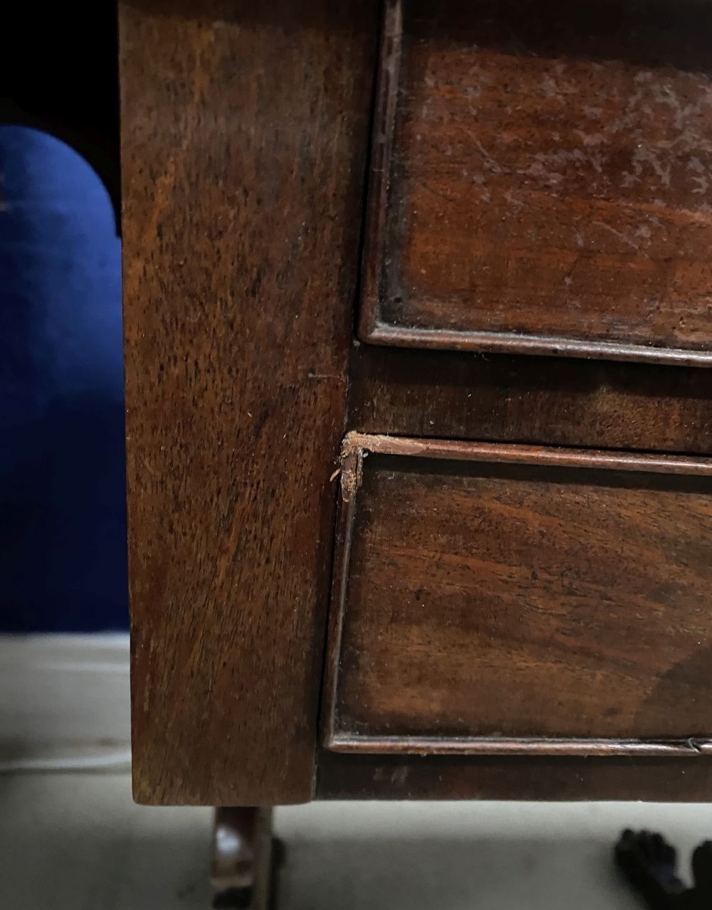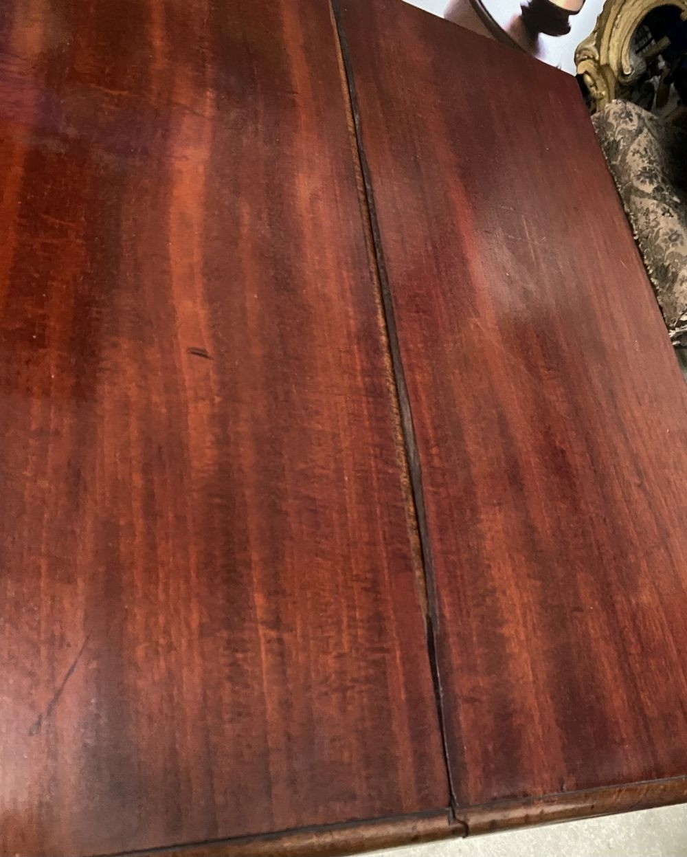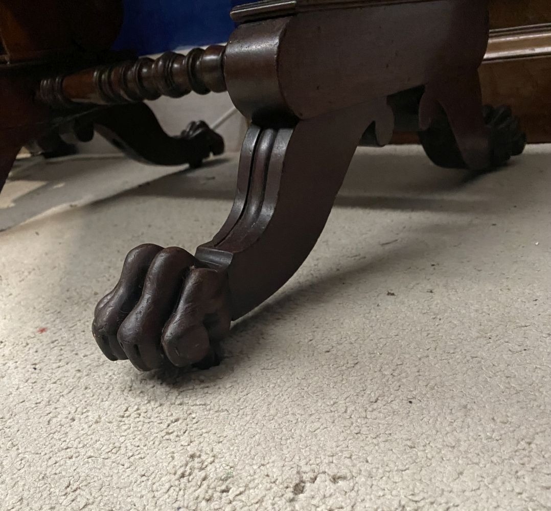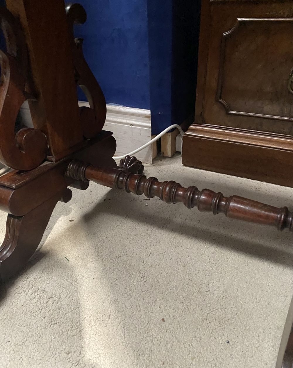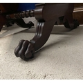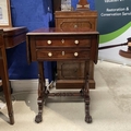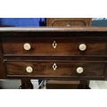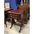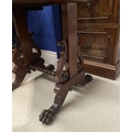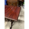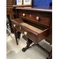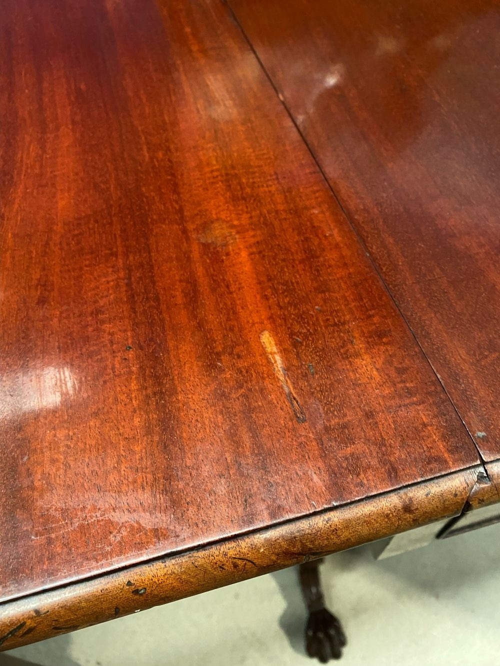 A WILLIAM IV DROP LEAF TWO DRAWER TABLE, the drop leaves with canted corners, the two drawers to front with carved bone handles and escutcheons. All raised on pod base with scroll carvings to sides, joined by turned cross stretcher, with downturned fluted legs on paw feet with castors. In overall good condition, some wear as photographed commensurate with age, including small loss to inside of the right leaf. Dimensions: 48.5cm deep x 74cm high x 49cm with leaves down; 88.5cm wide with leaves up approx.