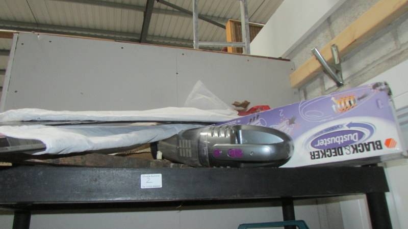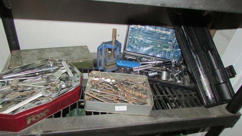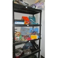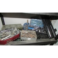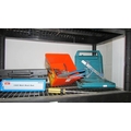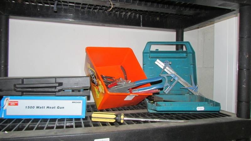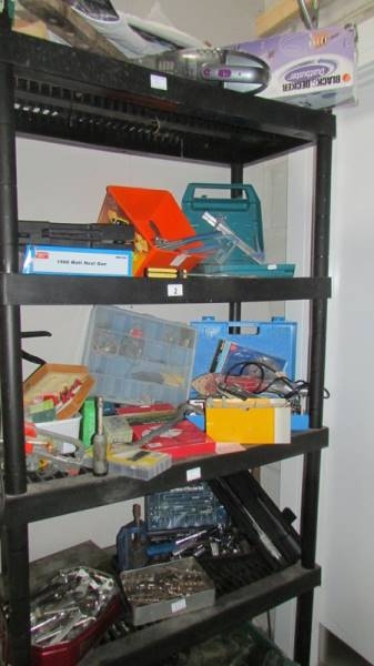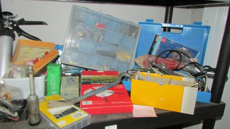 Four shelves of workshop tools and sundries including a ''Bricky'' and a Dustbuster. (Collect only)(Shelves not included)