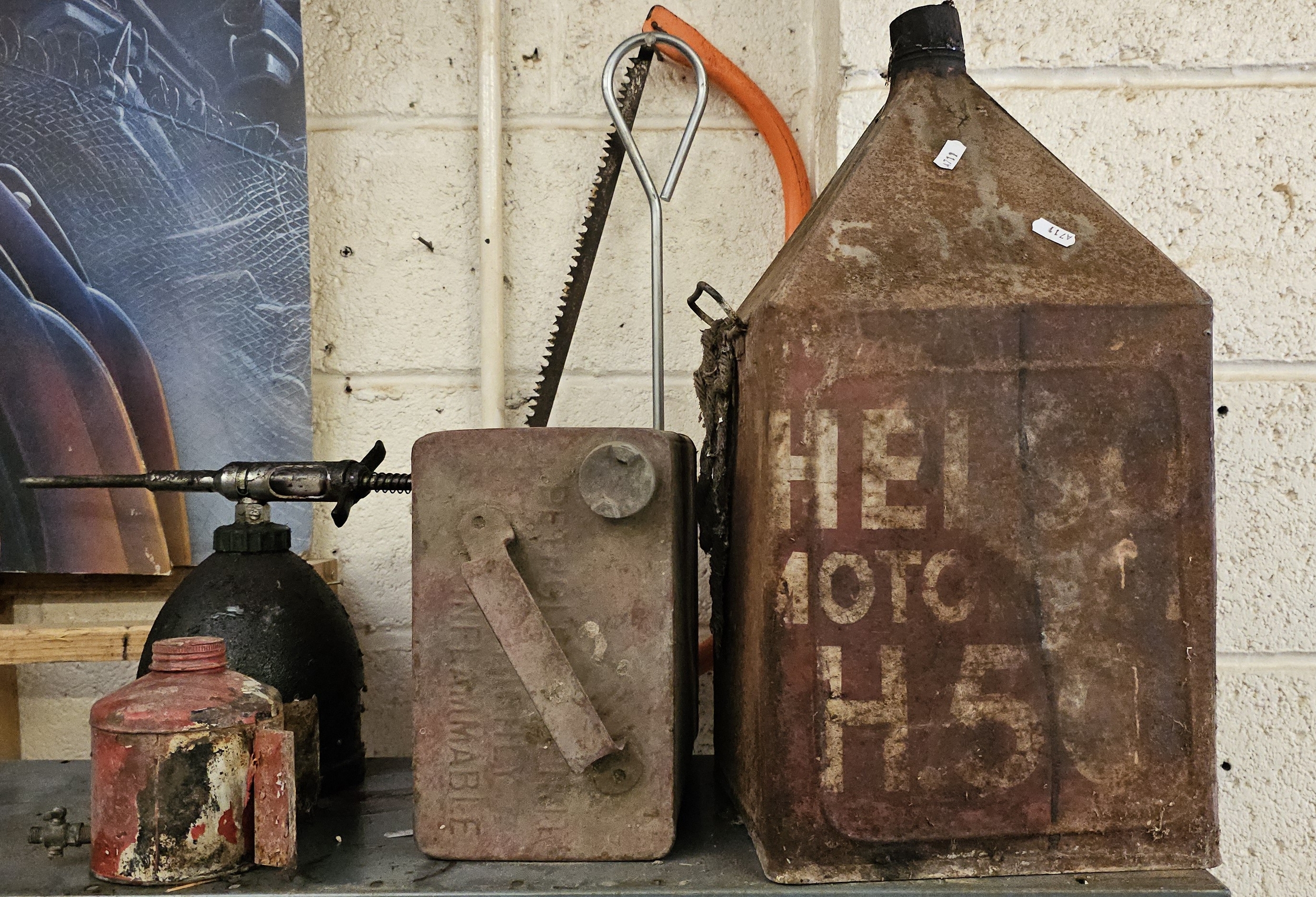 A Thelson Motor oil 5 gallon can, a two gallon petrol can and two other items (4)