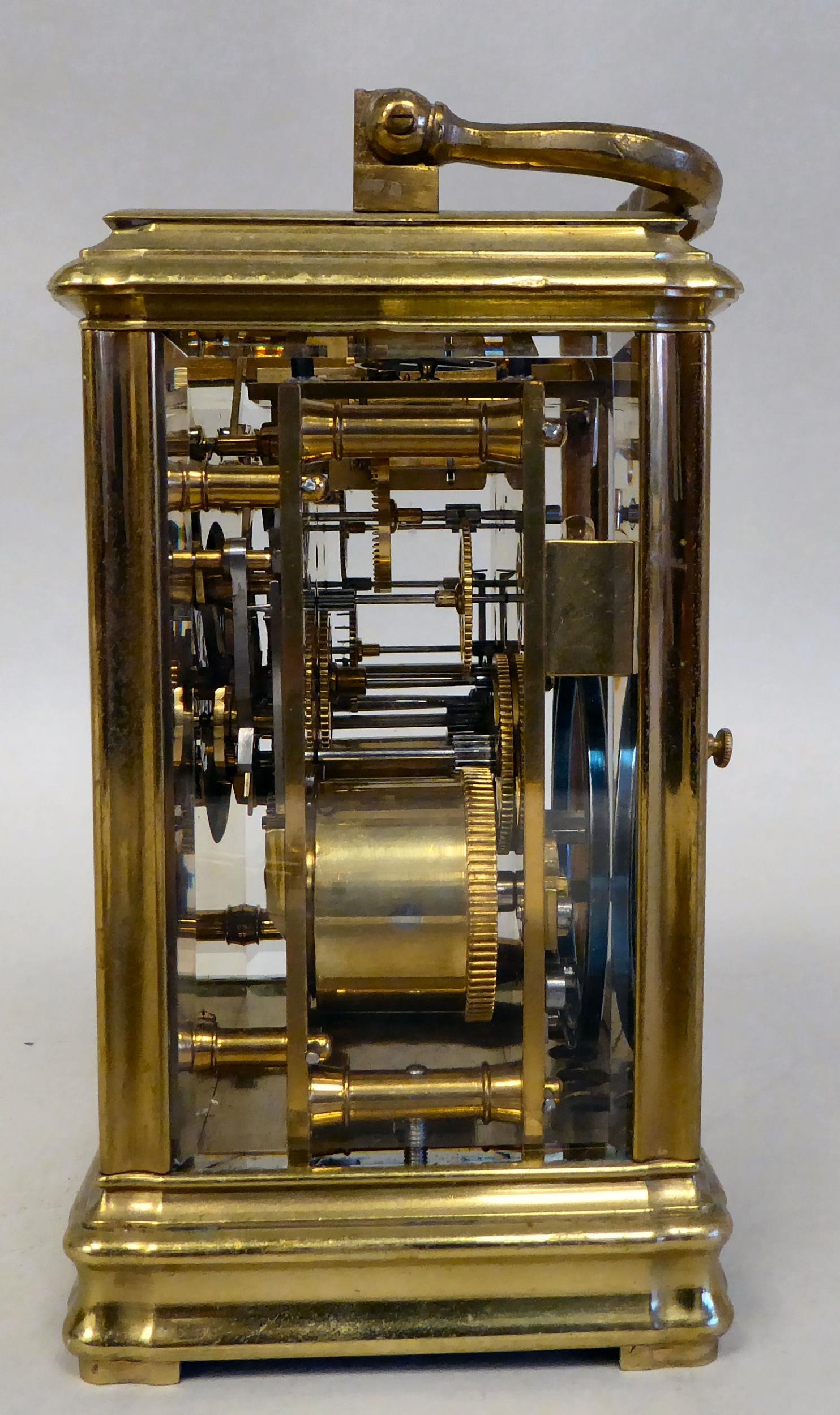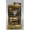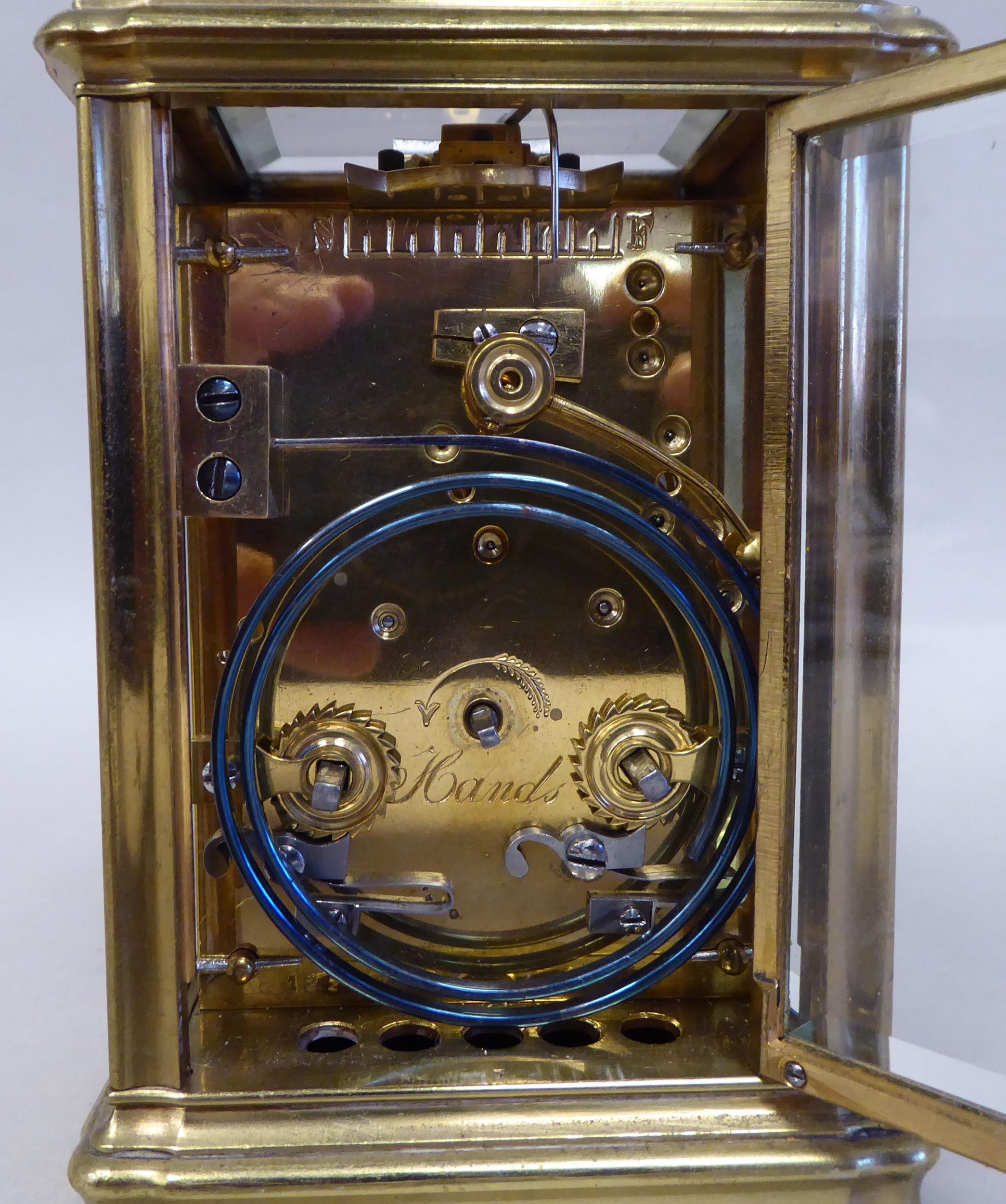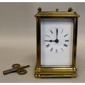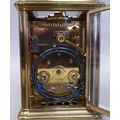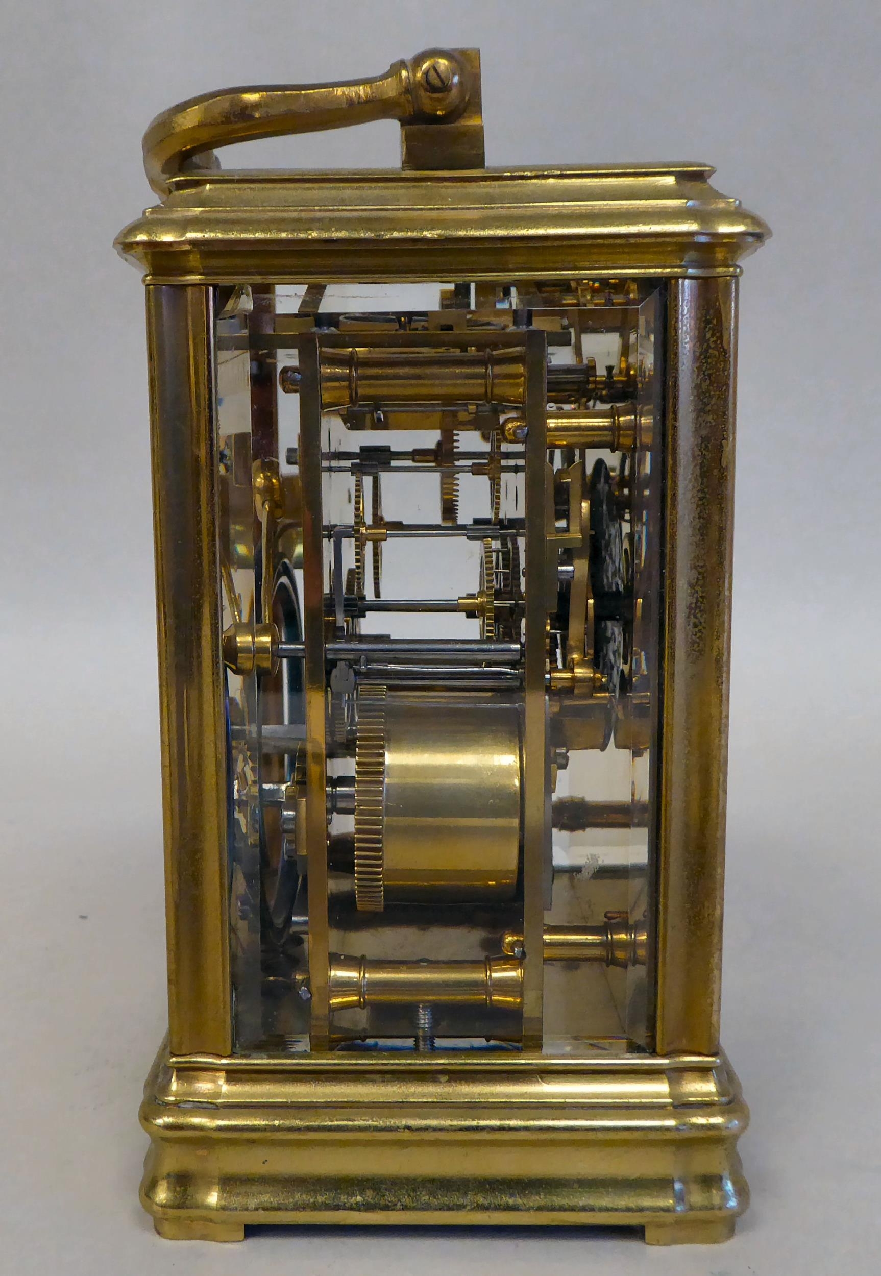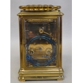 A lacquered brass travel clock with bevelled glass panels; the gong strike movement faced by an enamelled Roman dial 5"h