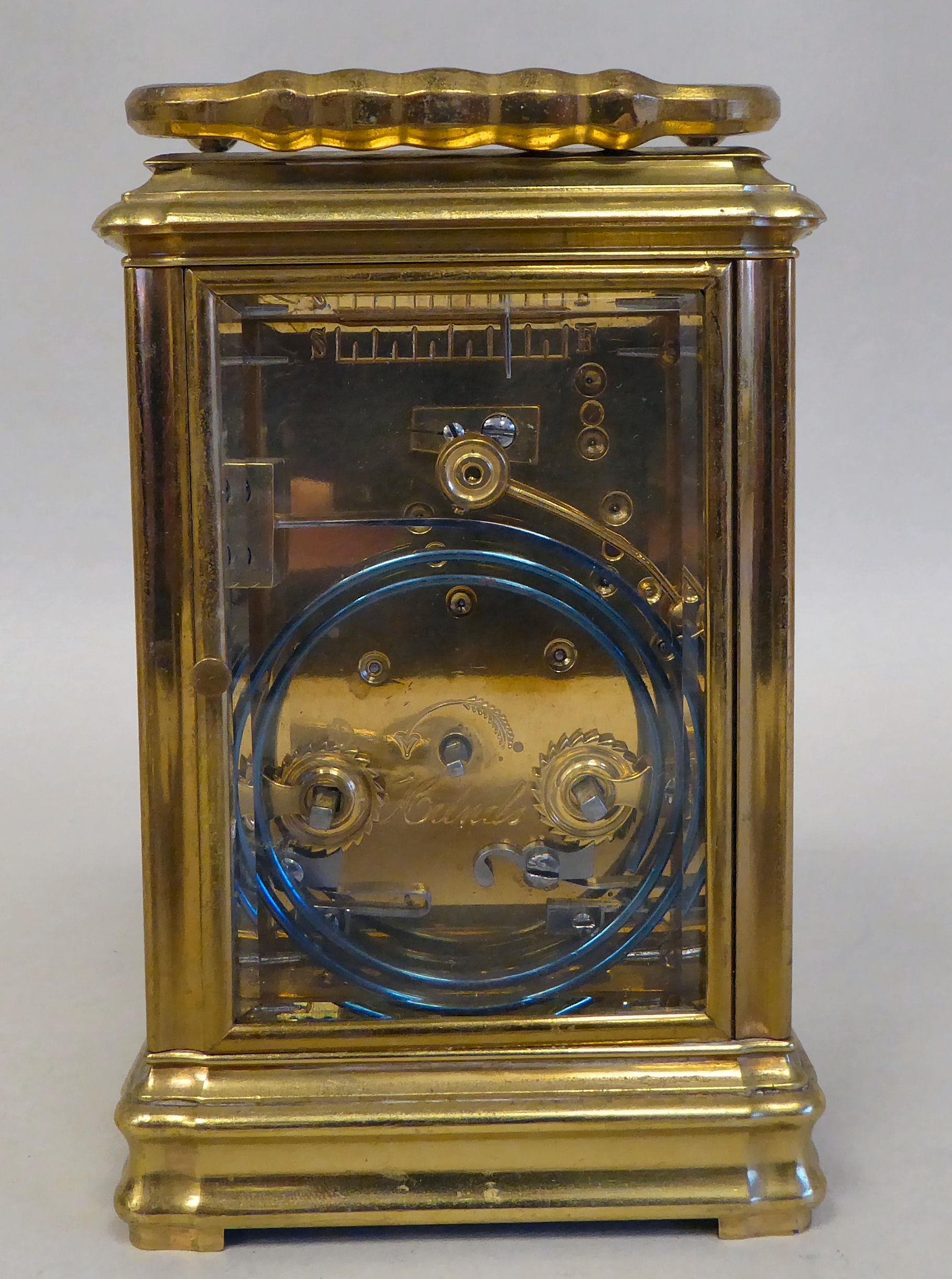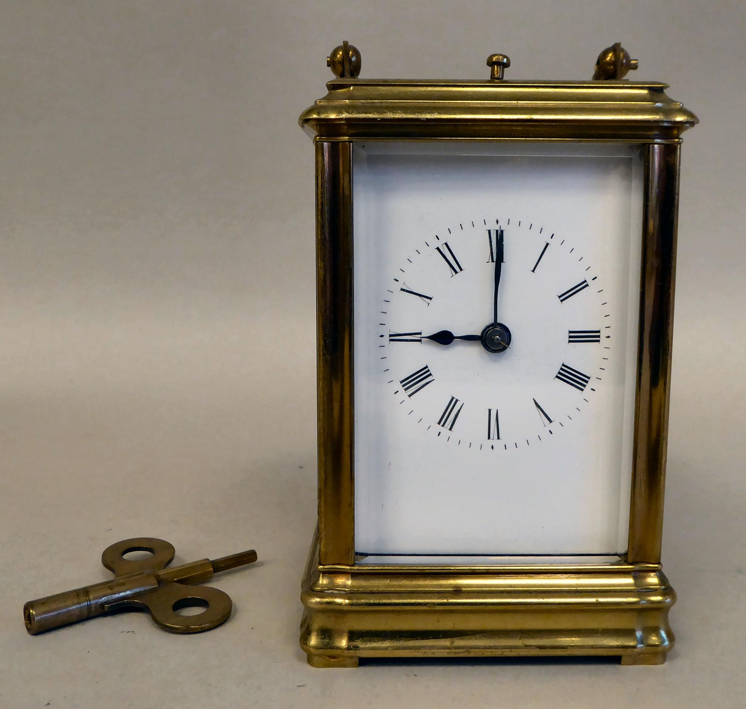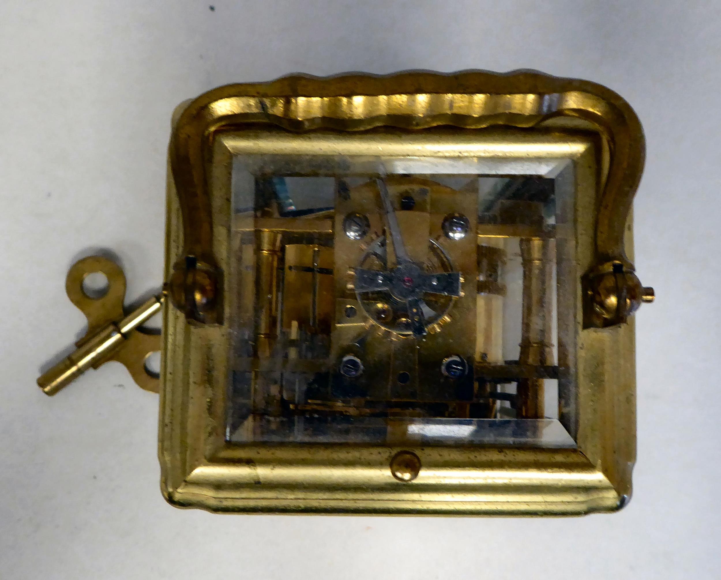 A lacquered brass travel clock with bevelled glass panels; the gong strike movement faced by an enamelled Roman dial 5"h