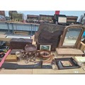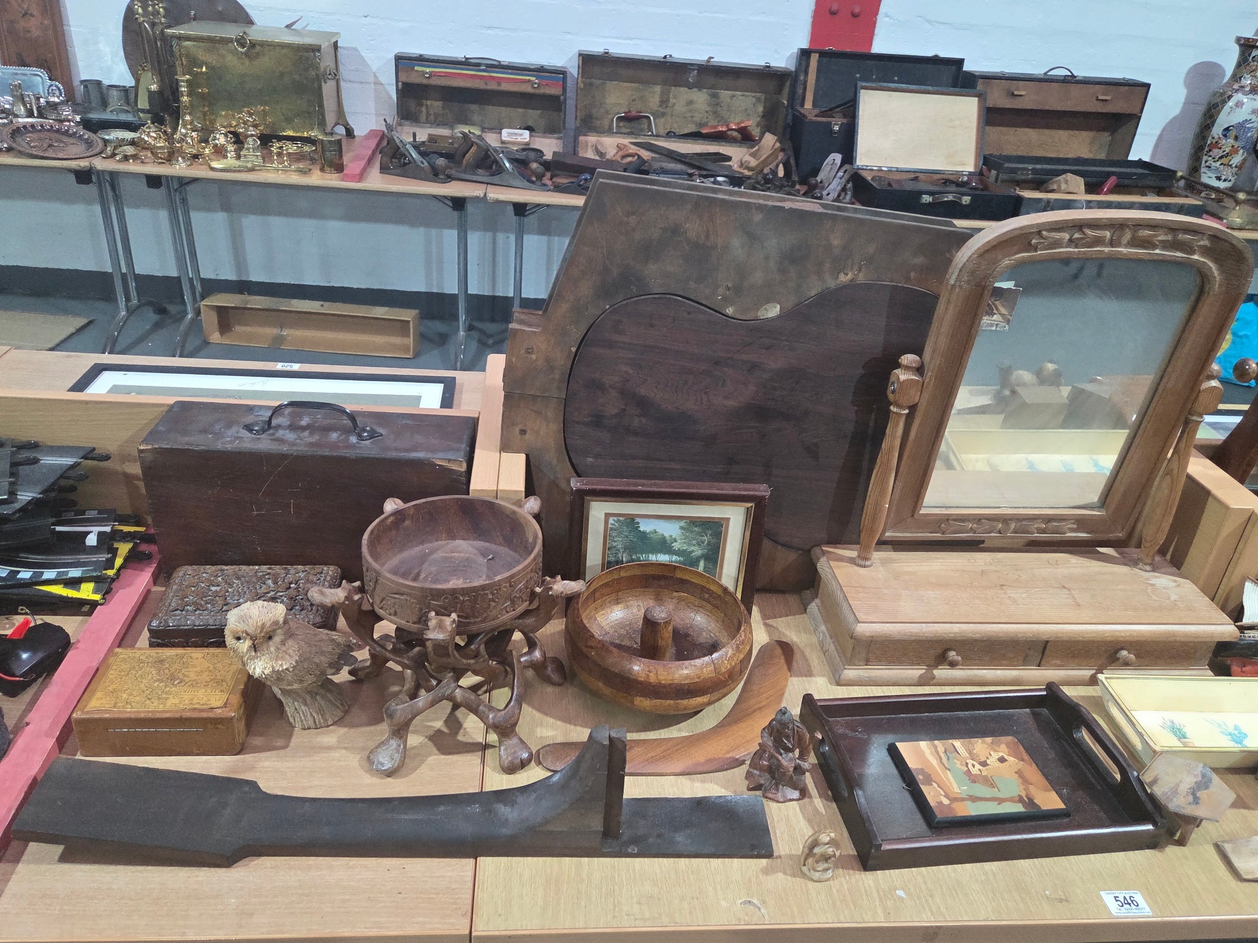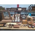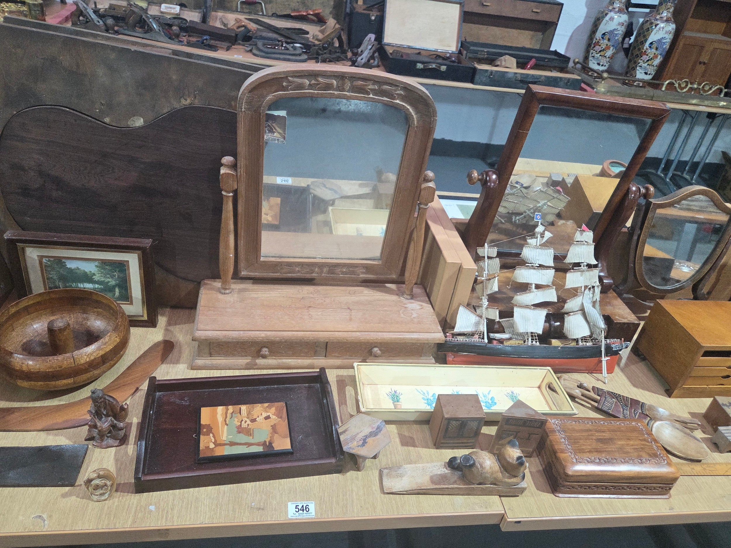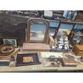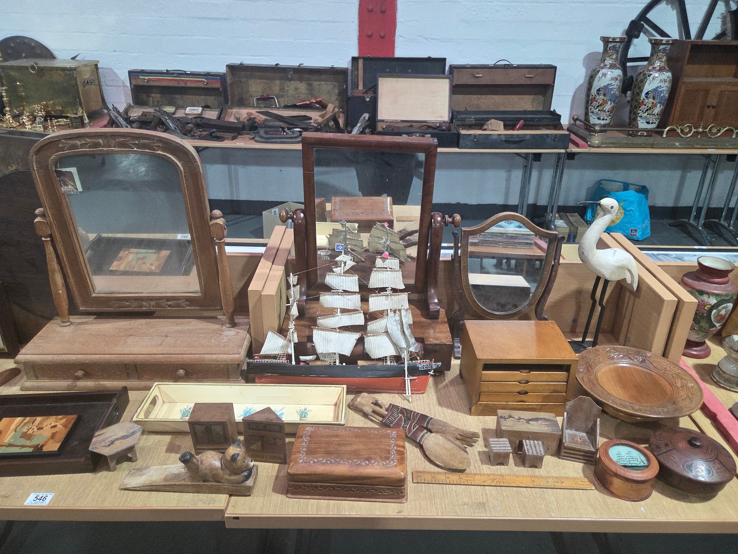 Three dressing table mirrors, wooden boxes, bowls, model yacht etc