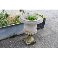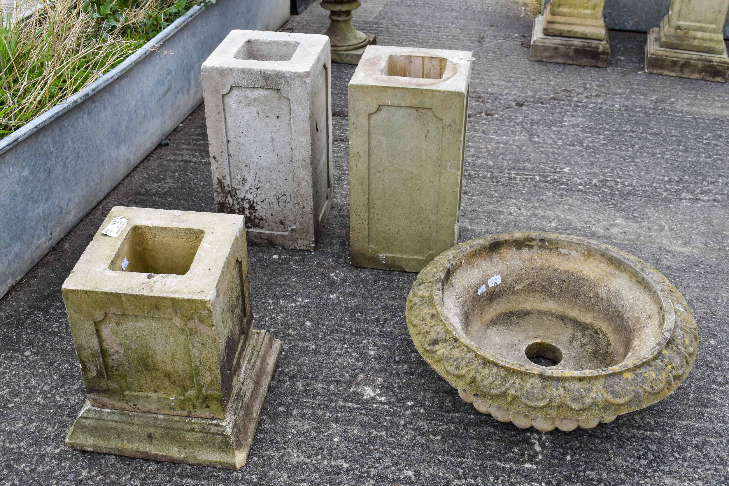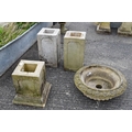 Three square reconstituted stone garden pedestals and a shallow basin. The largest plinth H53cm x W28cm, the basin with a central hole, diameter 65cm.