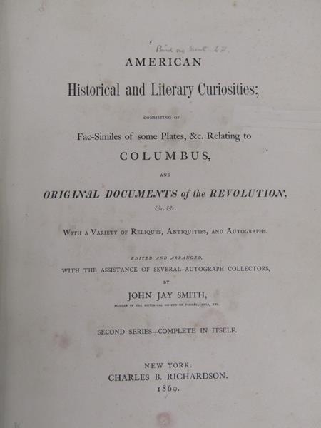 A book - American Historical and Literary Curiosities relating to Columbus and original documents of the Revolution, edited and arranged with the assistance of several autograph collectors by John Jay Smith being the 2nd series - complete in itself. Published in New York by Charles B Richardson 1860, with linen and leather red coloured boards and spine, in good order.