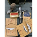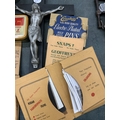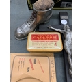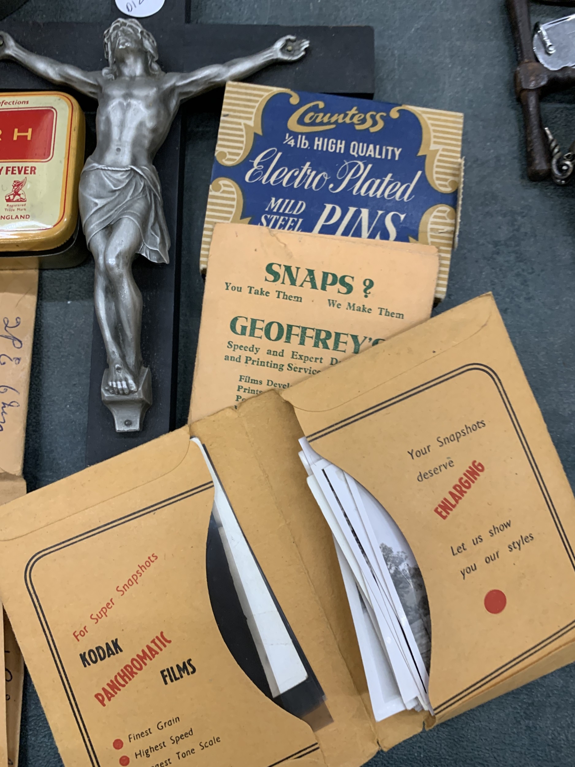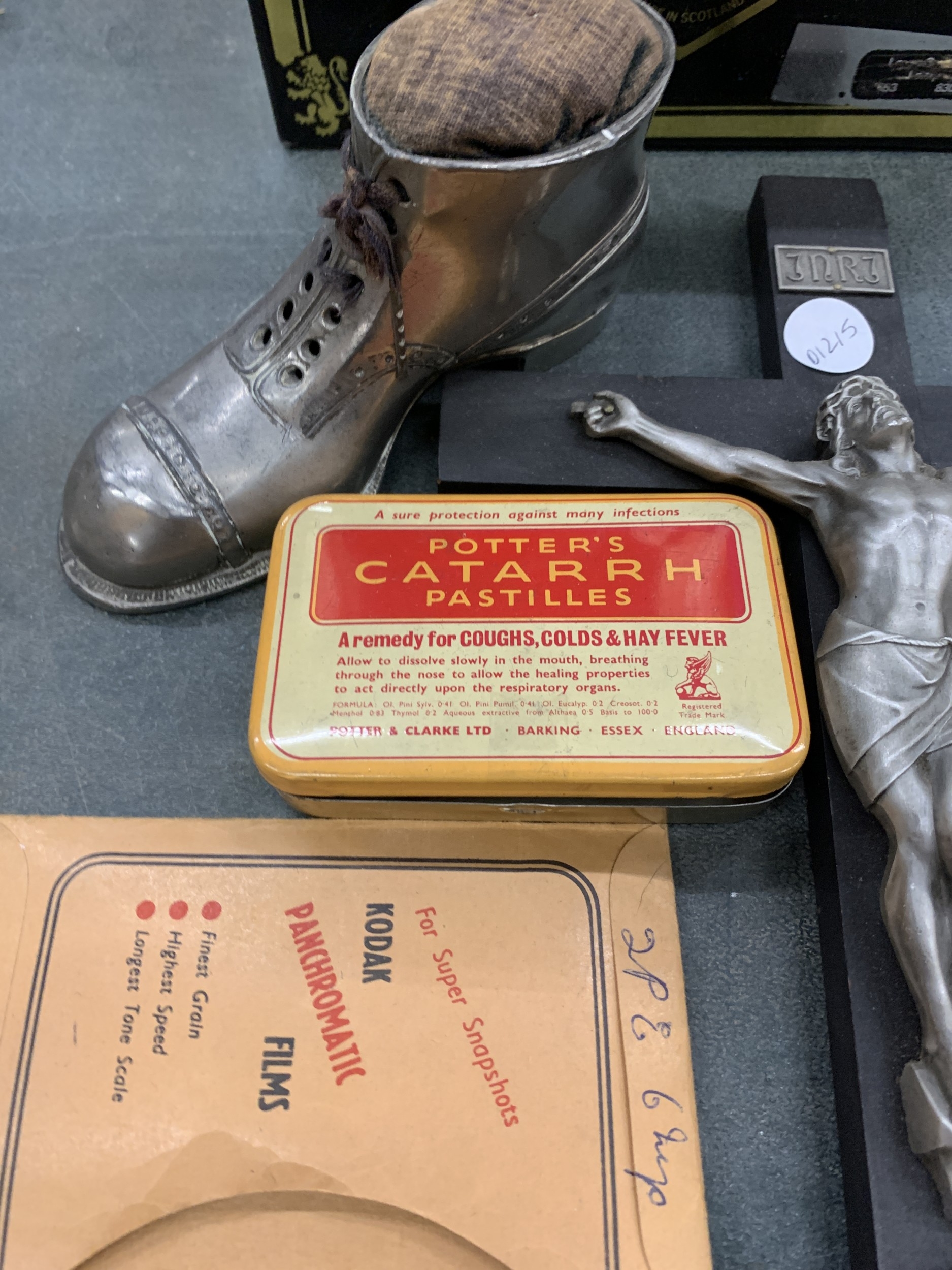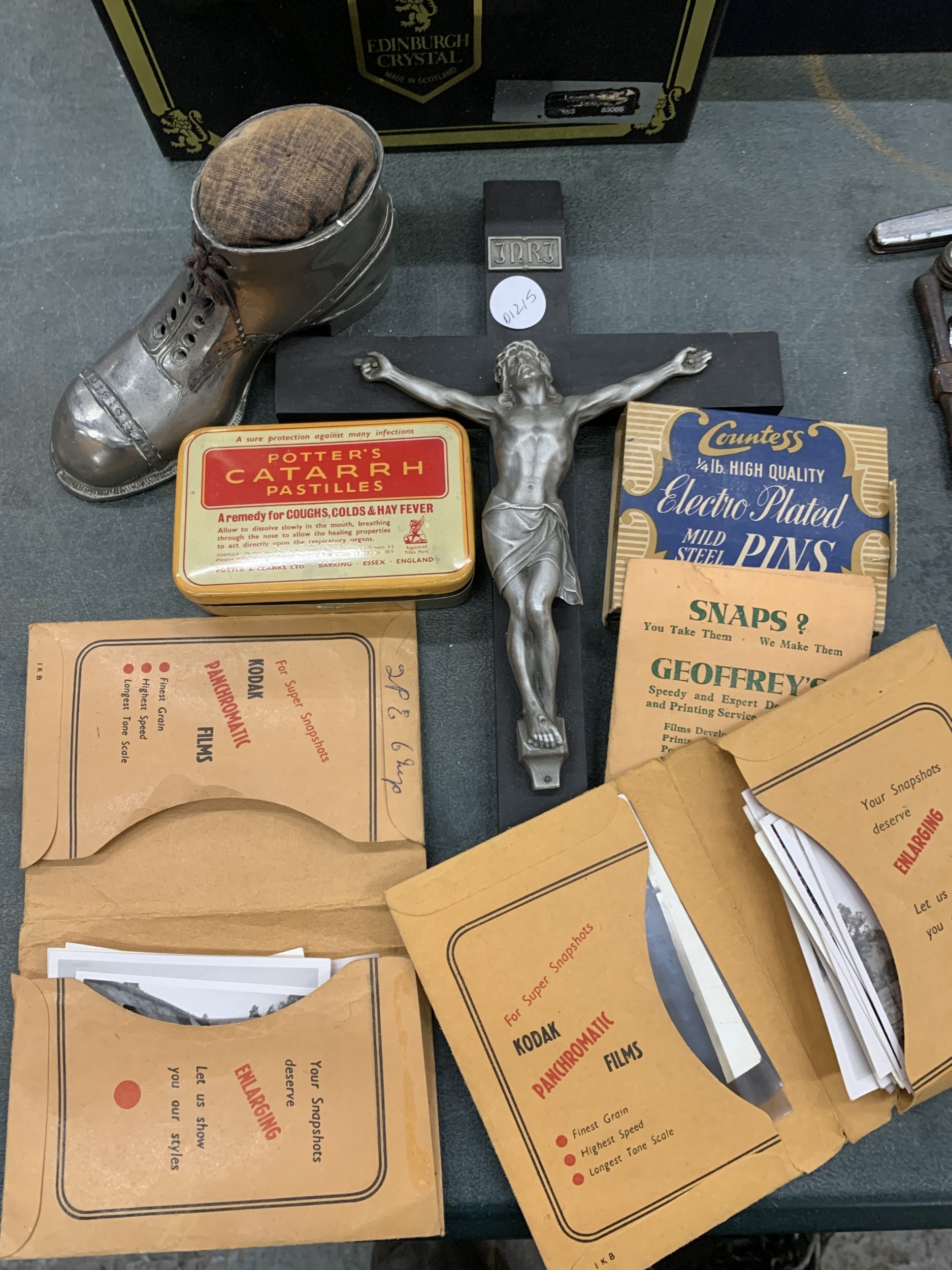 A METAL BOOT PIN CUSHION, CRUCIFIX, VINTAGE POTTER'S CATARRH PASTILES TIN, BLACK & WHITE AND SEPIA VINTAGE PHOTOGRAPHS DEPICTING HOLIDAY AND LEISURE SCENES