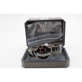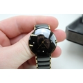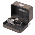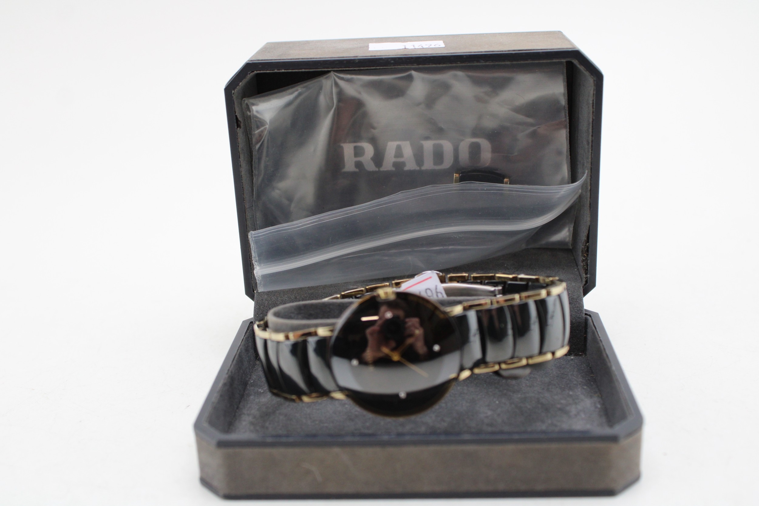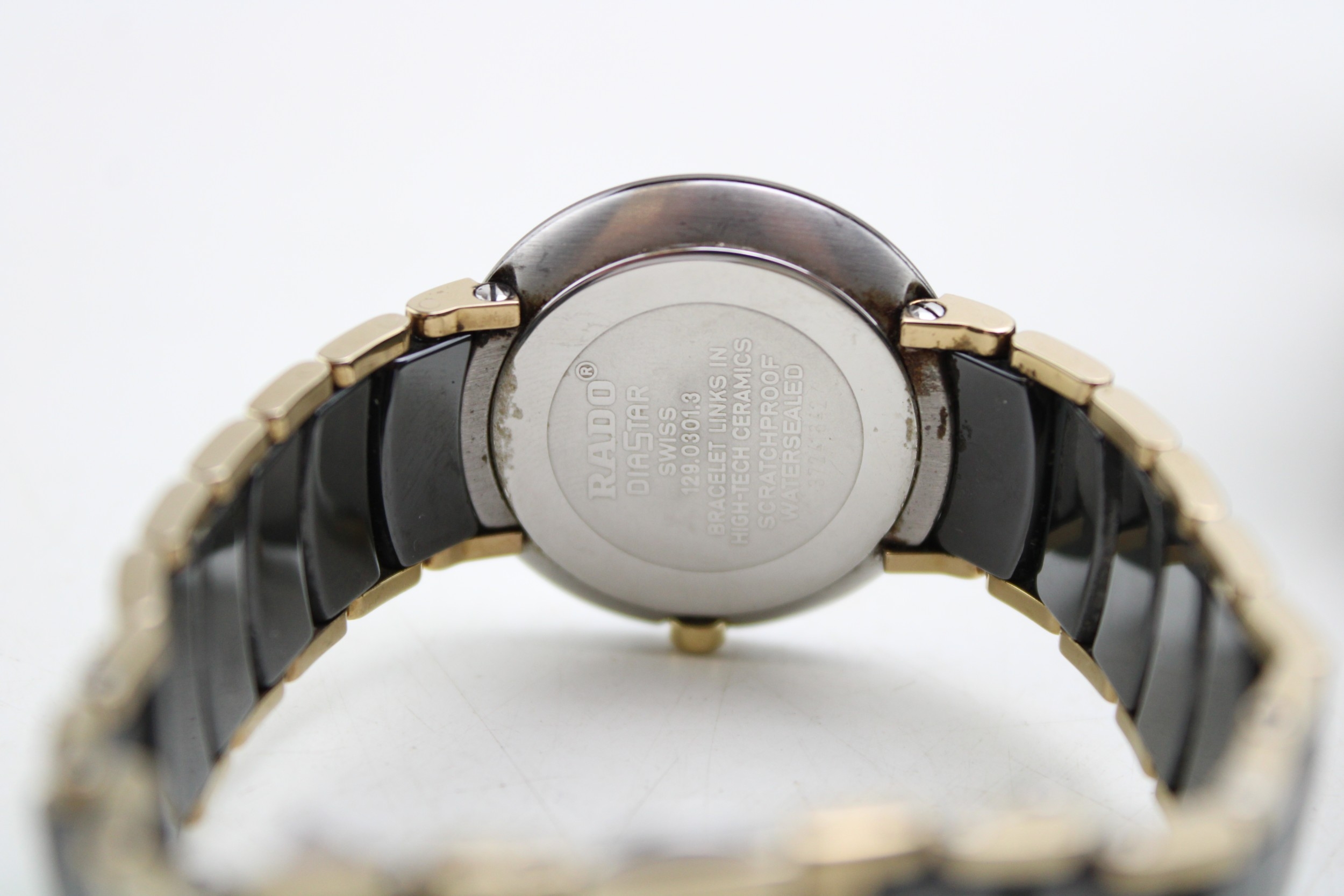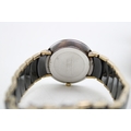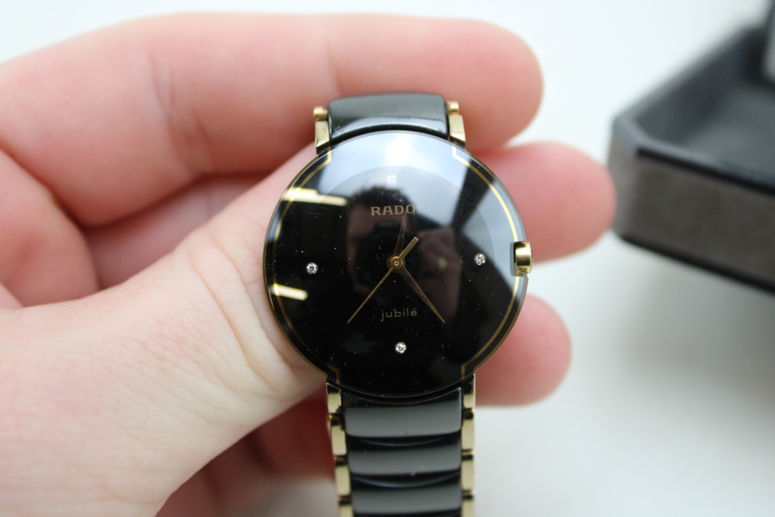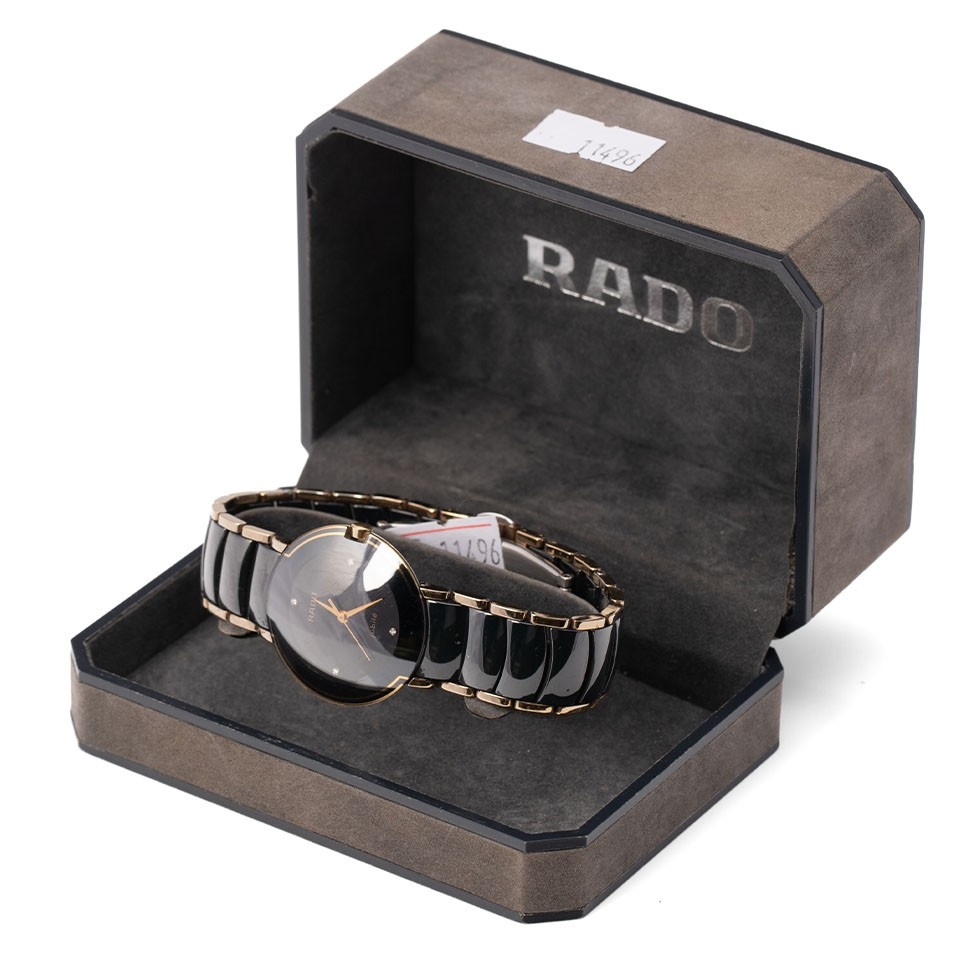 A lady's Rado Jubile dress watch, the signed black circular dial with diamond quarter markers, pencil hands, back of case signed and marked 'Rado, Diastar, Swiss, 129.0301.3, Bracelet links in high-tech ceramics, Scratchproof, Watersealed, numbered 37241642, with original gold plated ceramic bracelet strap, box and spare link.