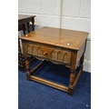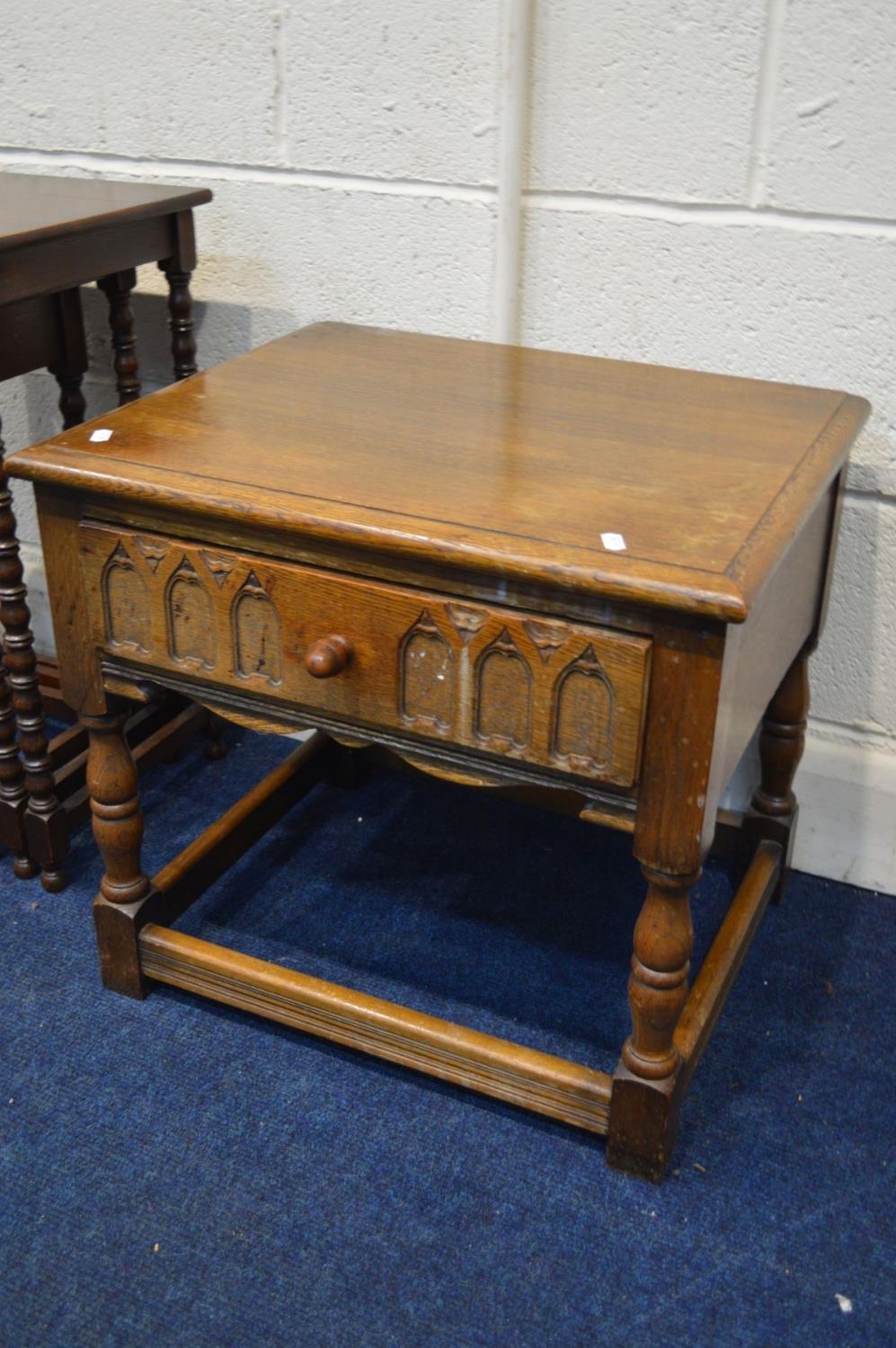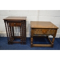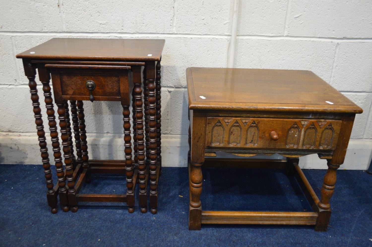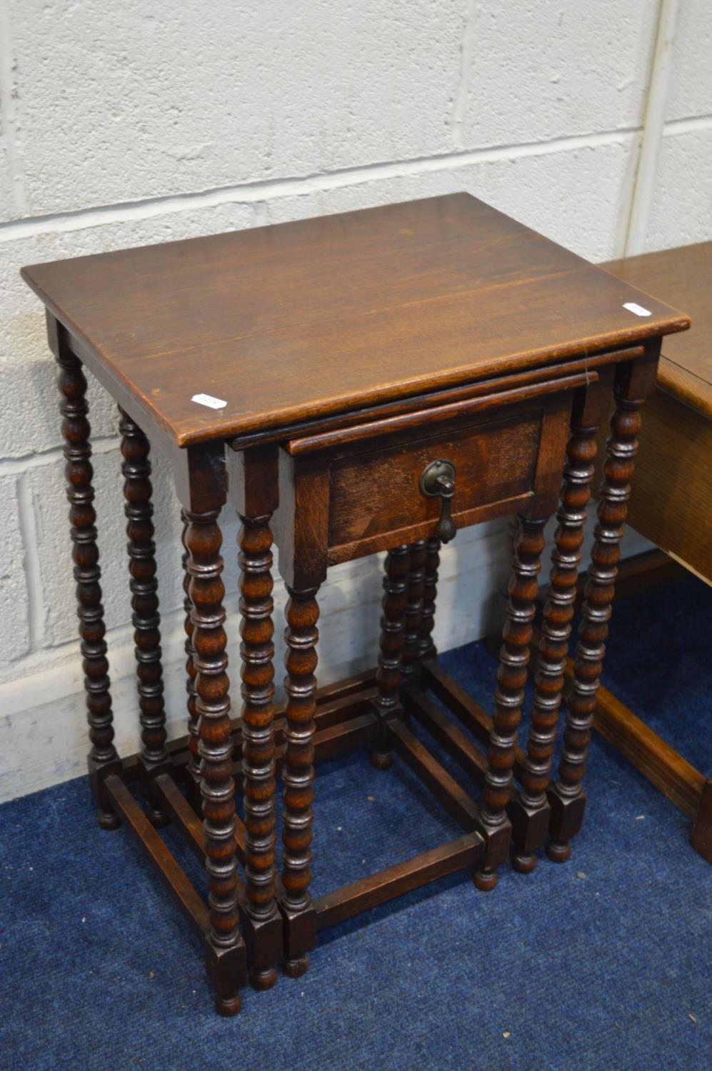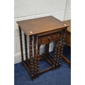 A MID 20TH CENTURY OAK NEST OF THREE TABLES with a single drawer on bobbin turned supports together with a modern oak lamp table with a single drawer (2)