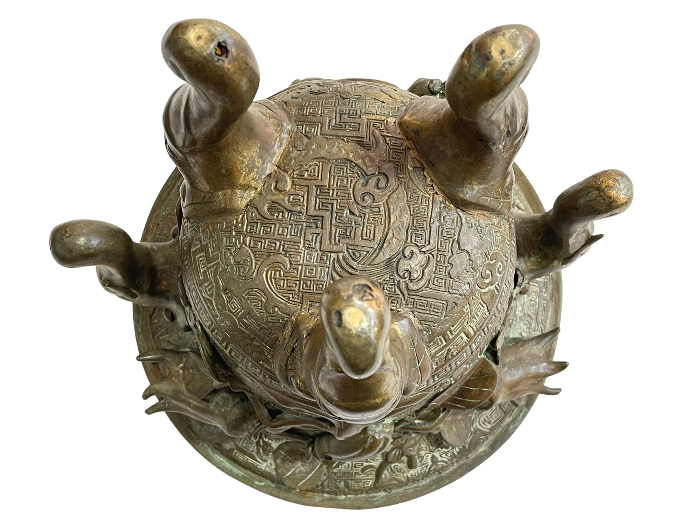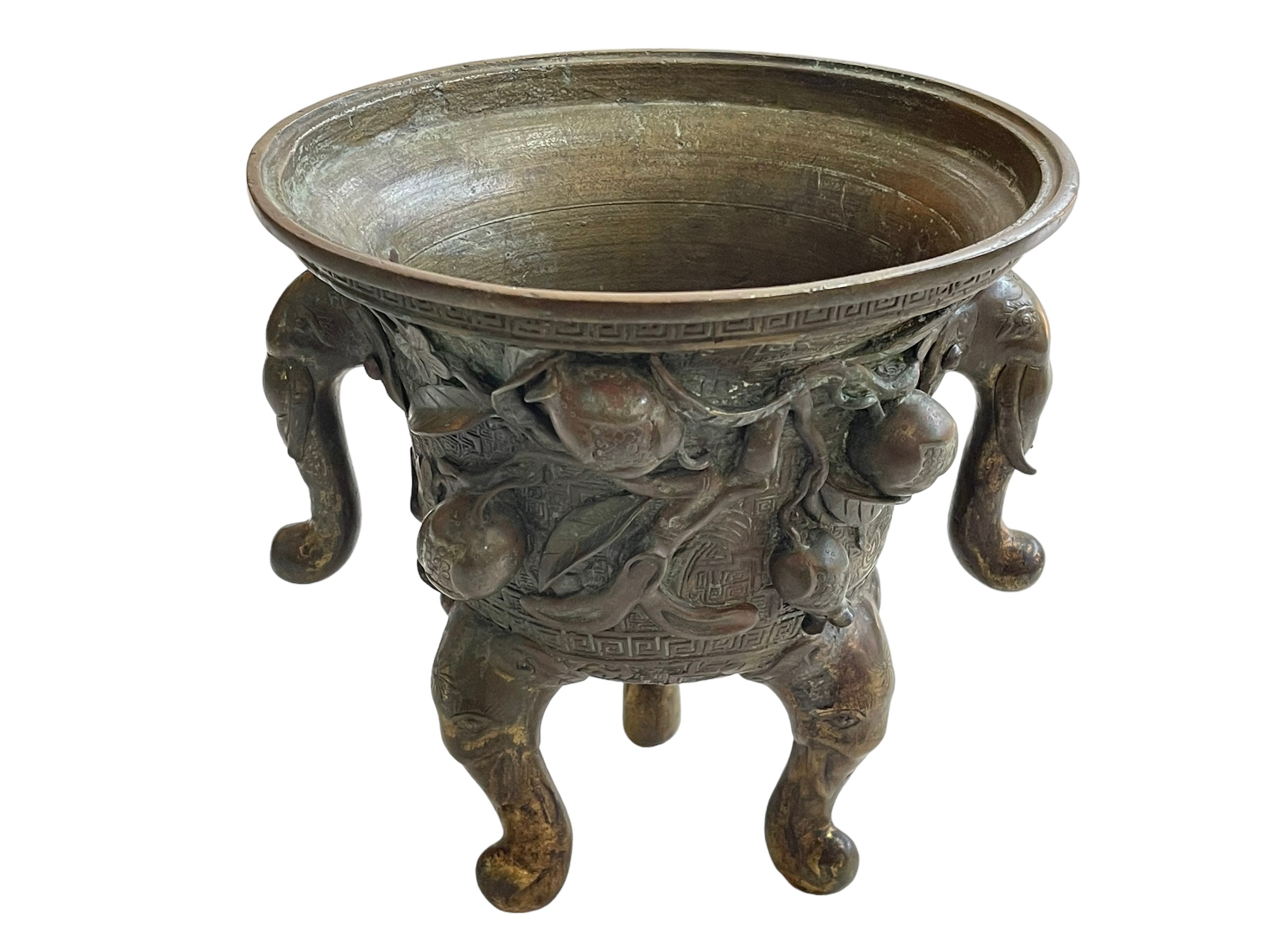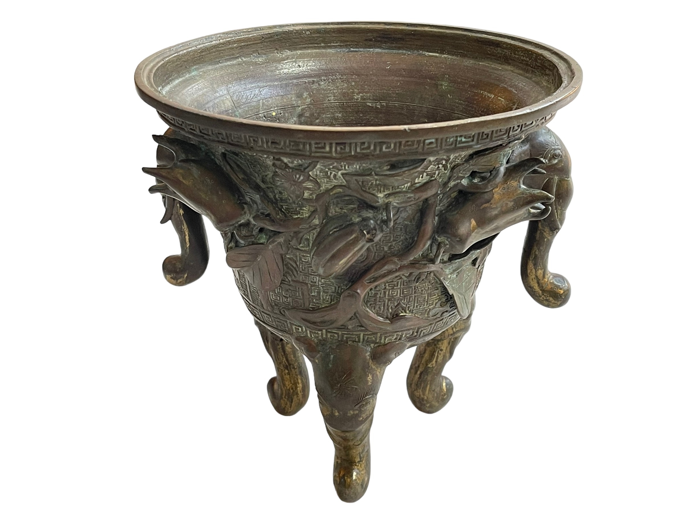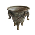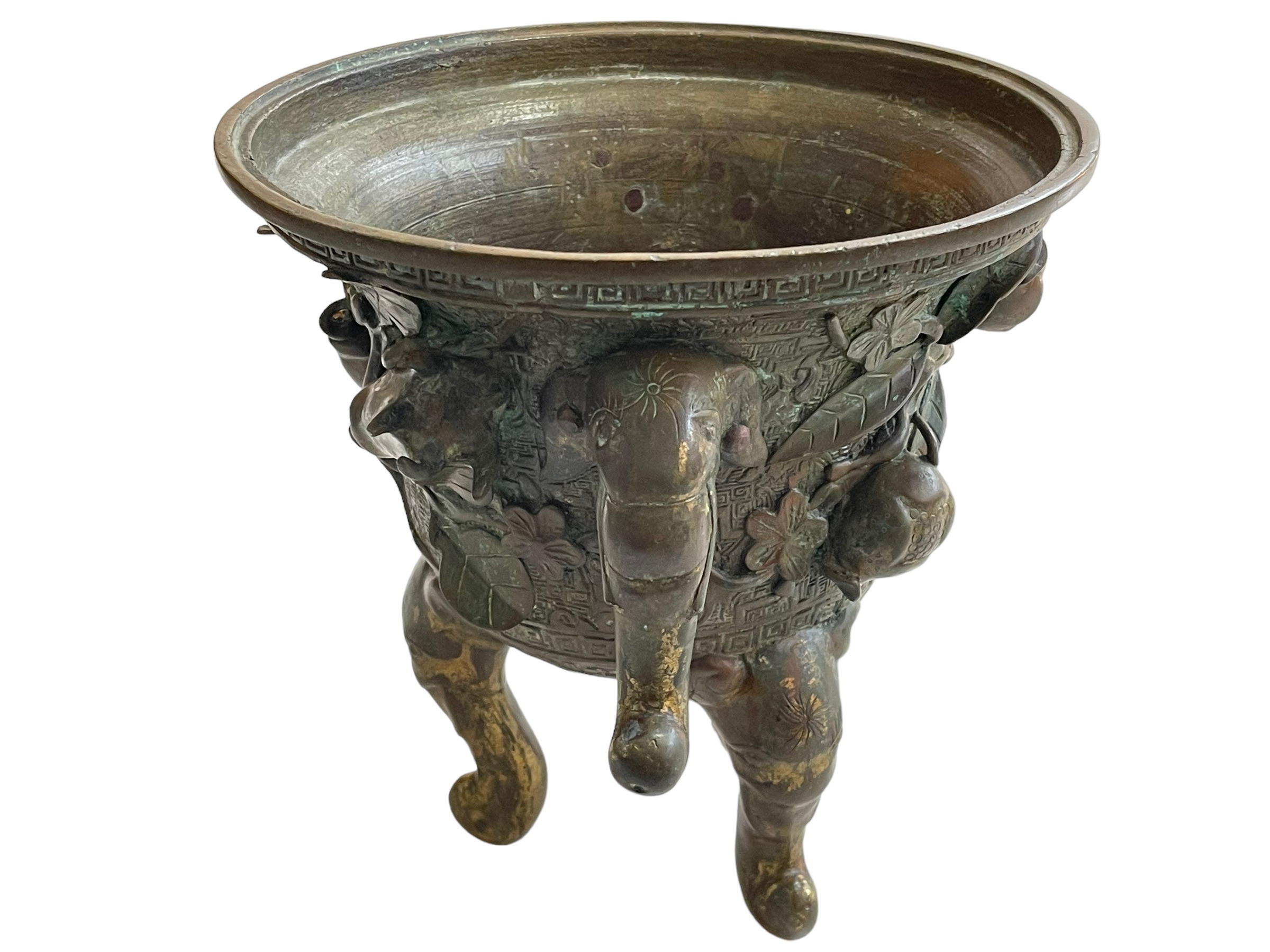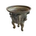 Antique Chinese/Eastern bronze three footed vase decorated with elephant and floral design, 24cm.