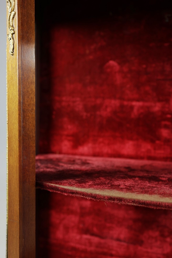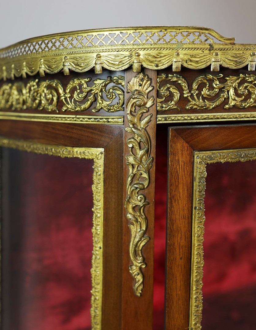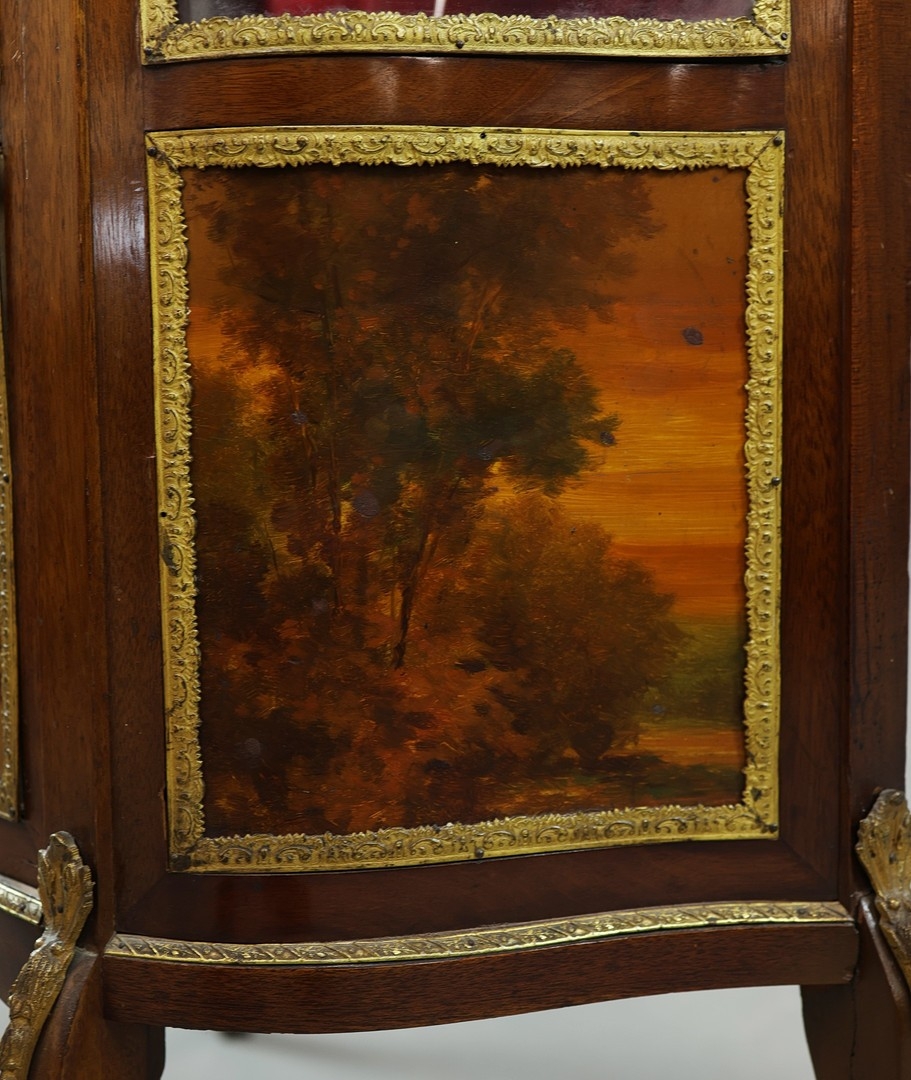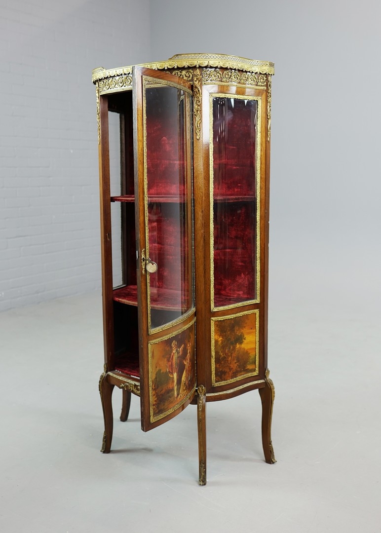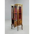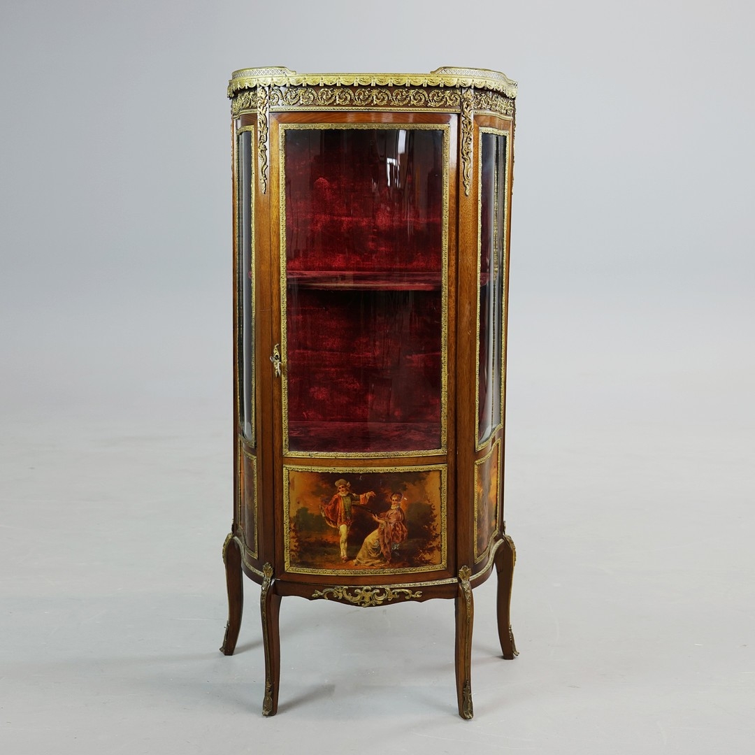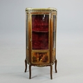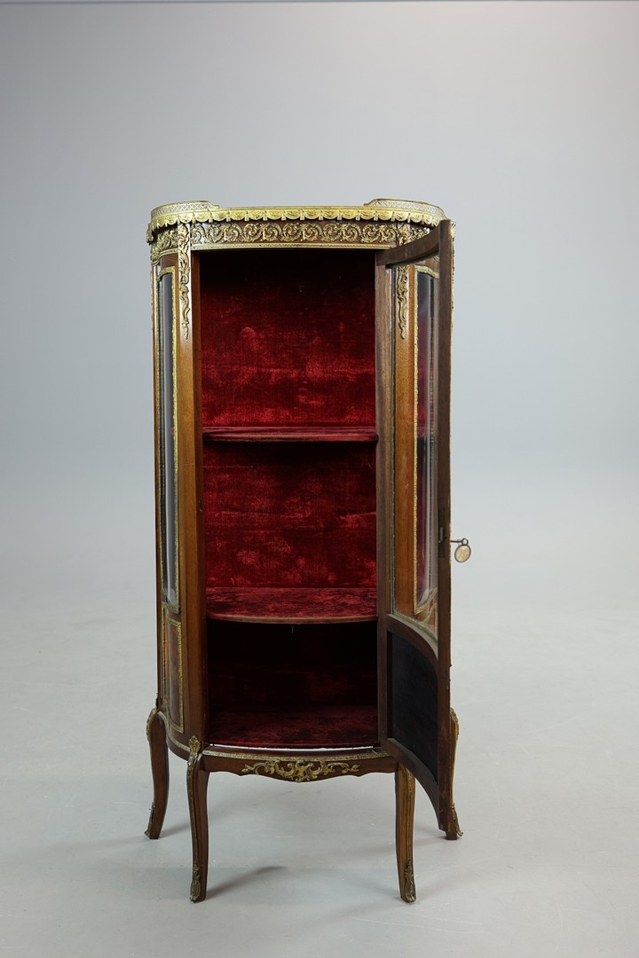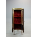 FRENCH MAHOGANY, PAINTED AND GILT METAL MOUNTED VITRINE. circa 1900, with marble top and bowed glazed door, 140cm H x 67cm W x 33cm D.