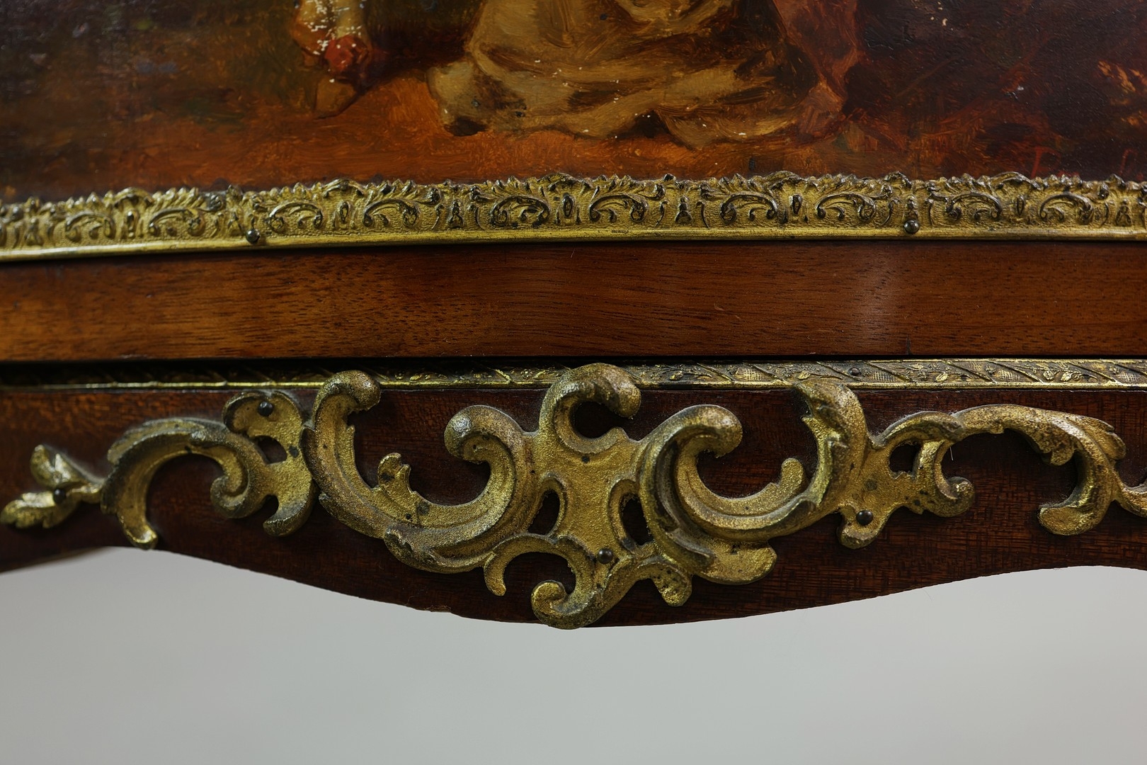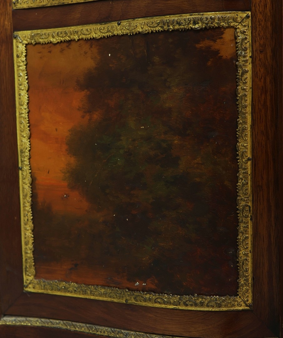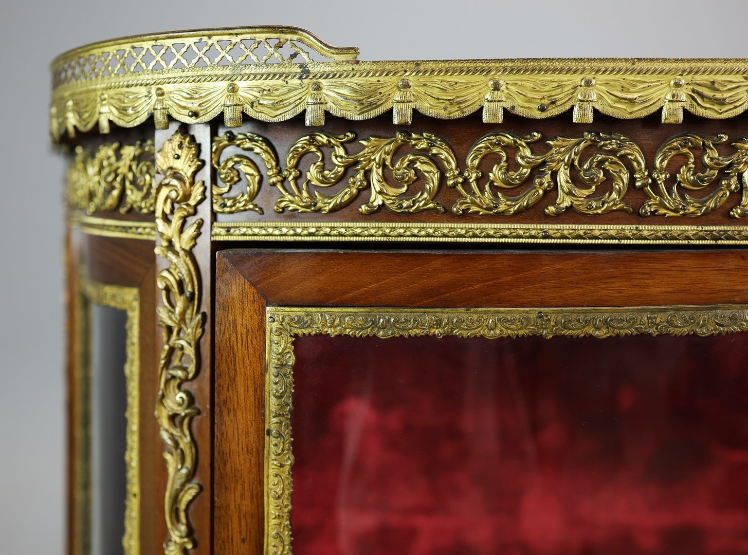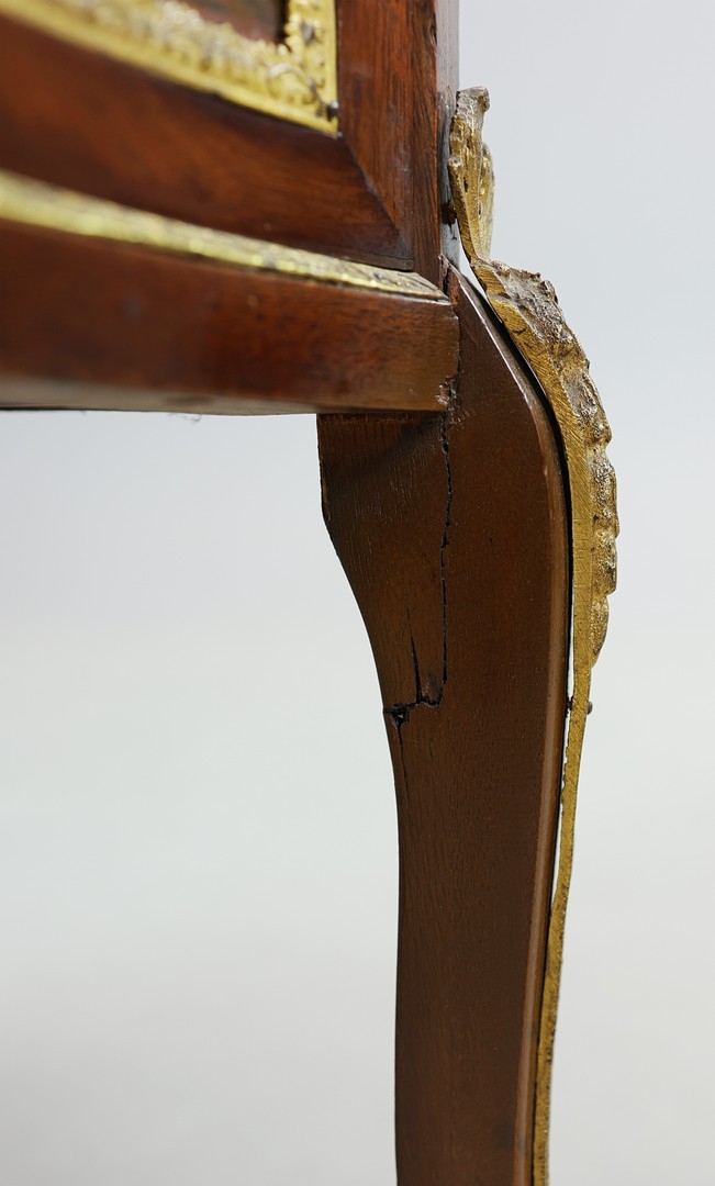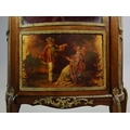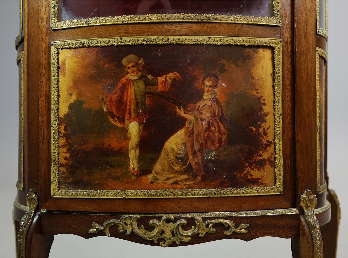 FRENCH MAHOGANY, PAINTED AND GILT METAL MOUNTED VITRINE. circa 1900, with marble top and bowed glazed door, 140cm H x 67cm W x 33cm D.