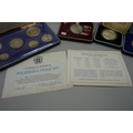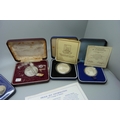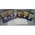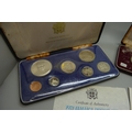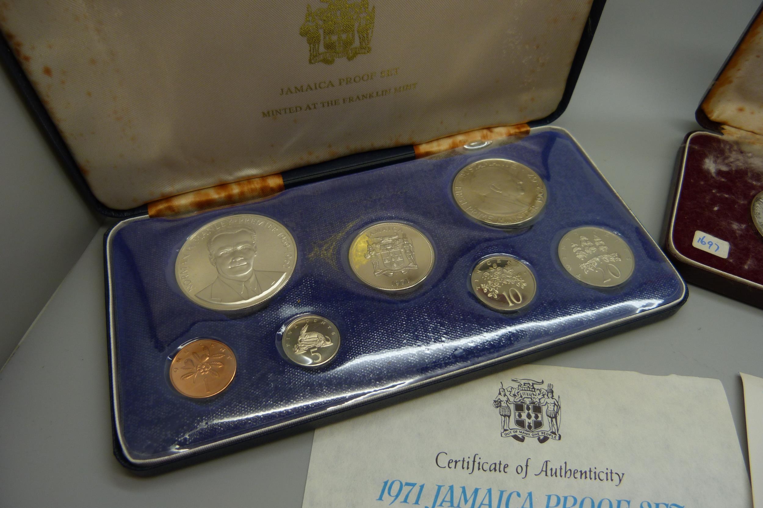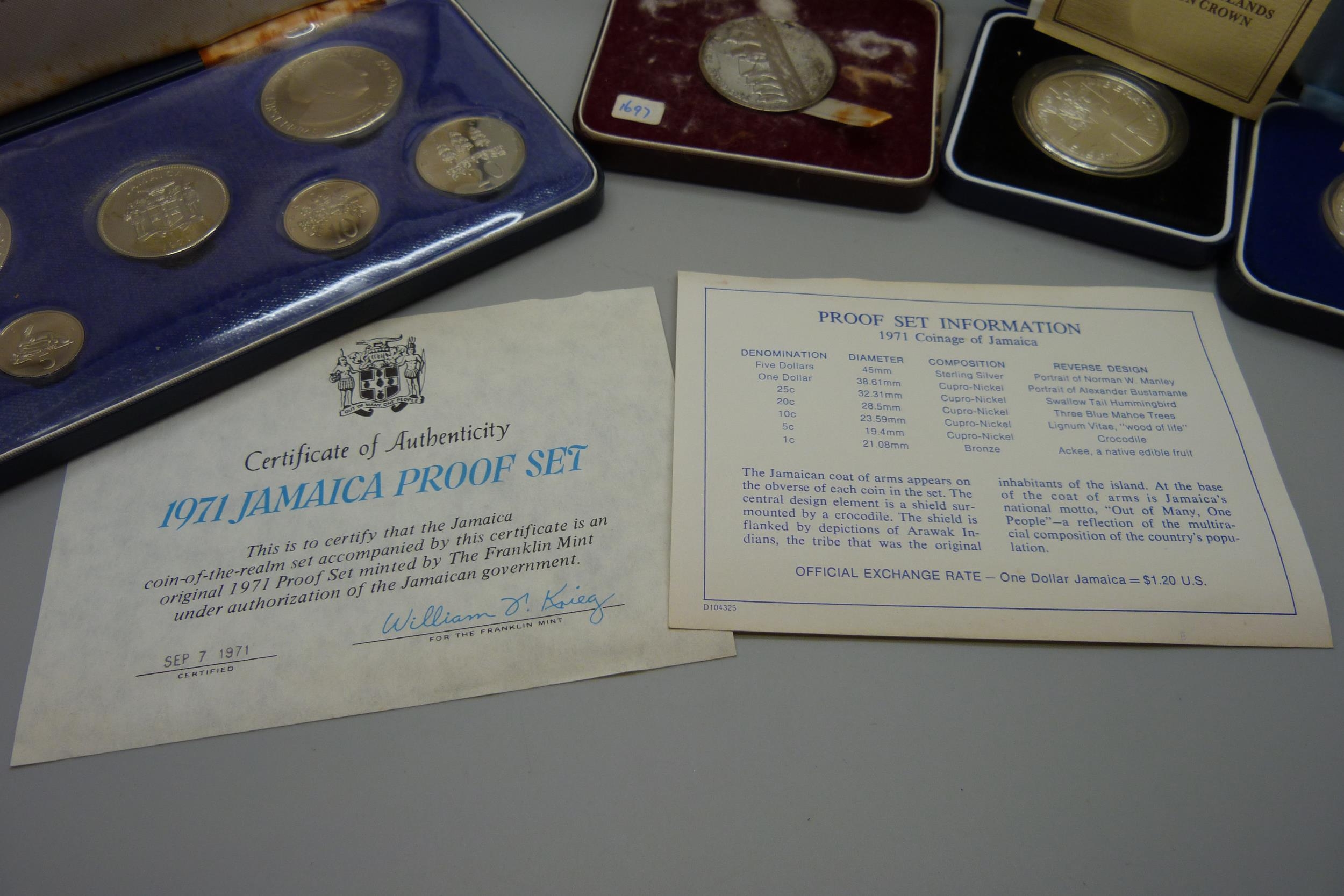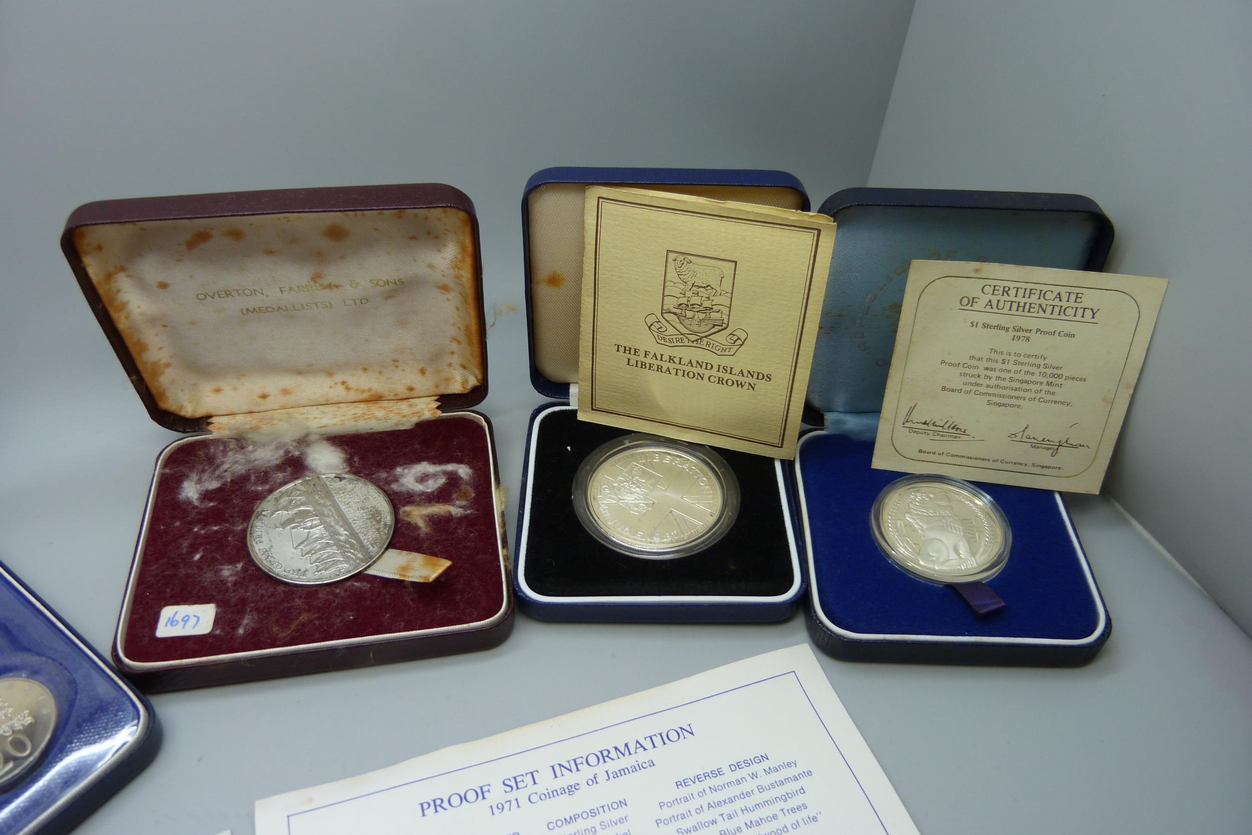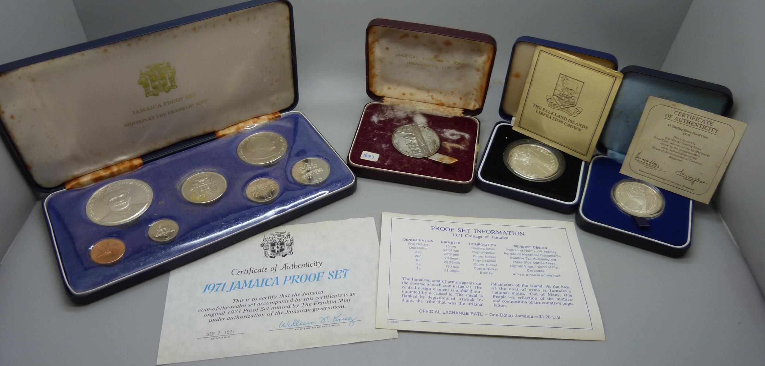 A 1971 Jamaica coin set with sterling silver $5, a Singapore sterling $1 coin, a Falkland Islands silver 50p and a medallion, cased