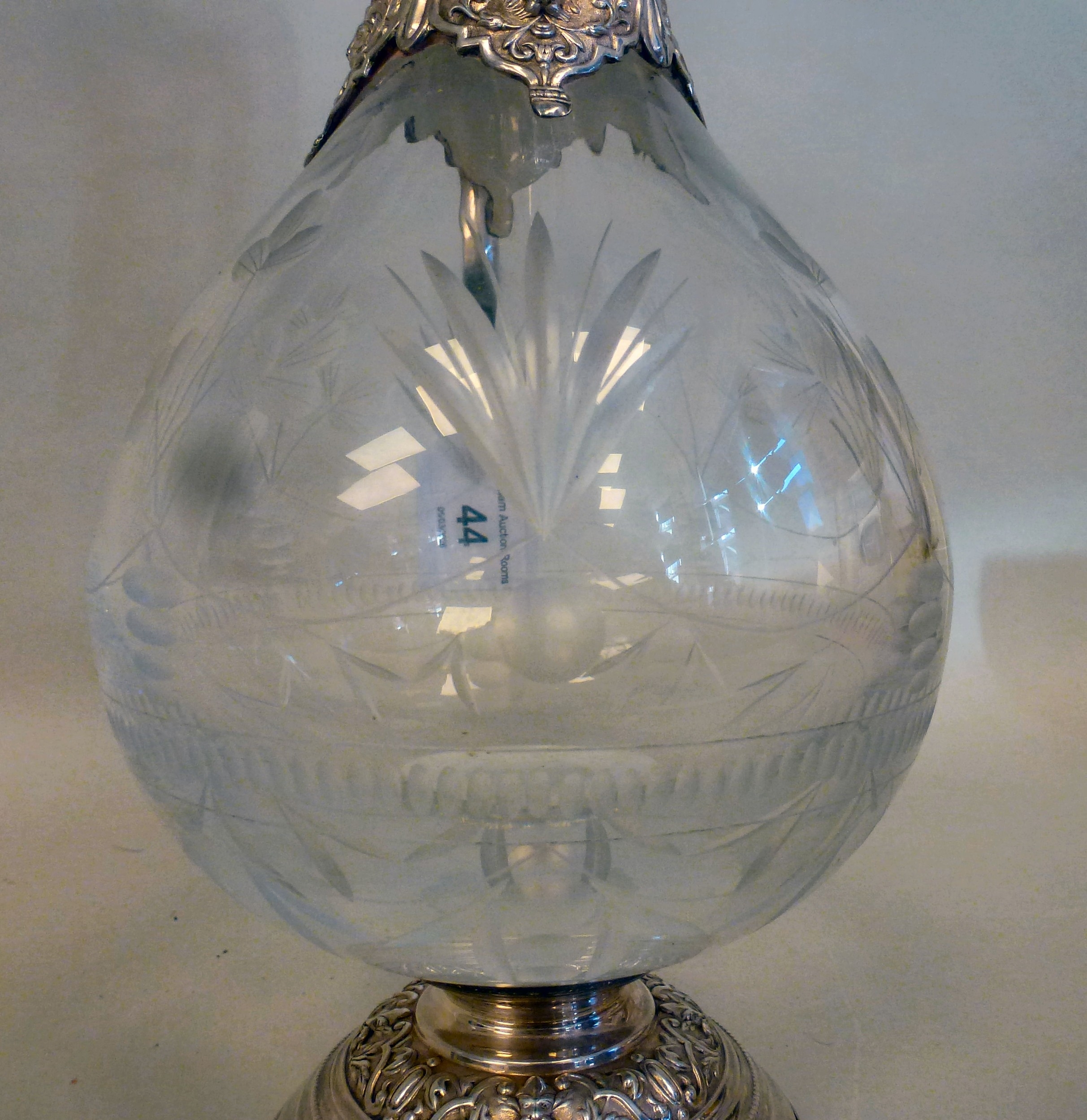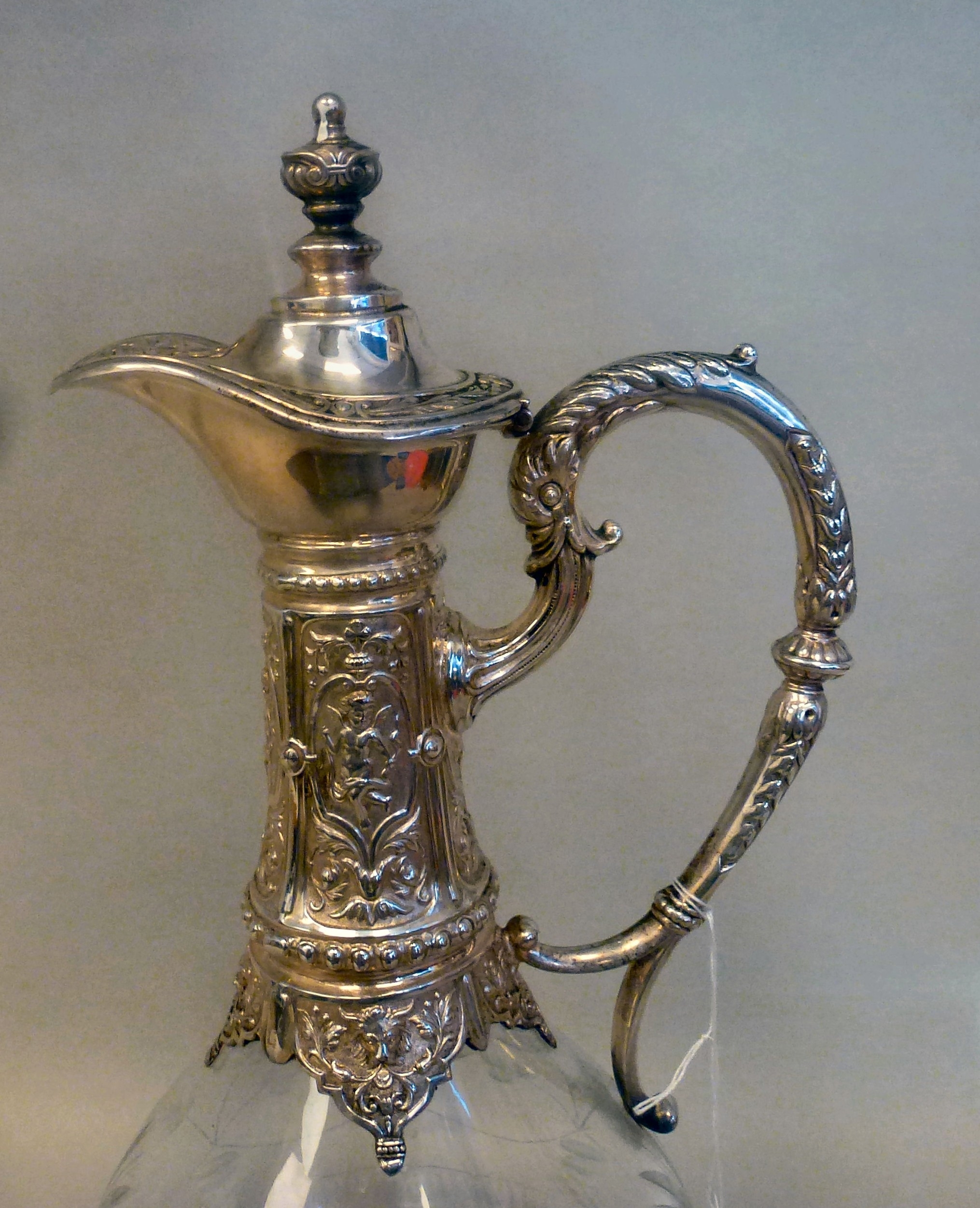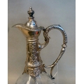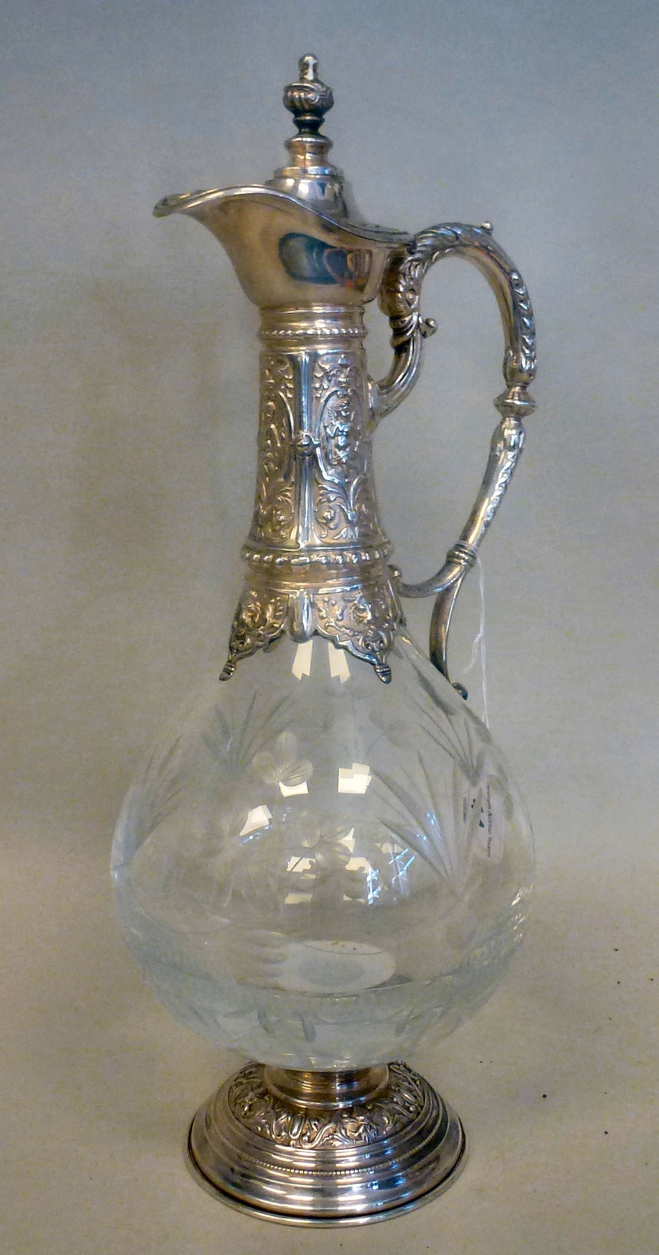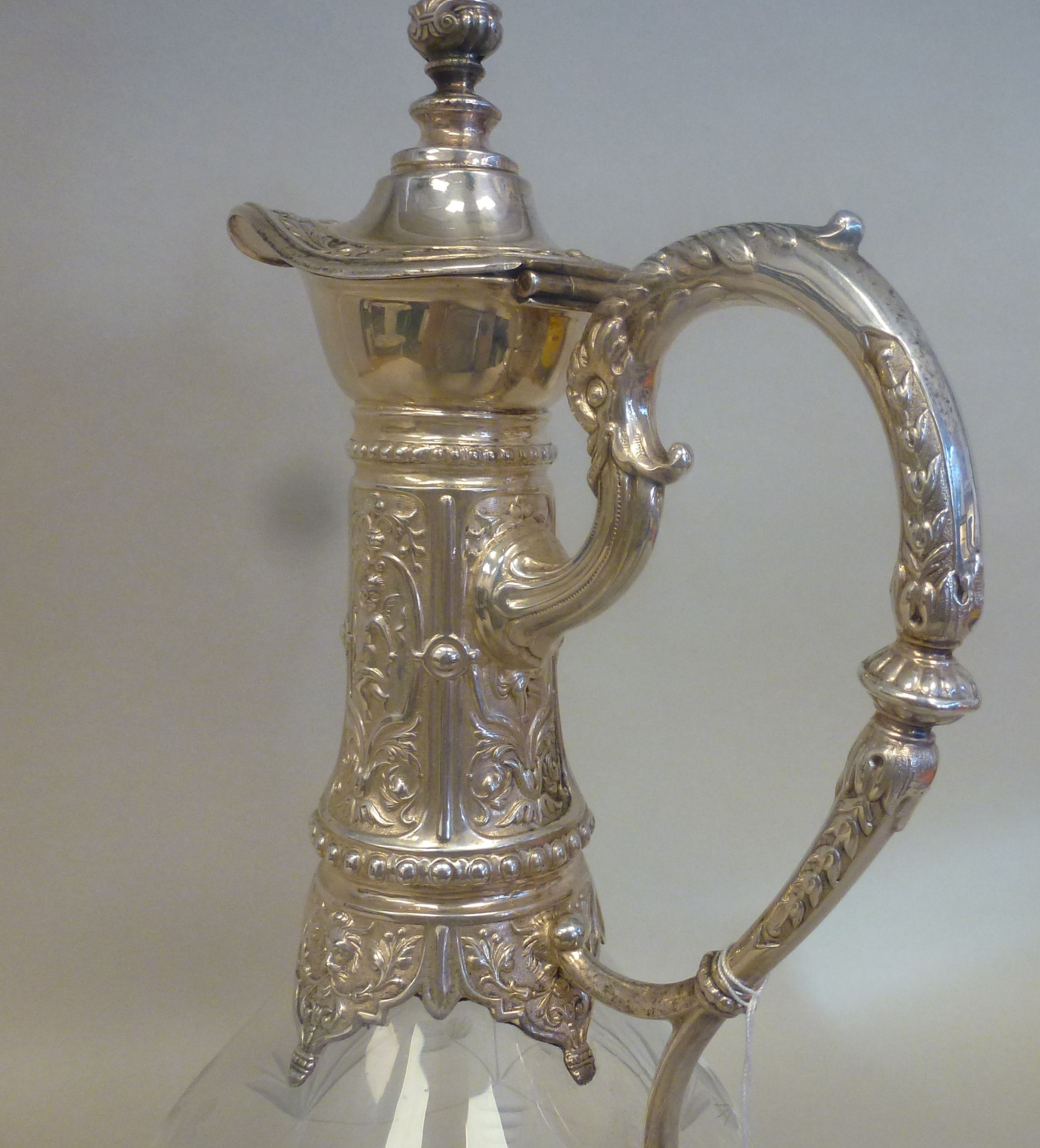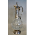 A mid 20thC glass and silver plated claret jug, embossed with cherubs and swags 14"h