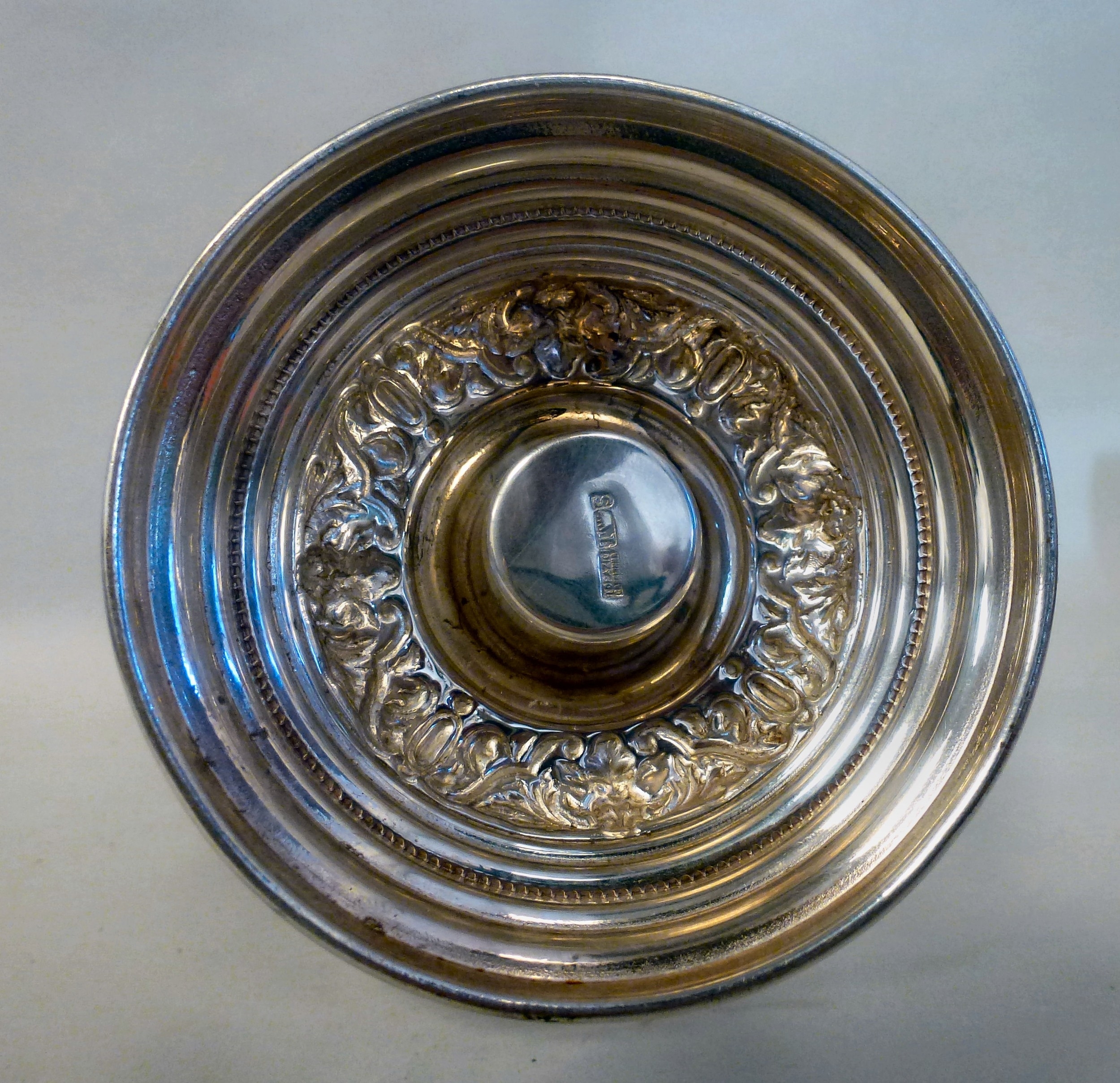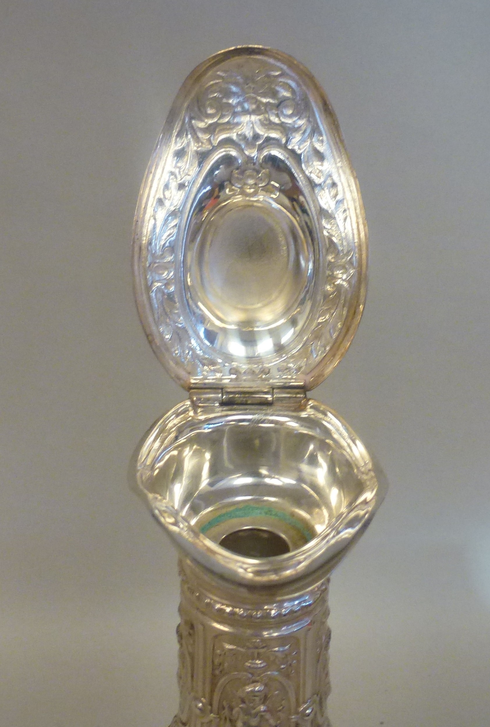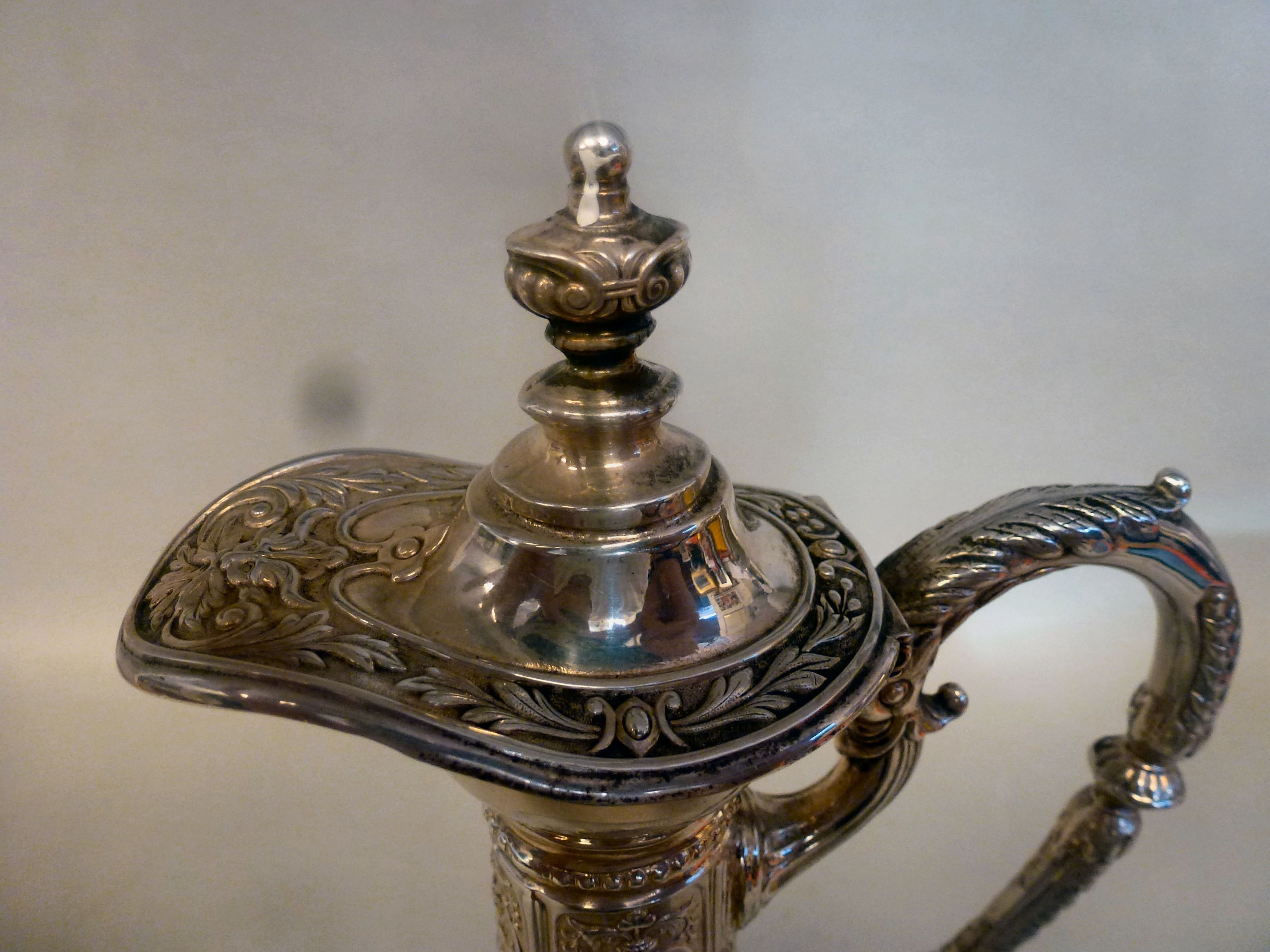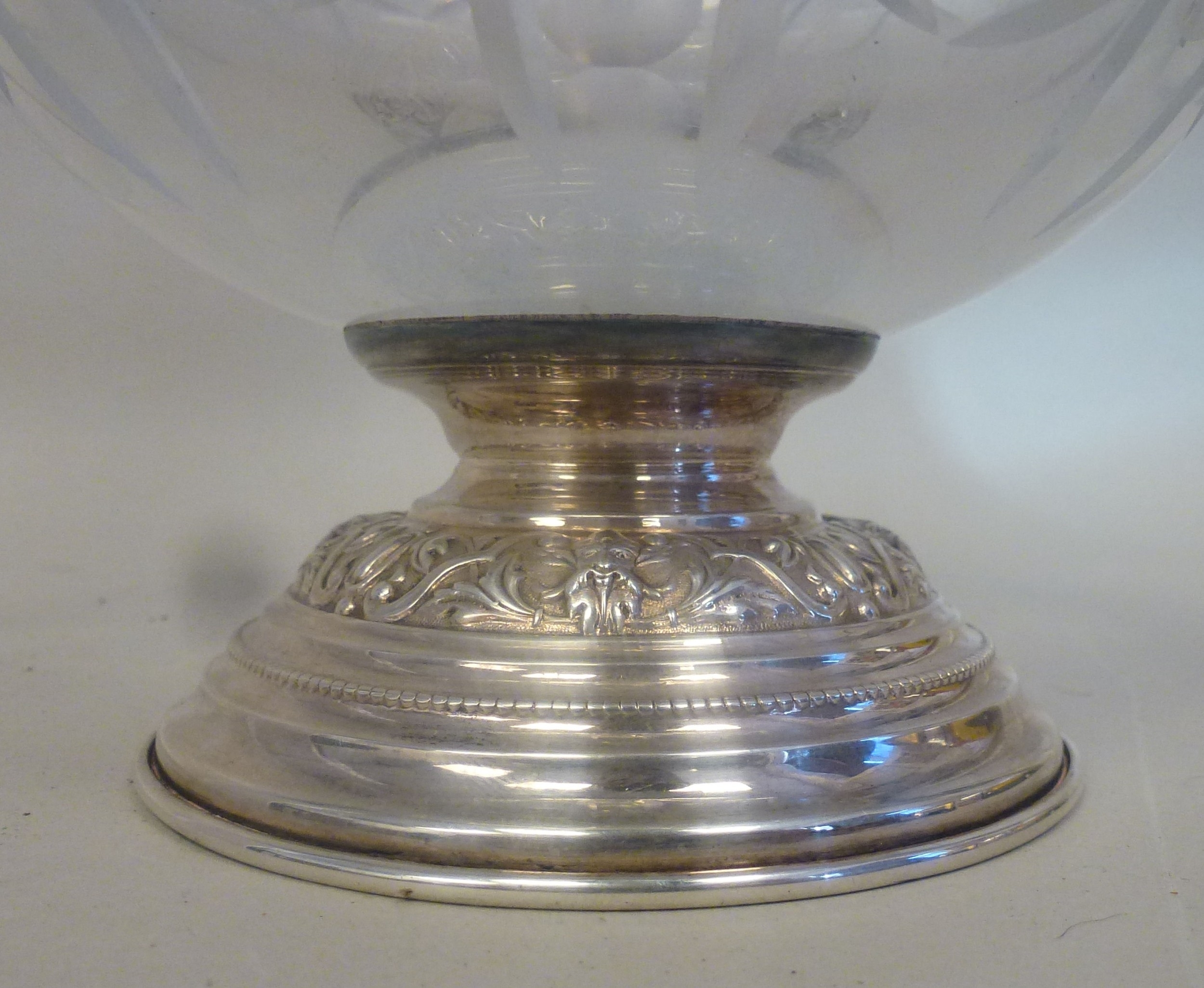 A mid 20thC glass and silver plated claret jug, embossed with cherubs and swags 14"h